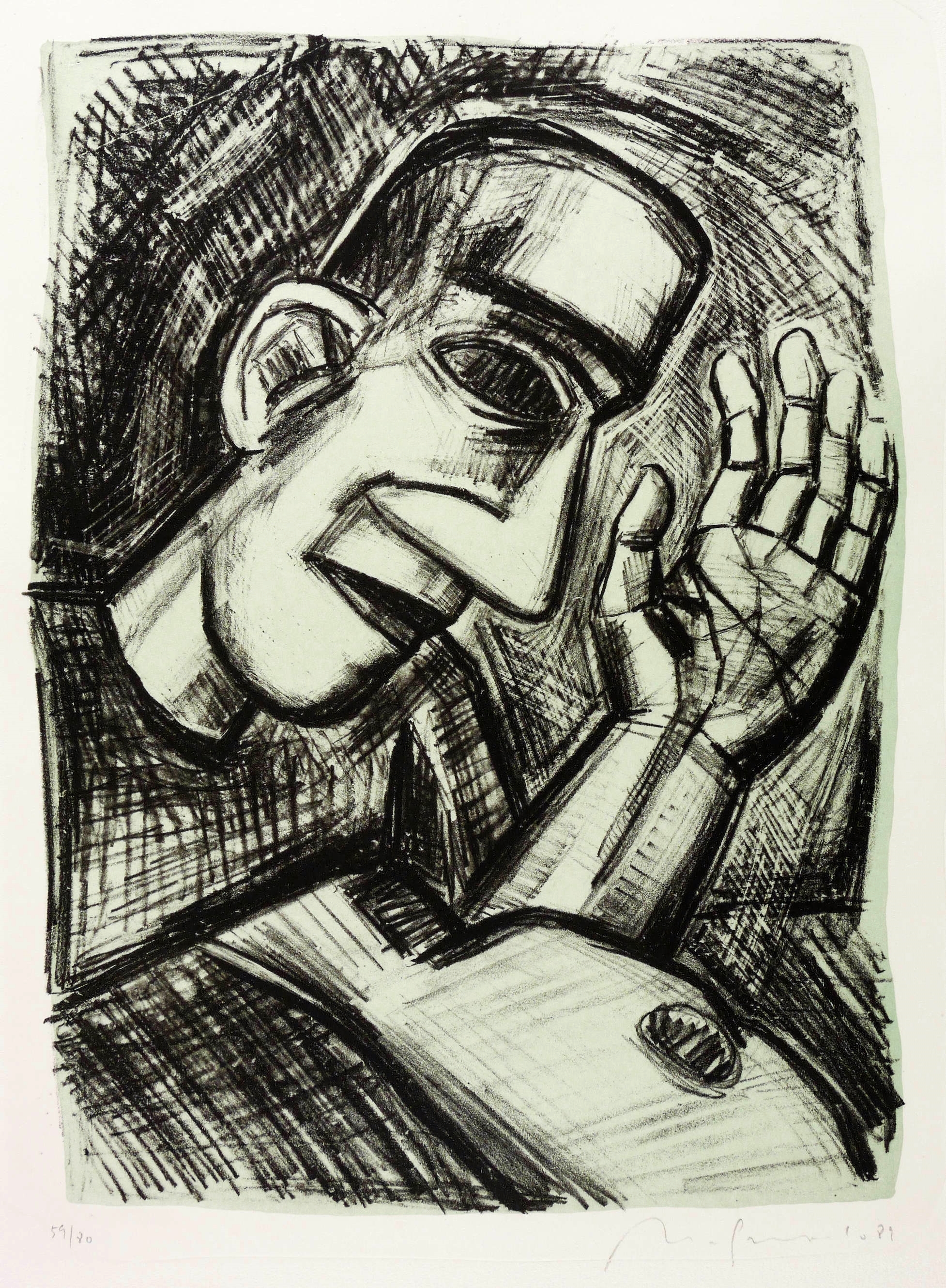 1989. Tonlithografie / Kreidelithografie, in Schwarz, über blau-grüner Tonplatte, auf Hahnemühle-Bütten. – Originale Künstlergrafik, von Nuria Quevedo. – Auflage Exemplar Nr. 59/80. – 39,5 x 29,0 cm (Darstellung / Druckbild), 54 x 40 cm (Blatt).
