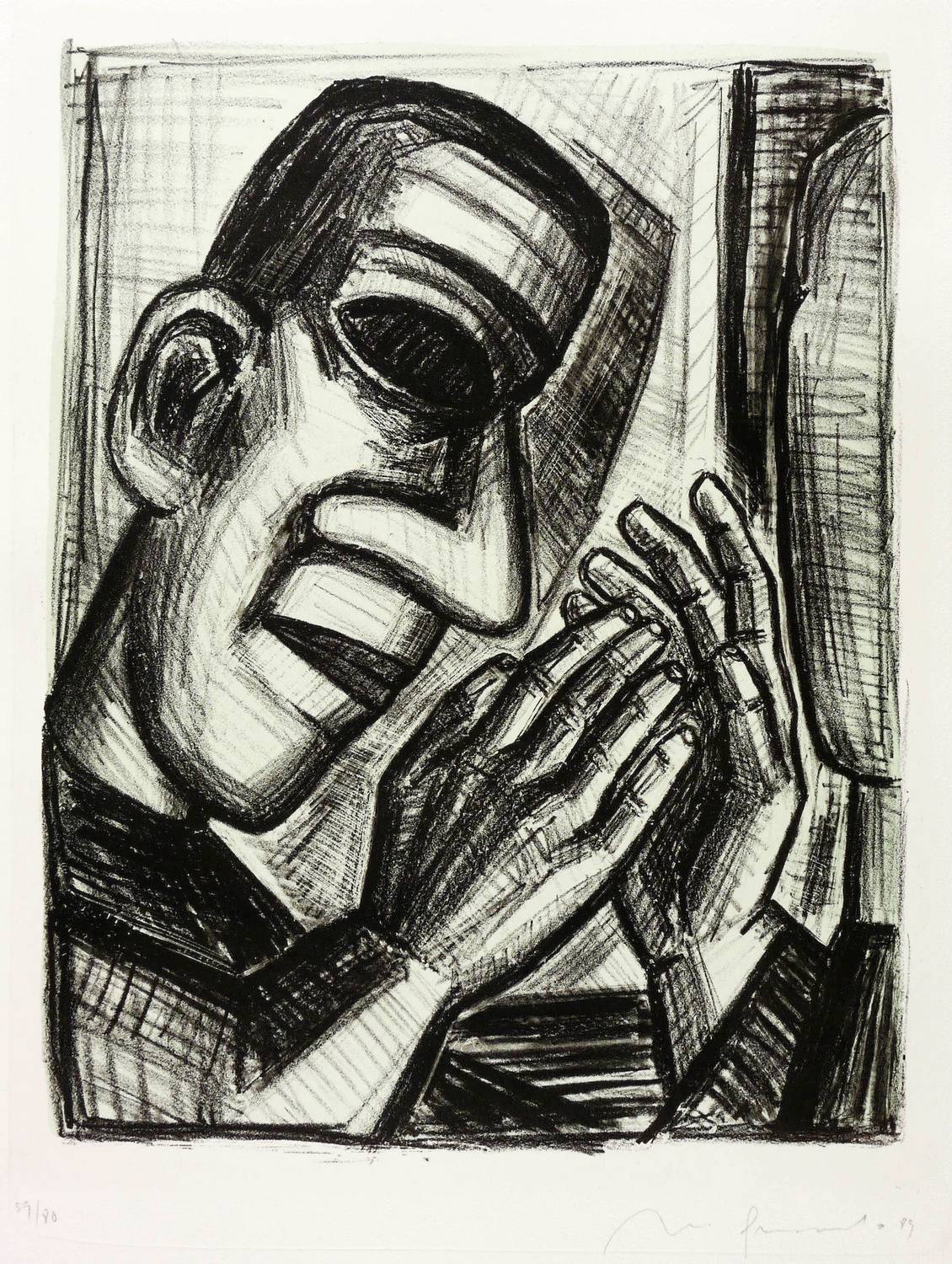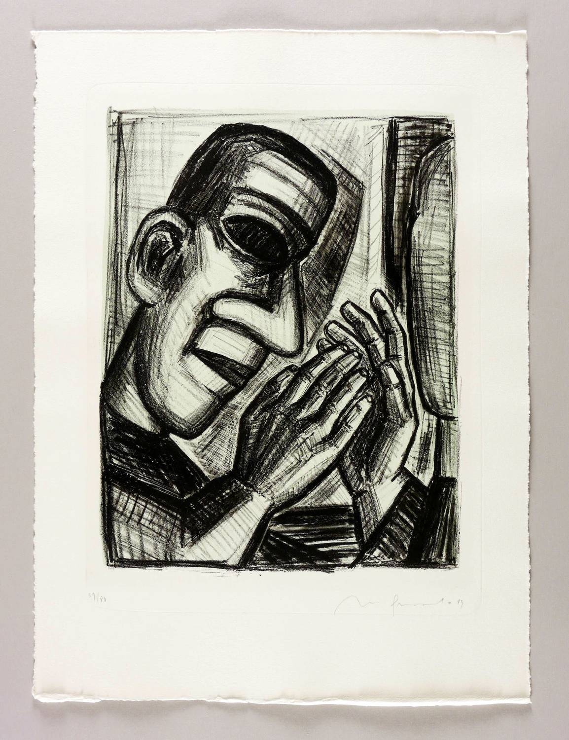 1989. Tonlithografie / Kreidelithografie, in Schwarz, über blau-grüner Tonplatte, auf Hahnemühle-Bütten. – Originale Künstlergrafik, von Nuria Quevedo. – Auflage Exemplar Nr. 59/80. – 37,8 x 29,2 cm (Darstellung / Druckbild), 54 x 40 cm (Blatt).