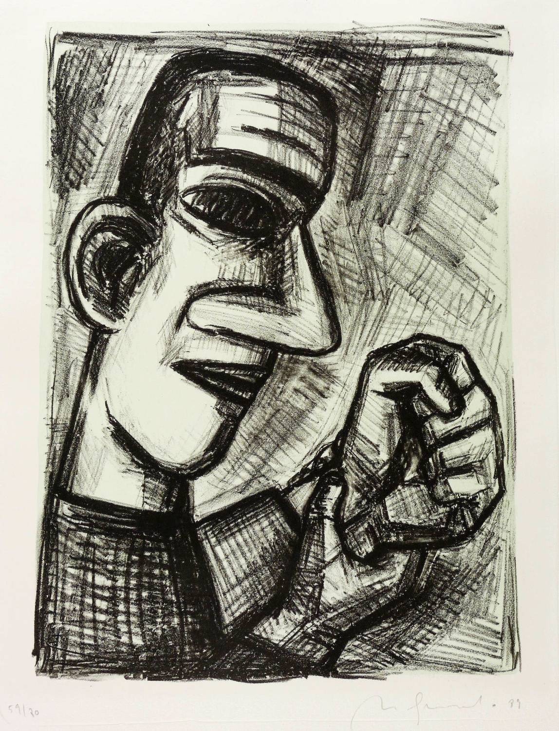 Wetterney 386. – Aus: Nuria Quevedo, Das Leben ist Traum (Berlin: Berliner Graphikpresse 1989). – Rechts unten in Bleistift signiert und datiert: ″N. Quevedo 89″. Links Auflagenbezeichnung. Wasserzeichen der Papiermühle. – Abzug vom Stein durch den Drucker Klaus Wilfert. – Ohne Tadel. Sehr guter Zustand.