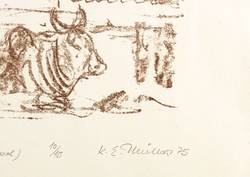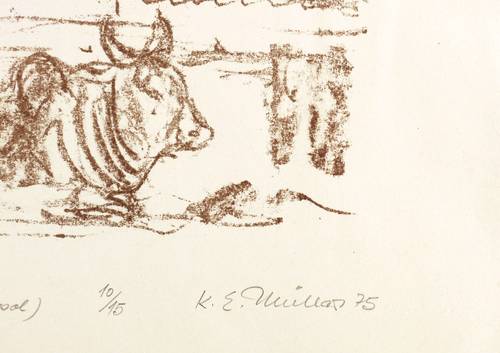 1975. Lithografie / Kreidelithografie, in Dunkelbraun, auf glattem hellem Velin. – Originale Künstlergrafik, von Karl Erich Müller. – Auflage Exemplar Nr. 10/15. – 34 x 26 cm (Blatt), 20,5 x 14,3 cm (Darstellung / Druckbild).
