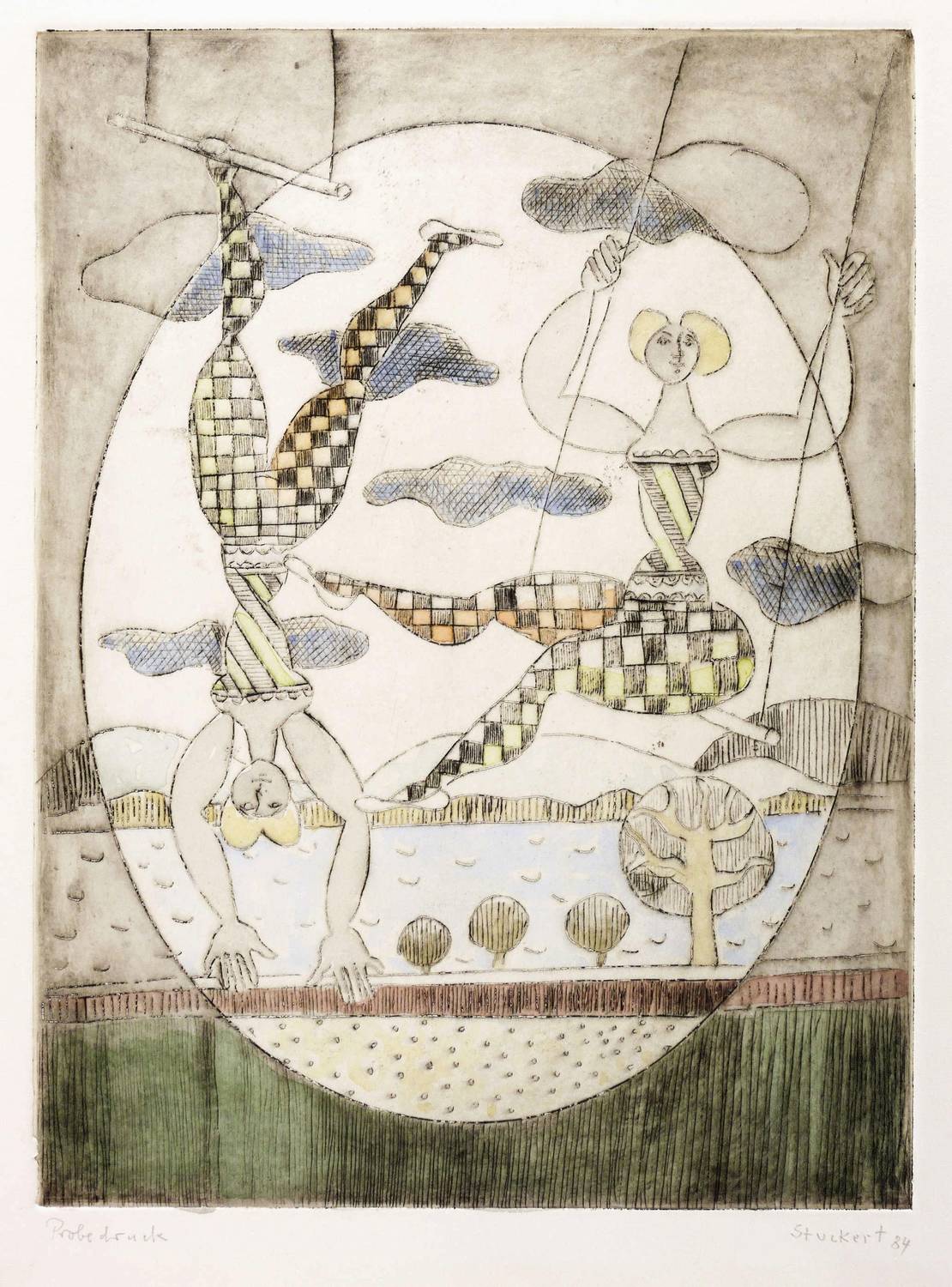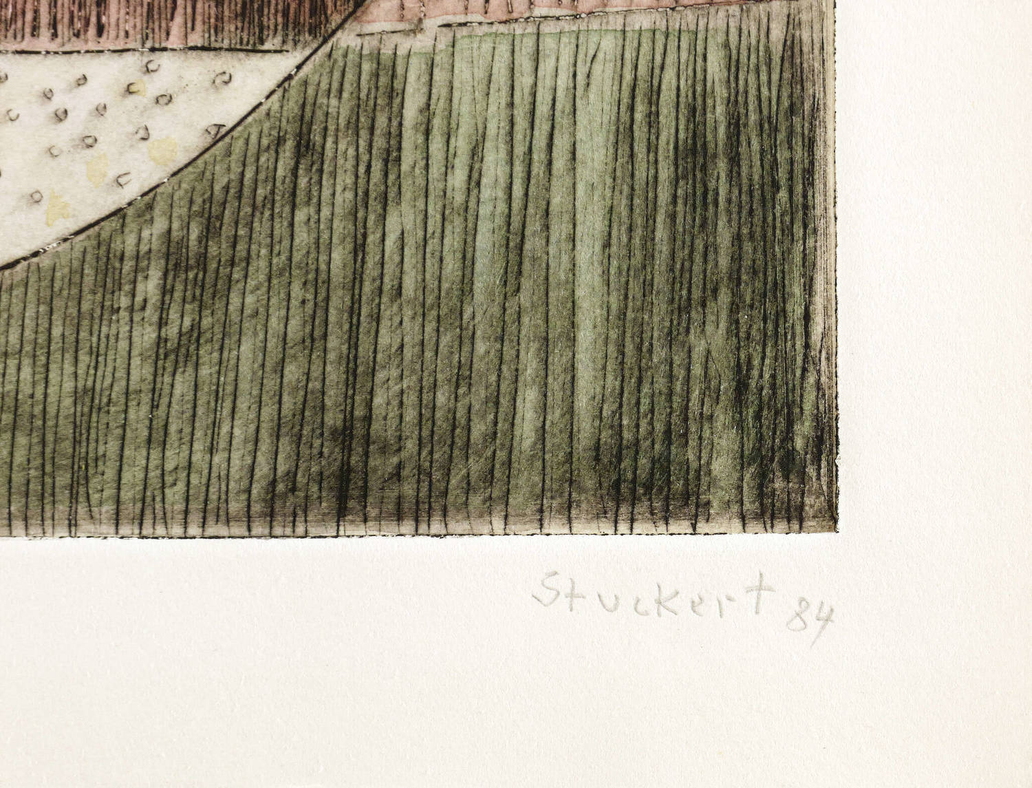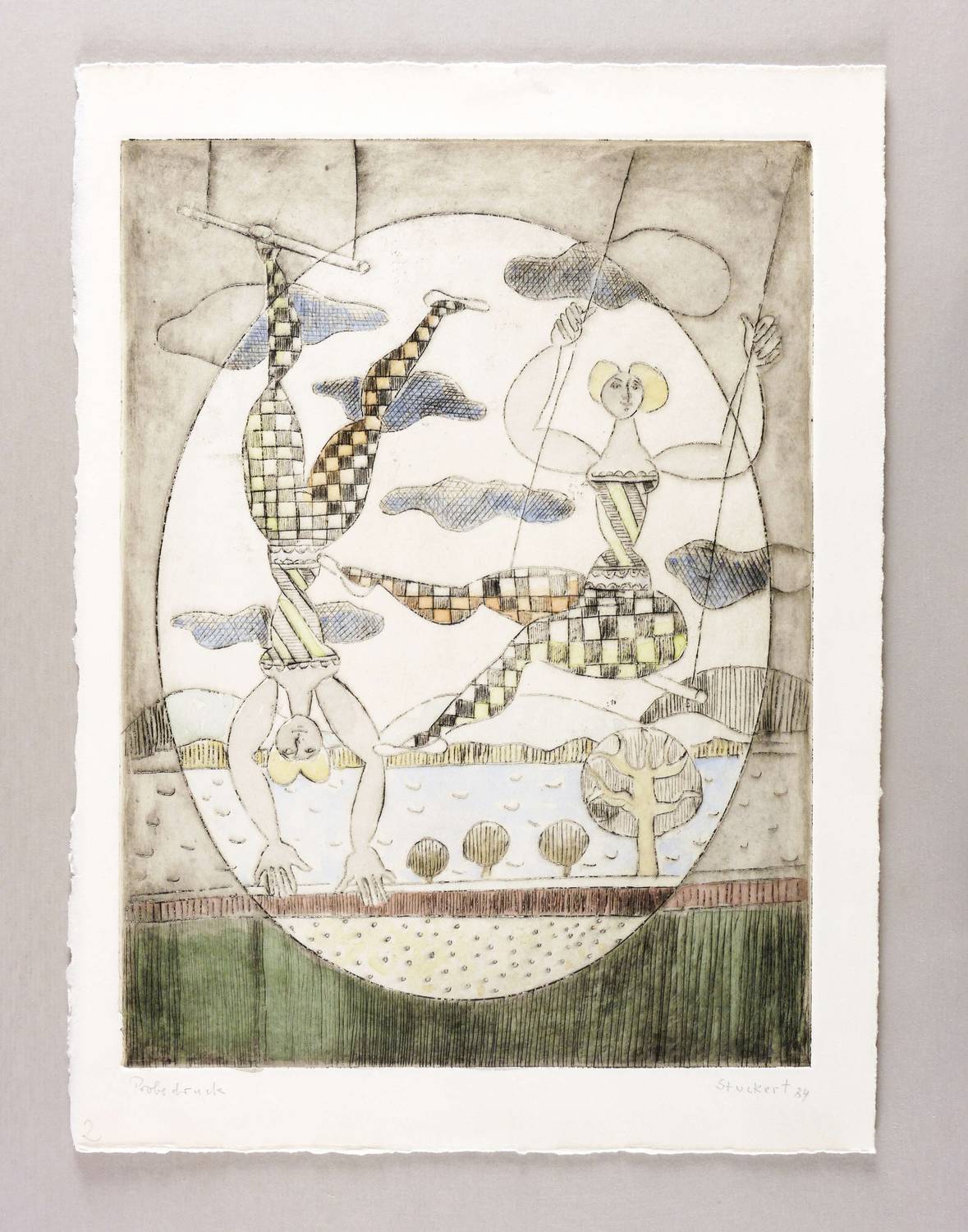 Rechts unten in Bleistift signiert und datiert: ″Stuckert 84″. Links Auflagenbezeichnung: ″Probedruck″. – Die Gesamtauflage dieser Radierung betrug 60 Exemplare, nur 30 Exemplare wurden wie dieses vom Künstler koloriert. – Sehr guter Zustand.