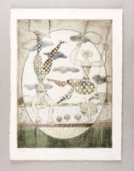 1984. Radierung / Strichätzung, in Schwarz, aquarelliert, auf schwerem hellchamois Velin. – Originale Künstlergrafik, von Rudolf Stuckert. – Probedruck. – 32,8 x 24,4 cm (Darstellung / Platte), 39 x 29 cm (Blatt).
