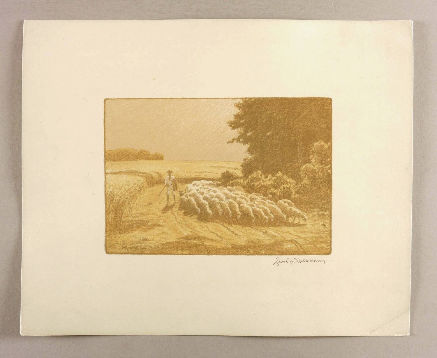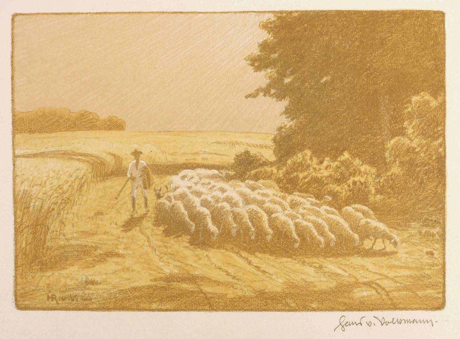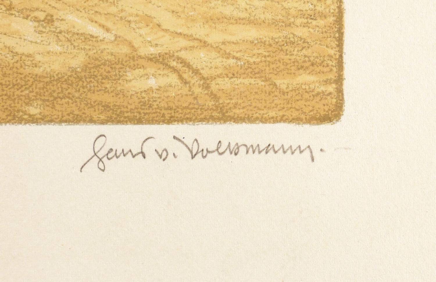 Rechts unten in Bleistift signiert: ″Hans v. Volkmann″. Dazu im Stein links unten Signatur: ″HR. v. V.″ Verso Stempel der Kunstdruckerei Künstlerbund Karlsruhe (KKK) mit handschriftlicher Nummerierung: ″85″. – Originalrandiges Exemplar. Rechts unten Eselsohr. Mäßig guter Zustand.