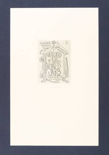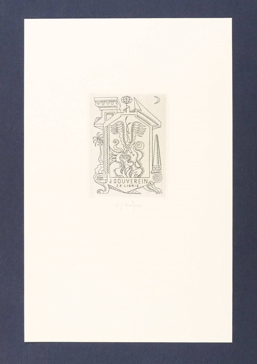 1973. Kupferstich / Linienstich, in Schwarz, auf weißem Kupferdruckkarton. – Exlibris, von Ladislav Josef Kaspar. – 10,0 x 7,3 cm (Darstellung / Platte), 29,5 x 19 cm (Blatt).