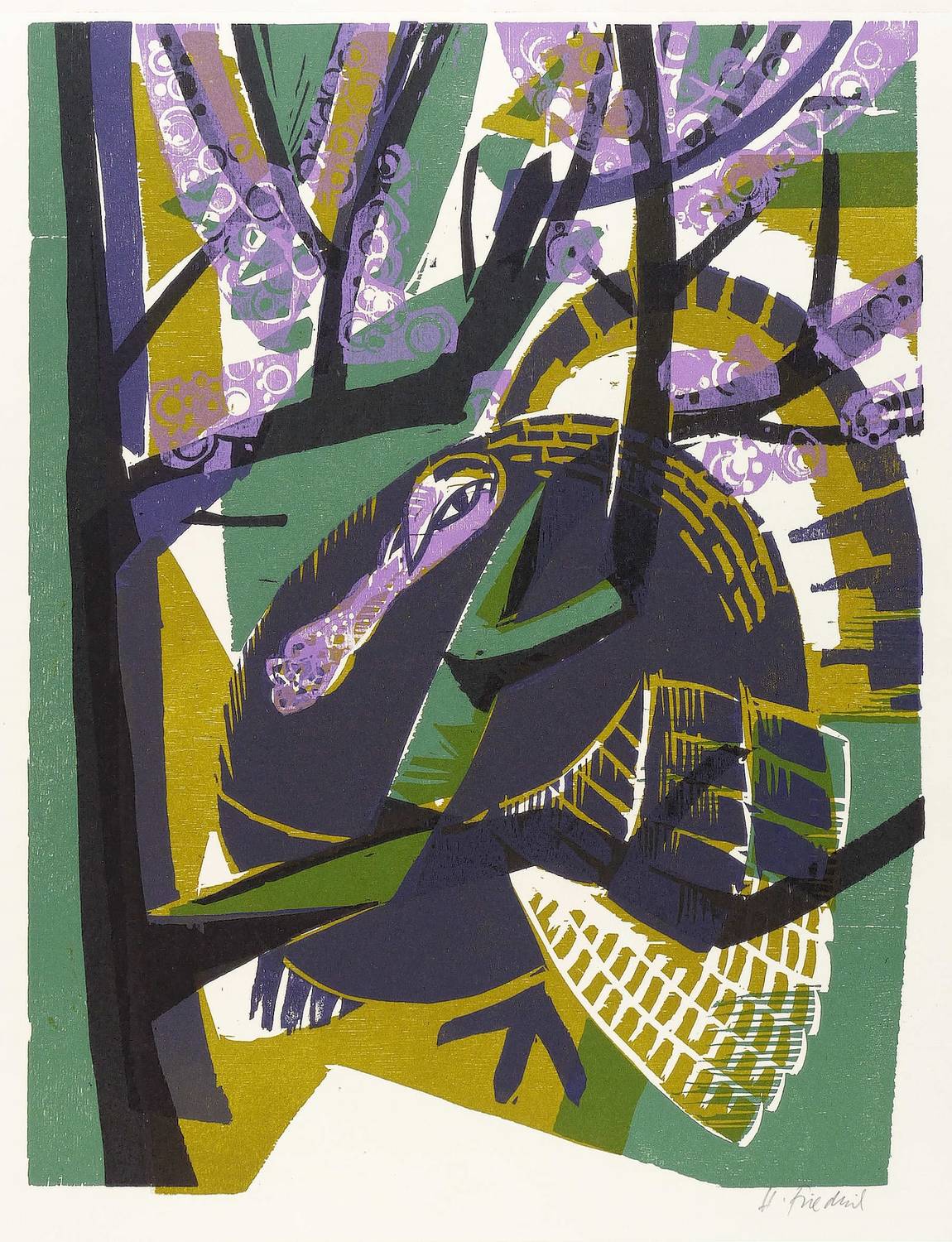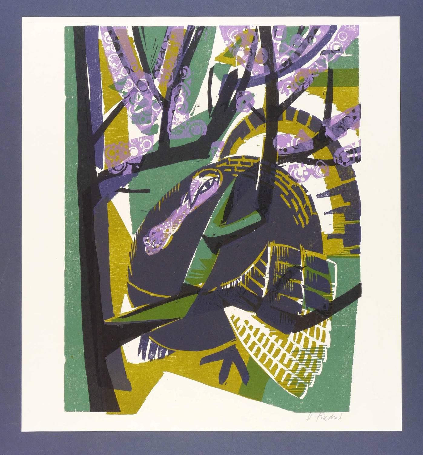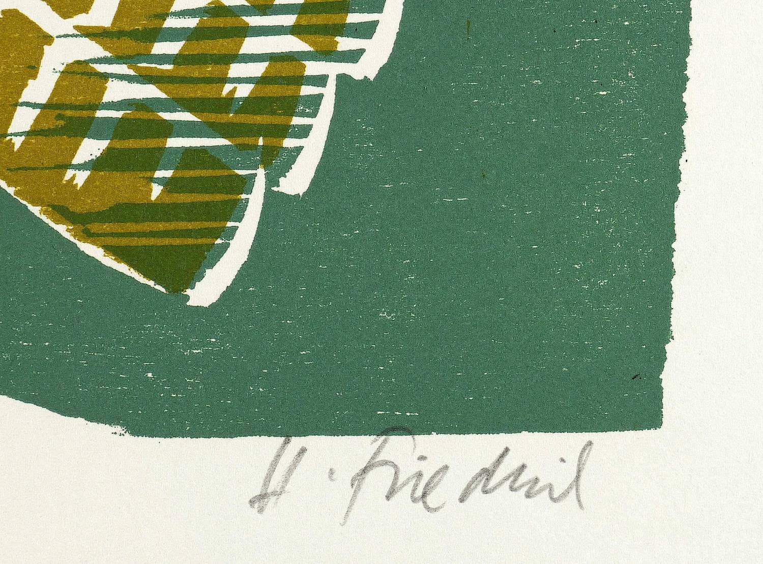 Heinz Friedrich (1924 Schwetzingen - 2018 Schwetzingen). Deutscher Maler und Grafiker. 1939-42 Lehre als Maurer und Bautechniker. 1942-45 als Soldat im 2. Weltkrieg. 1946-48 Studium an der Kunstakademie Stuttgart bei Hermann Sohn, 1948/49 an der Kunstakademie Karlsruhe bei Wilhelm Schnarrenberger und Otto Laible. Seit 1950 freischaffend als Maler und Grafiker tätig. 1956 Sommerakademie Salzburg bei Oskar Kokoschka und Giacomo Manzu. Zwischenzeitlich Tätigkeit als Bühnenbildner. Ab 1968 Beschäftigung mit dem Farbholzschnitt; 1970 Mitglied der Gruppe XYLON. 1978 Retrospektive in der Pfalzgalerie Kaiserslautern. Lebte und arbeitete zuletzt in Schwetzingen und Frankenweiler / Weinstraße.