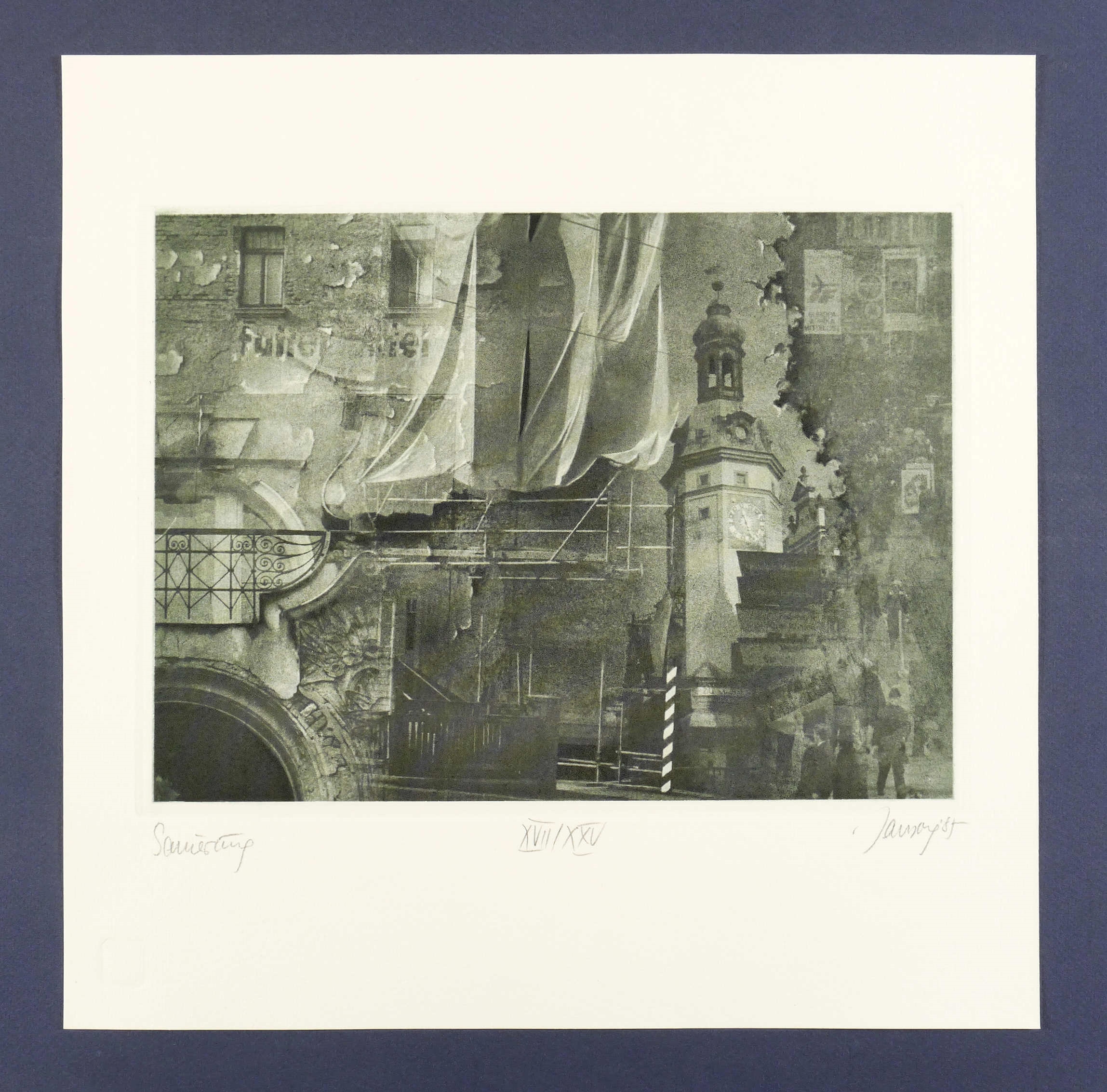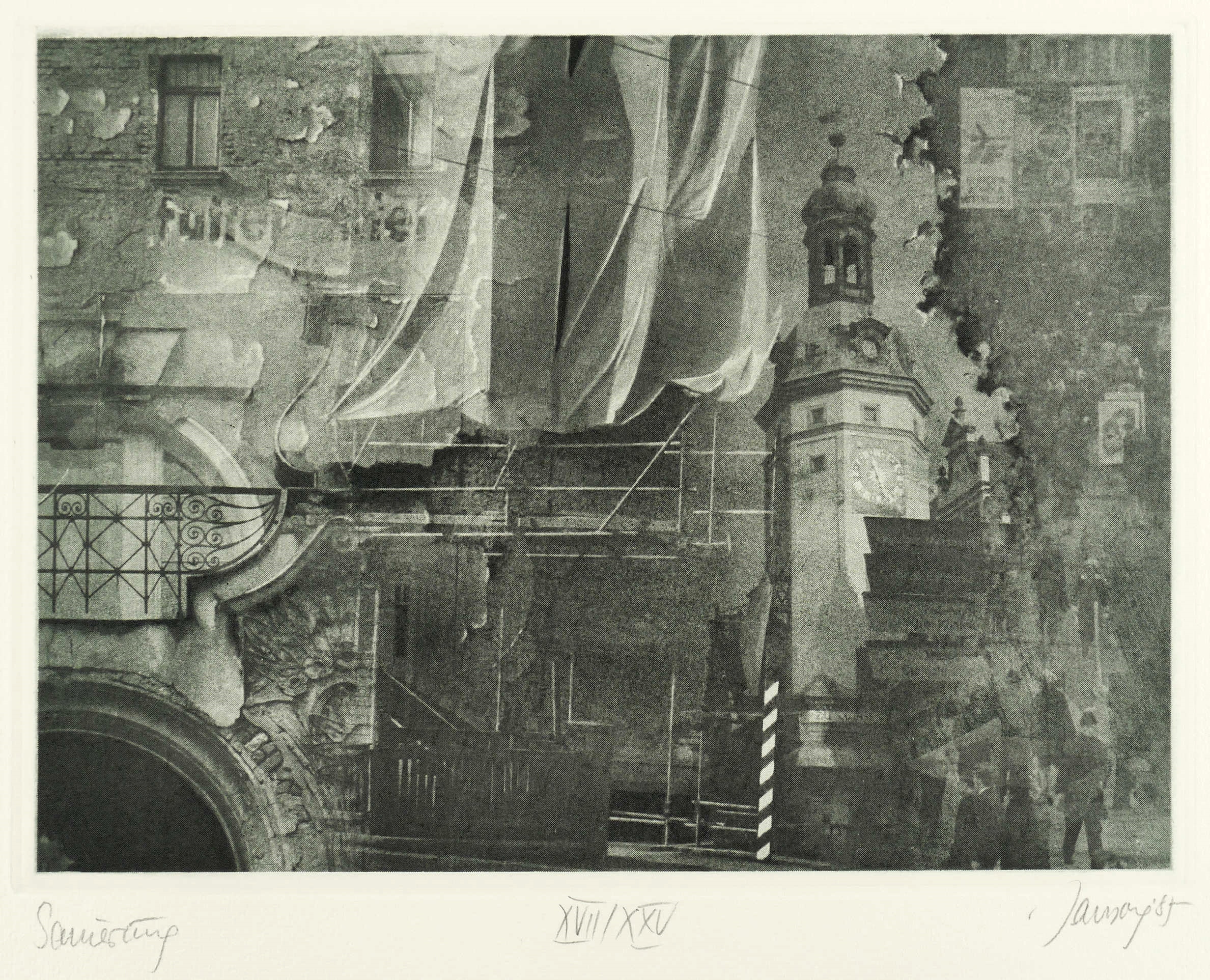 Rechts unten in Bleistift signiert und datiert. Links Titel. Mittig Auflagenbezeichnung. – Radierkünstlerische Montage fotografischer Aufnahmen verfallener Fassaden und des Leipziger Rathausturmes. – Sehr gut erhalten.