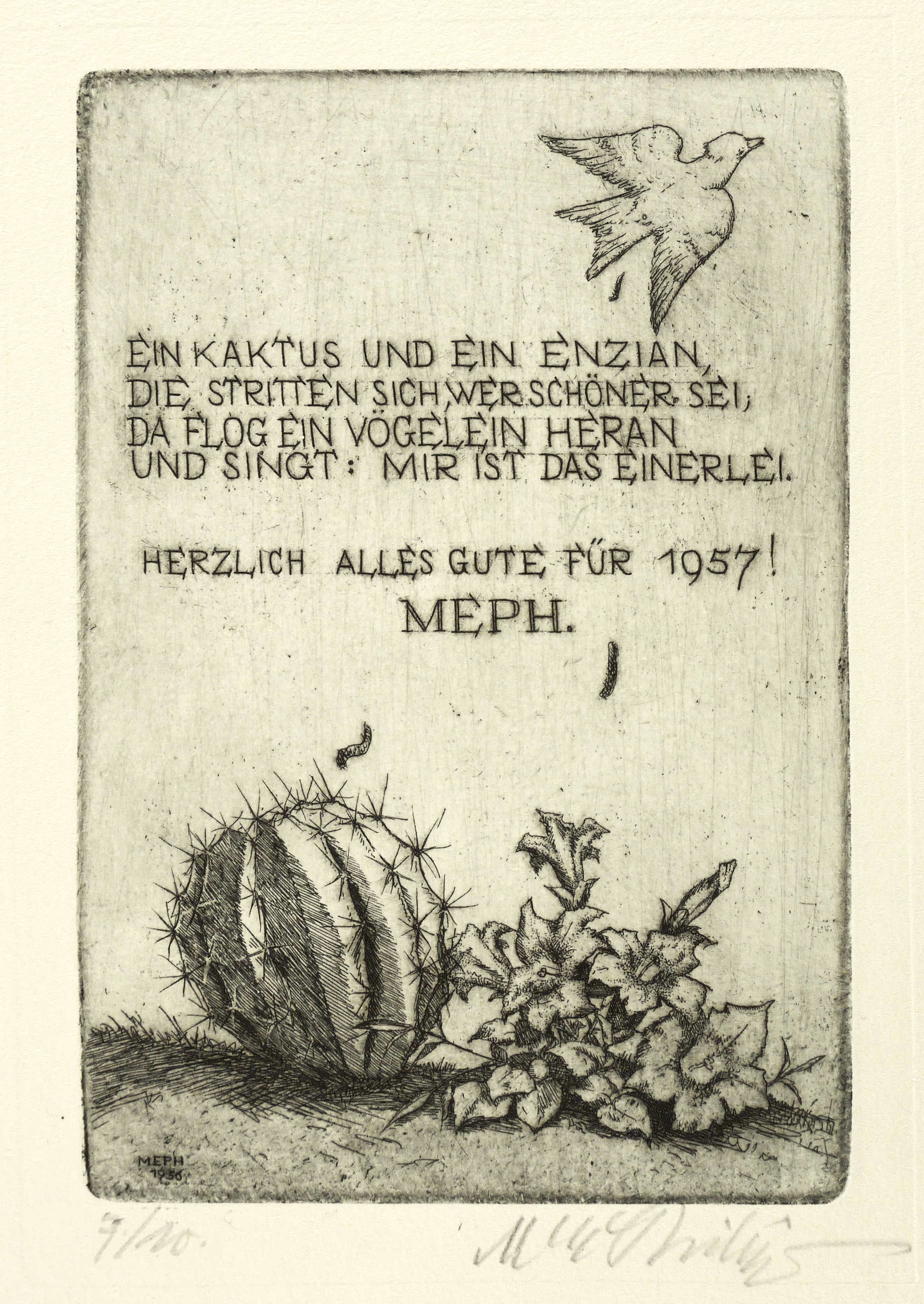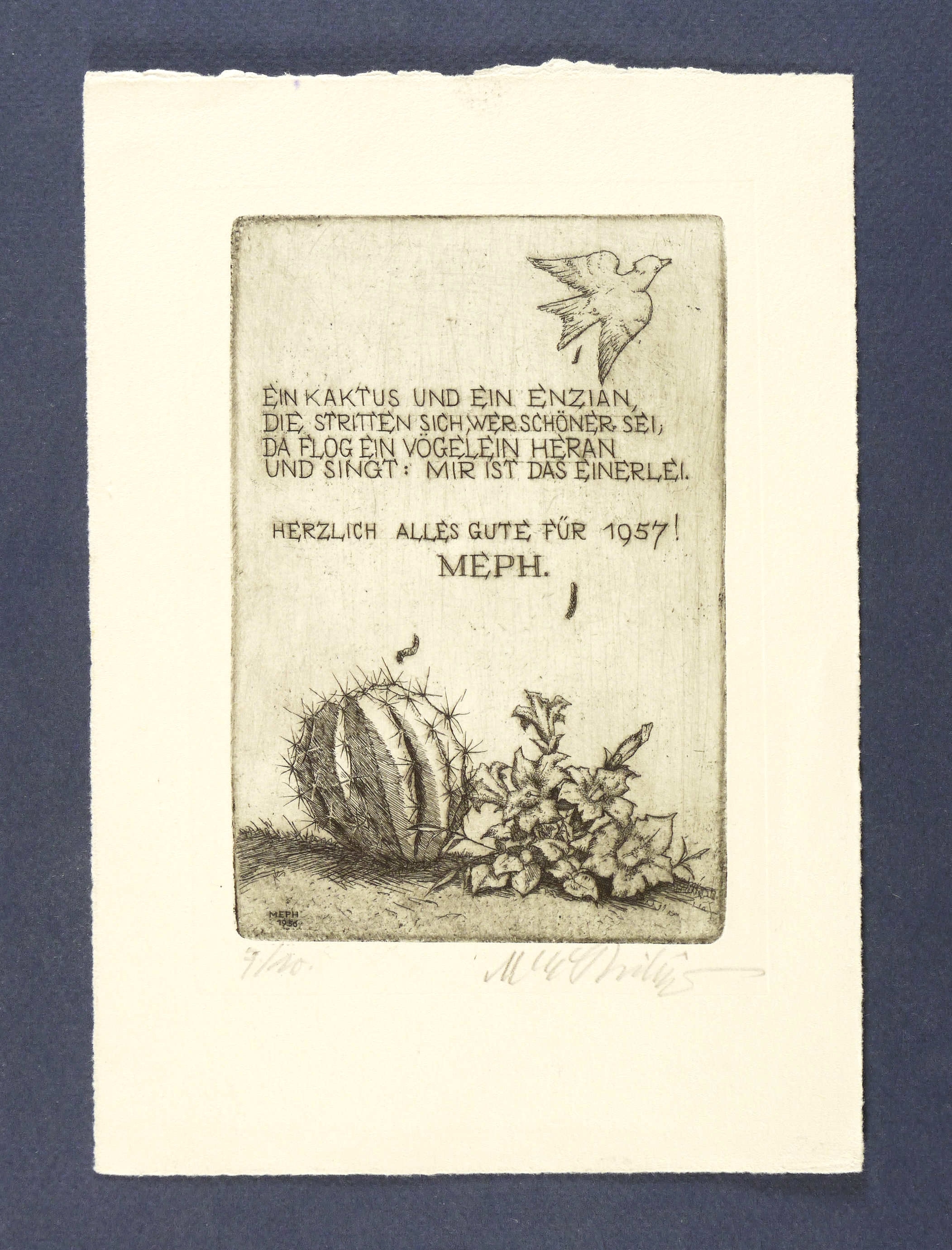 Rechts unten in Bleistift signiert. Links Auflagenbezeichnung. In der Platte links unten Monogramm und Jahr. Oben Inschrift mit Sinnspruch und Glückwunsch für das Jahr 1957. – Sehr schönes Blatt. – Sehr guter Zustand.
