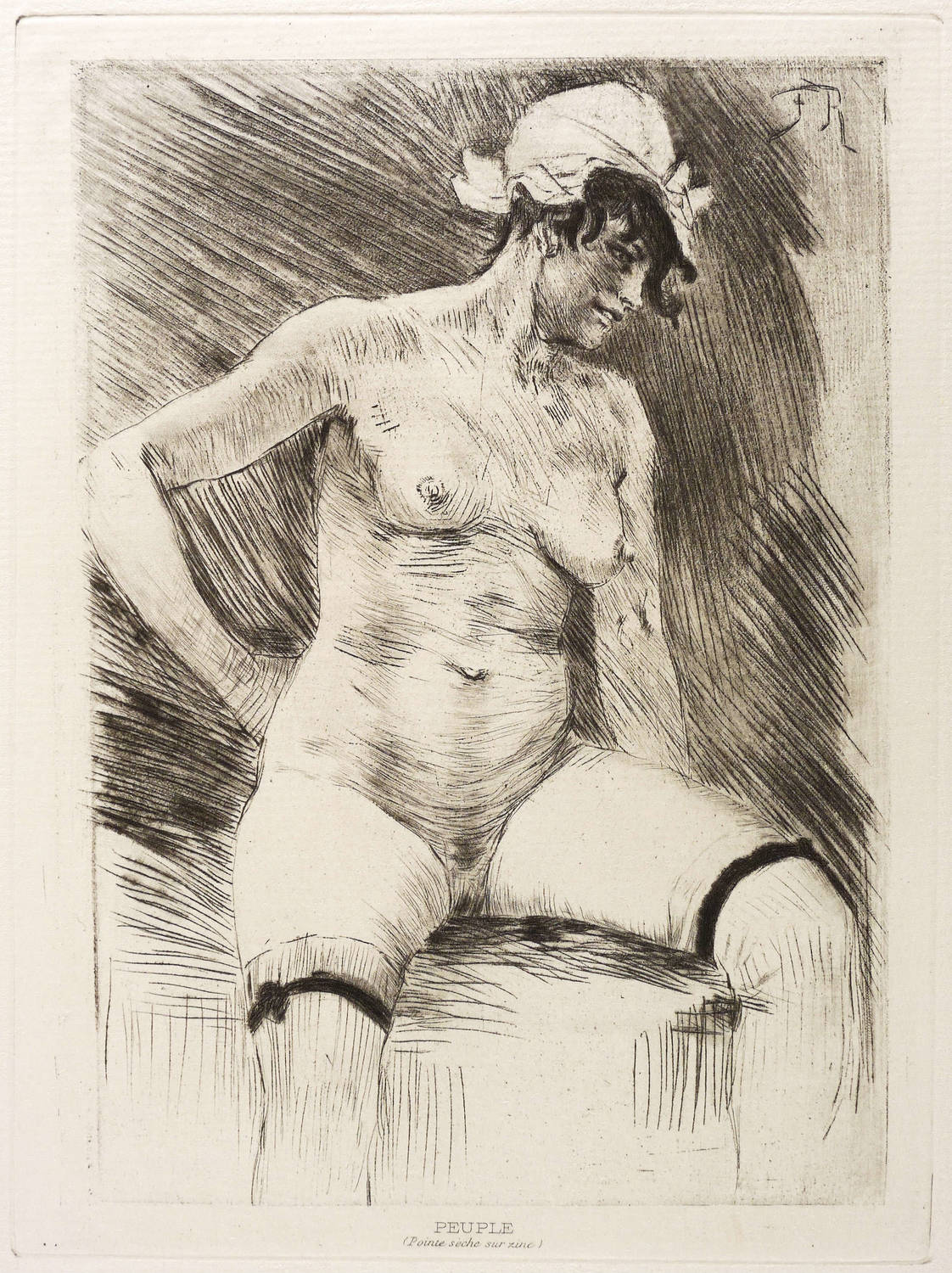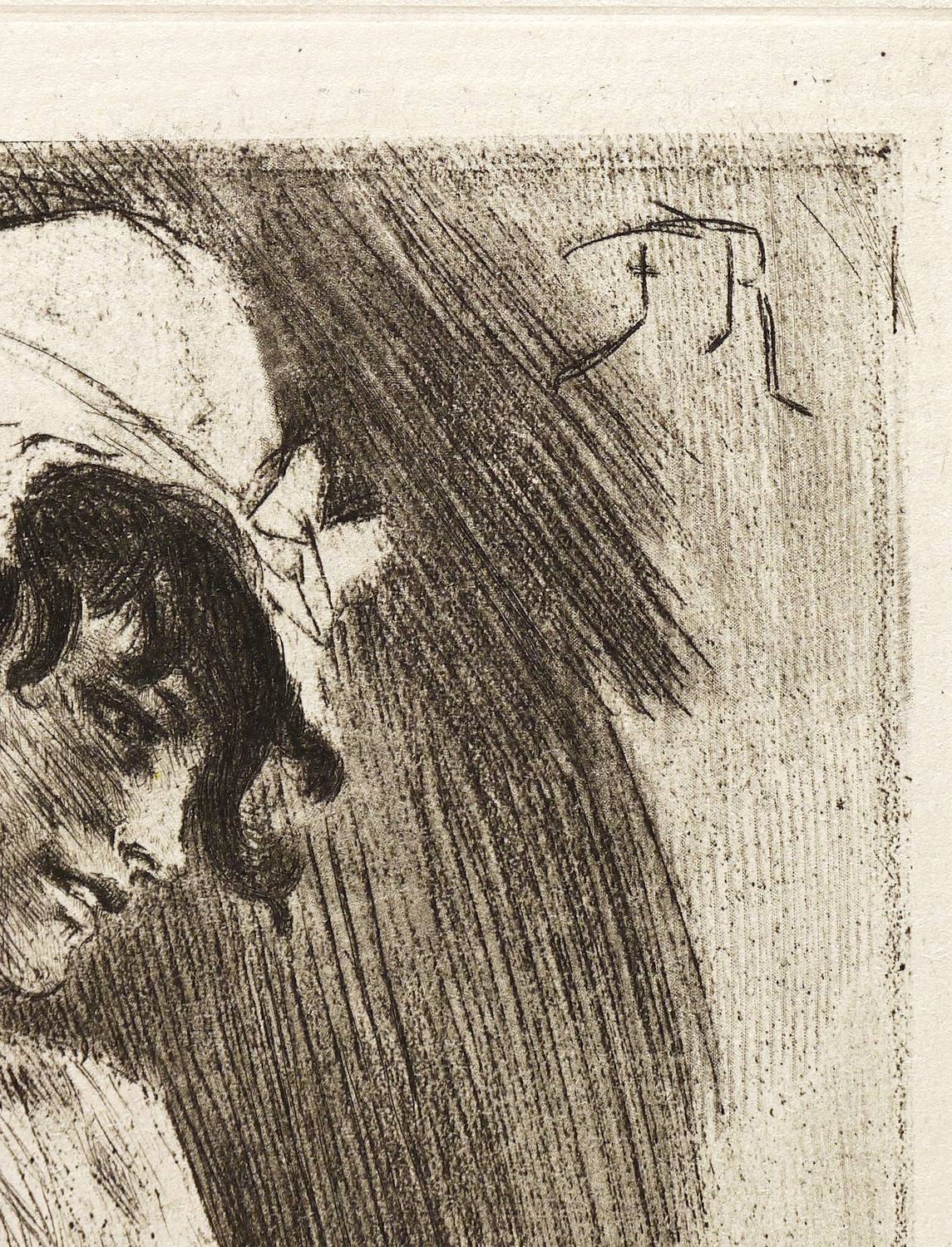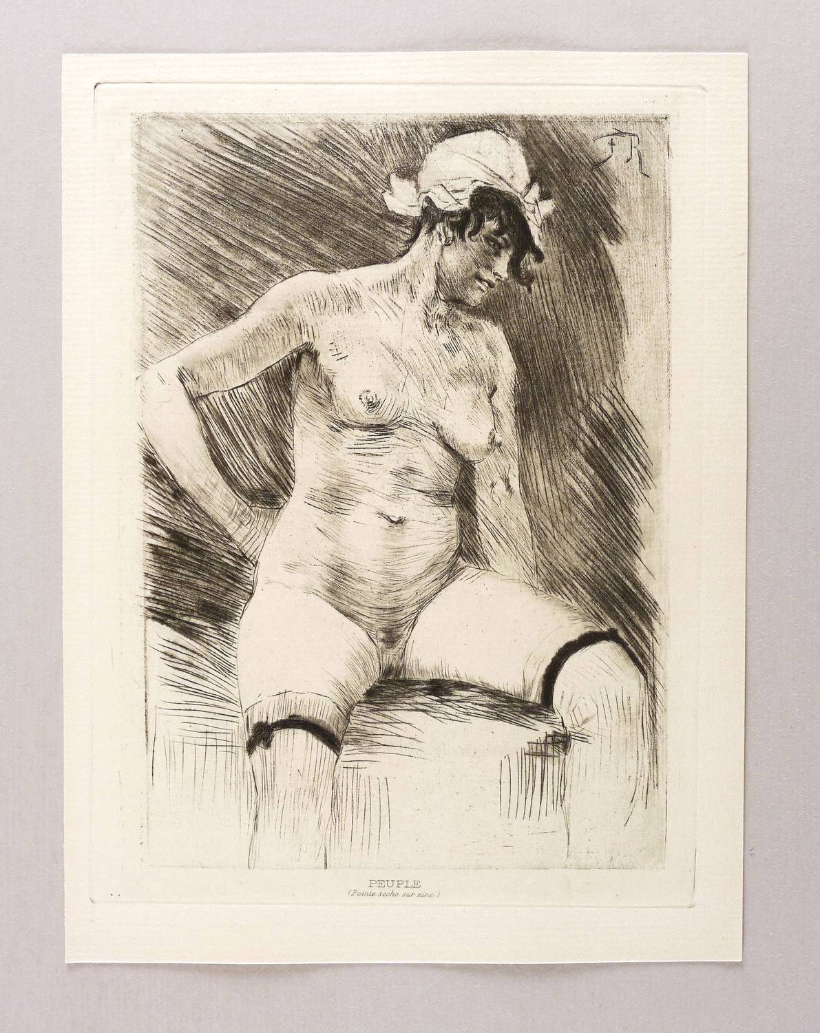 Ramiro 550. Mascha 734. Exsteens 1036.2. – Aus: Érastène Ramiro, Études sur quelques Artistes originaux. Félicien Rops (Paris: G. Pellet & H. Floury 1905). – Nicht handsigniert. In der Platte rechts oben monogrammiert: ″FR″. In der Platte unten gestochene Inschrift: ″PEUPLE (Pointe seche sur zinc)″. – Mädchen mit Strümpfen und Kopfhaube. – Tadellos erhalten. Insgesamt sehr guter Zustand.