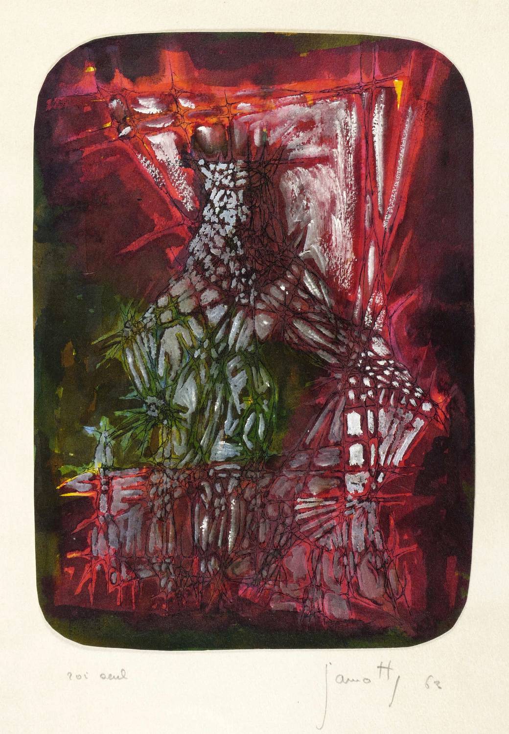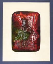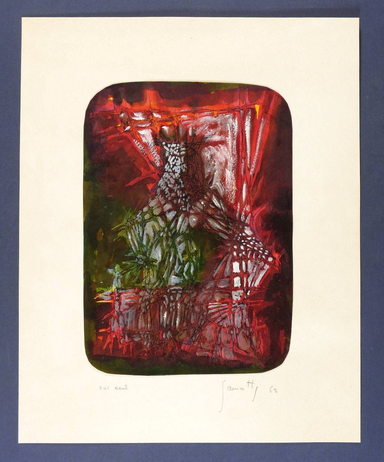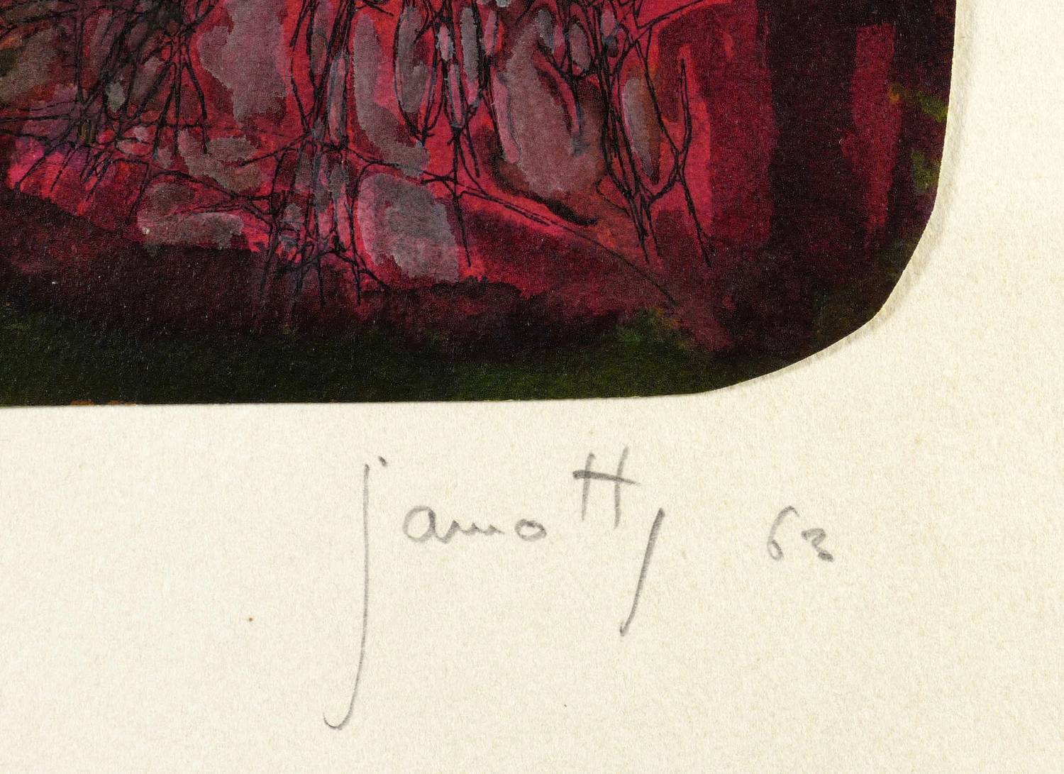 Unten rechts in Bleistift etwas undeutlich signiert und datiert: ″Jamott (?) 63″. Links Titel. – Stark abstrahierte Darstellung einer thronenden Eule als einsamer König. – Vom Künstler original auf Trägerkarton gesetzt und beschriftet. Der Trägerkarton oberflächlich minimal angestaubt. Insgesamt guter Erhaltungszustand.