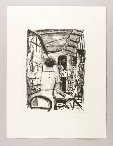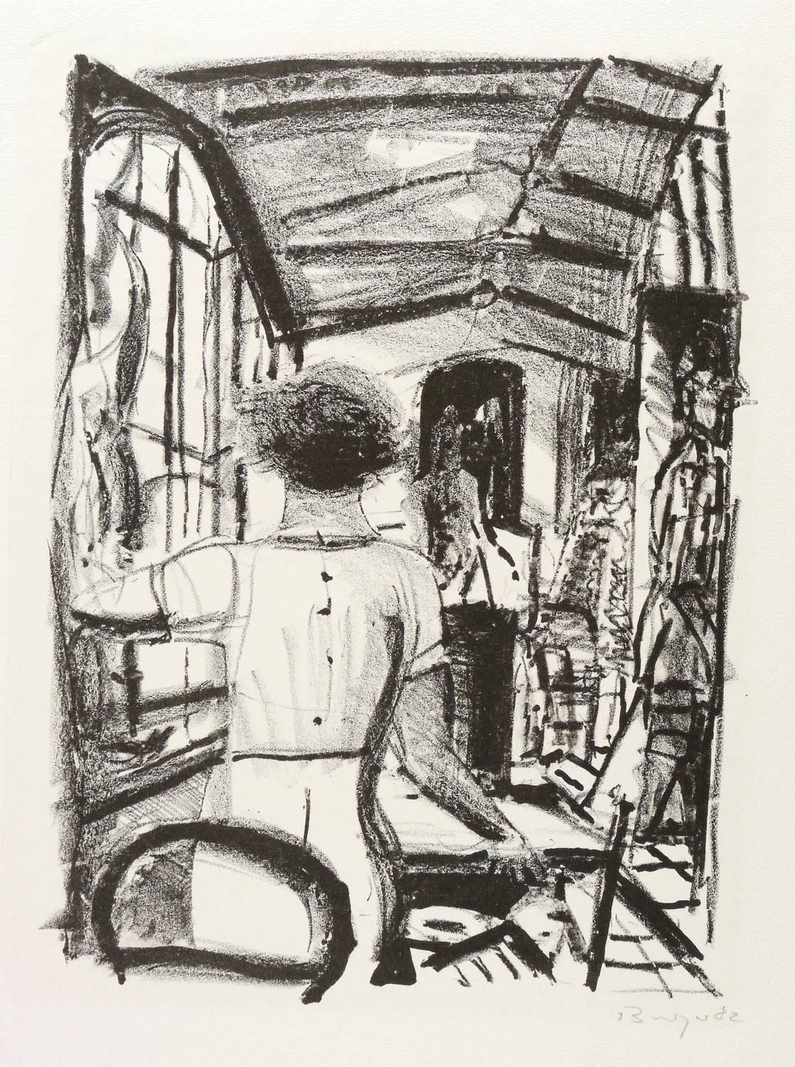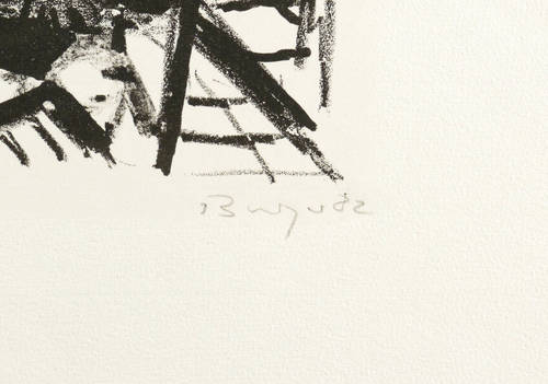 1982. Lithografie / Kreide- & Pinsellithografie, in Schwarz, auf feinem gelbem Hahnemühle-Bütten. – Von Dietrich Burger. – Probedruck. – 32,7 x 24,6 cm (Darstellung / Druckbild), 52 x 40 cm (Blatt).