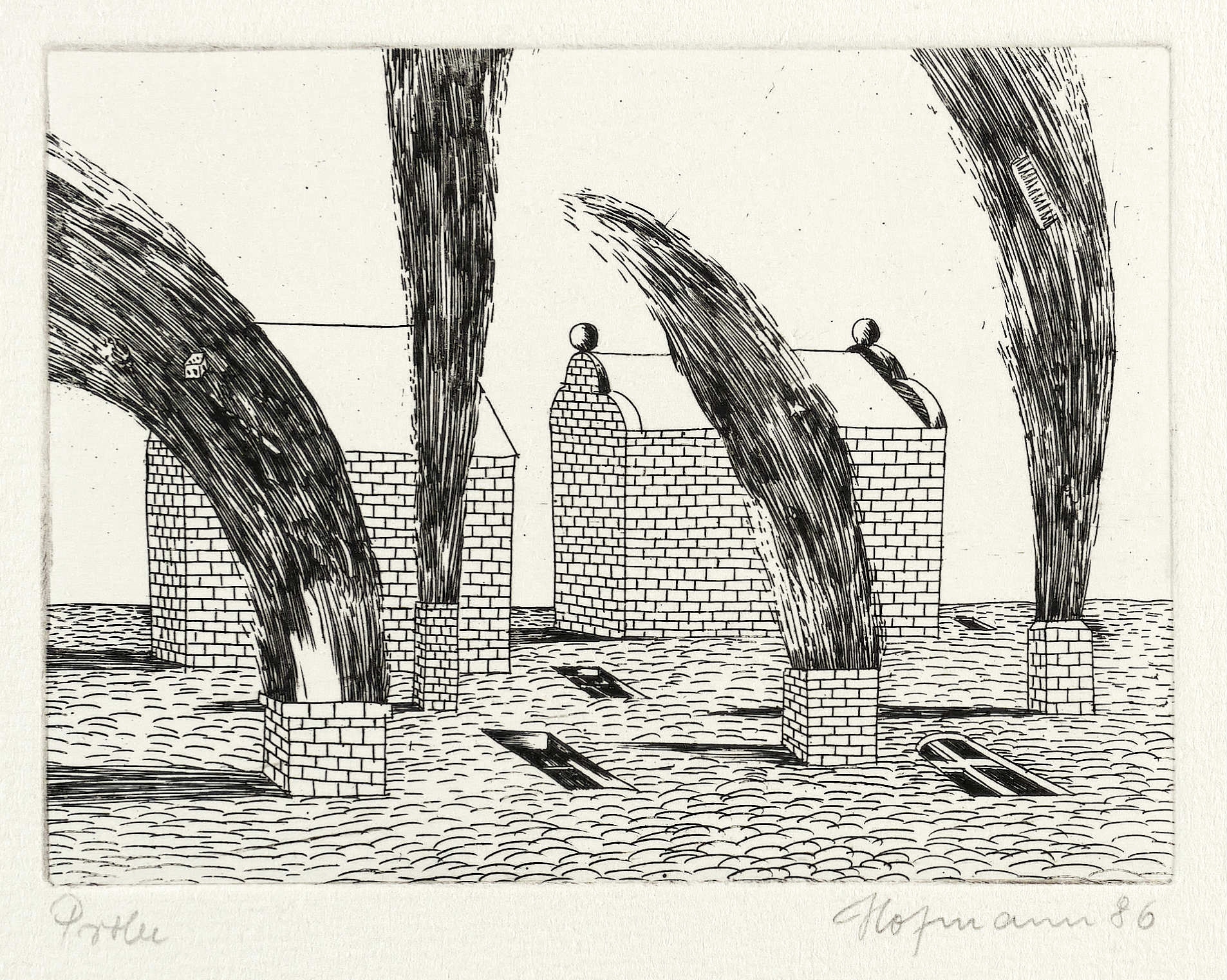 1986. Radierung / Strichätzung, in Schwarz, auf schwerem Hahnemühle-Bütten. – Von Günter Hofmann. – Probedruck. – 9,8 x 13,2 cm (Darstellung / Platte), 19,5 x 27 cm (Blatt).