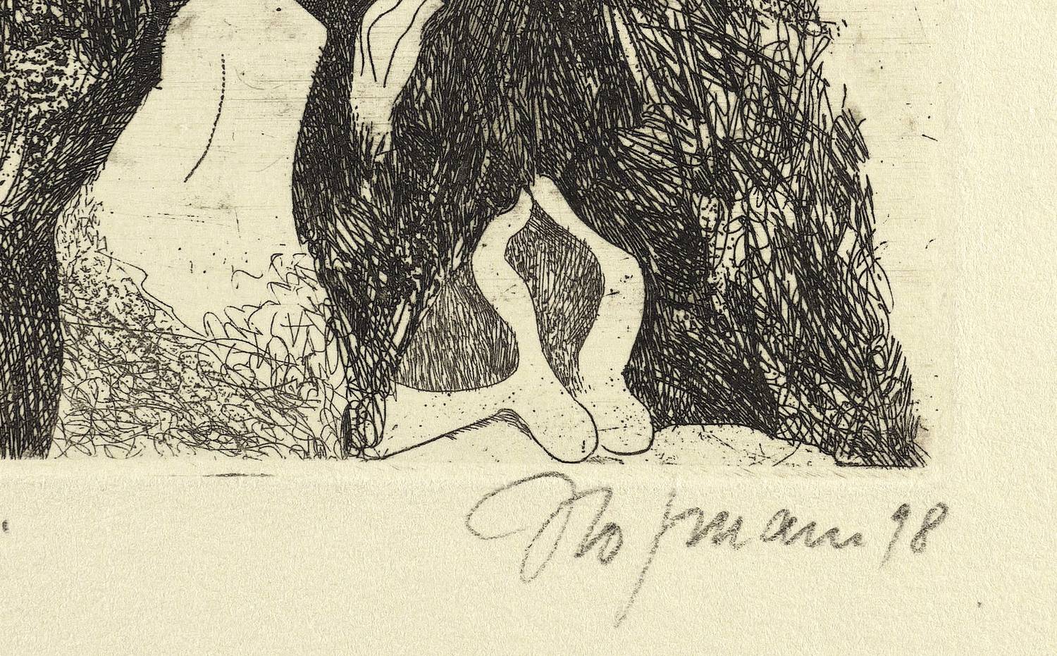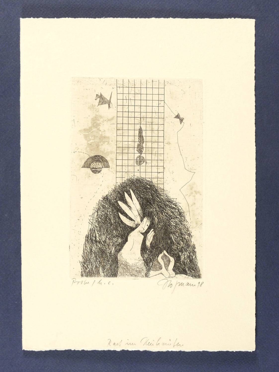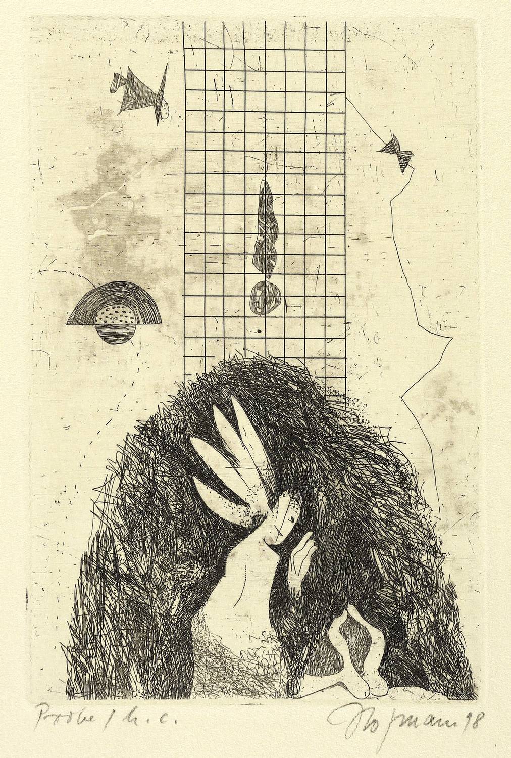 1998. Radierung / Strichätzung, in Schwarz, auf gelbem Büttenkarton. – Von Günter Hofmann. – Probedruck. – 16,3 x 10,8 cm (Darstellung / Platte), 27 x 19 cm (Blatt).