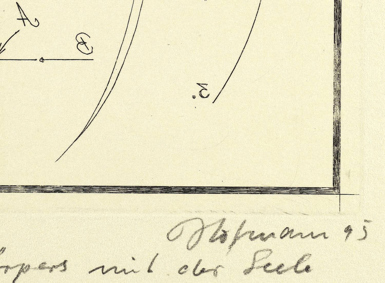 Rechts unten in Bleistift signiert und datiert. Links Auflagenbezeichnung. Oberhalb Serien-Titel. Unterhalb Titel und ausführliche Bezeichnung: ″N° 25 I) Verkehr des Körpers mit der Seele / nach G. Chr. Lichtenberg″. – Blatt aus dem Radier-Zyklus zu Georg Christoph Lichtenberg und seinem phantastisch-bizzaren ″Verzeichnis einer Sammlung von Geräthschaften, welche in dem Hause des Sir H.S. künftige Woche öffentlich verauctioniert werden sollen″ (1798). – Ohne Mängel. Sehr guter Zustand.