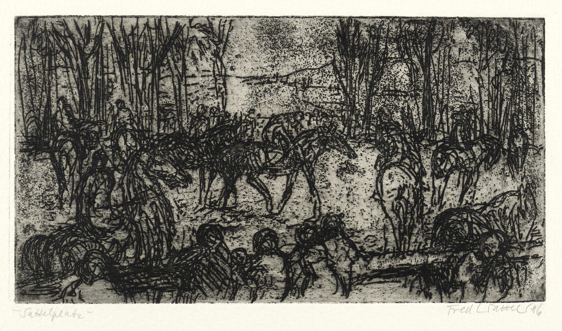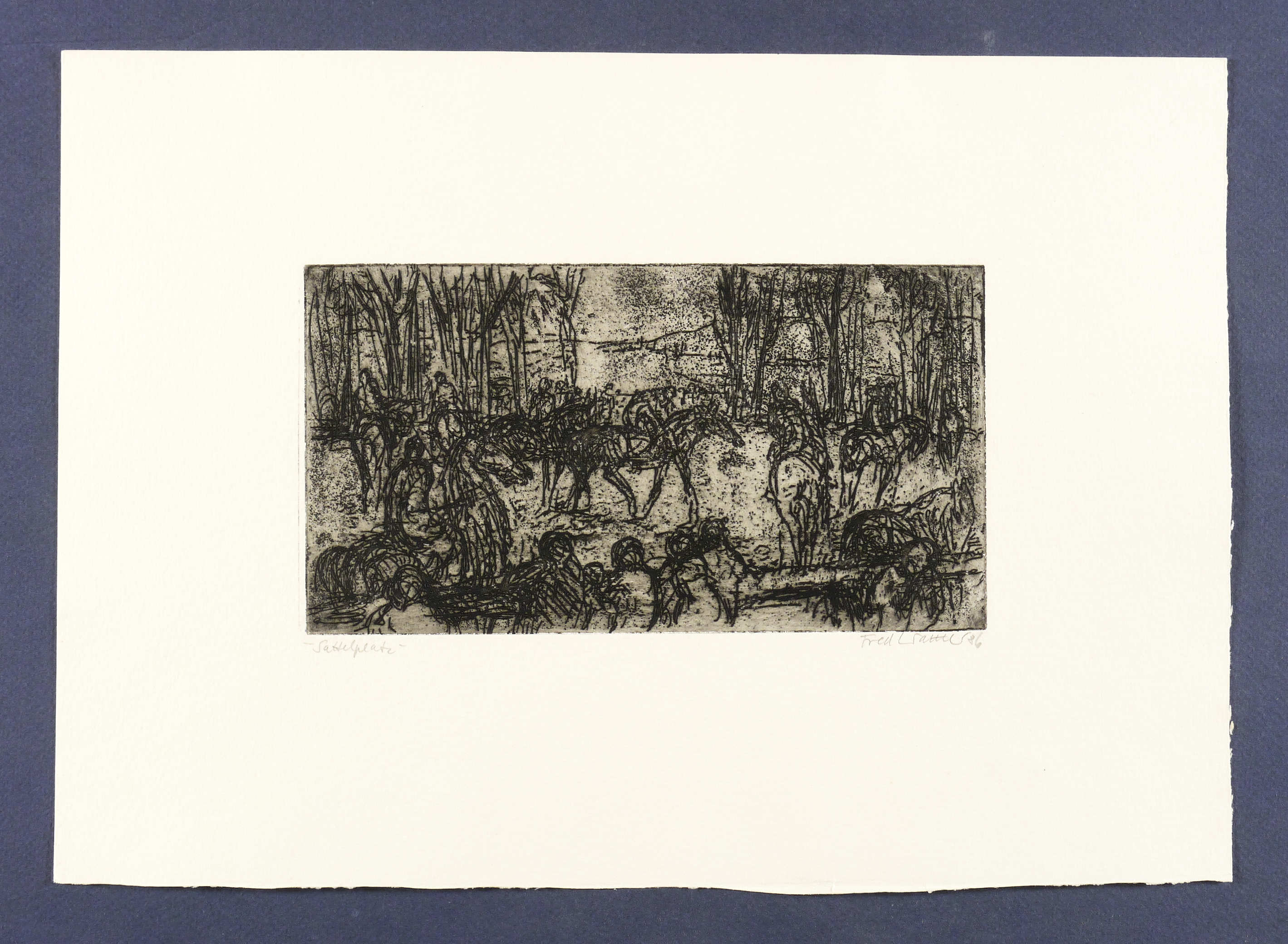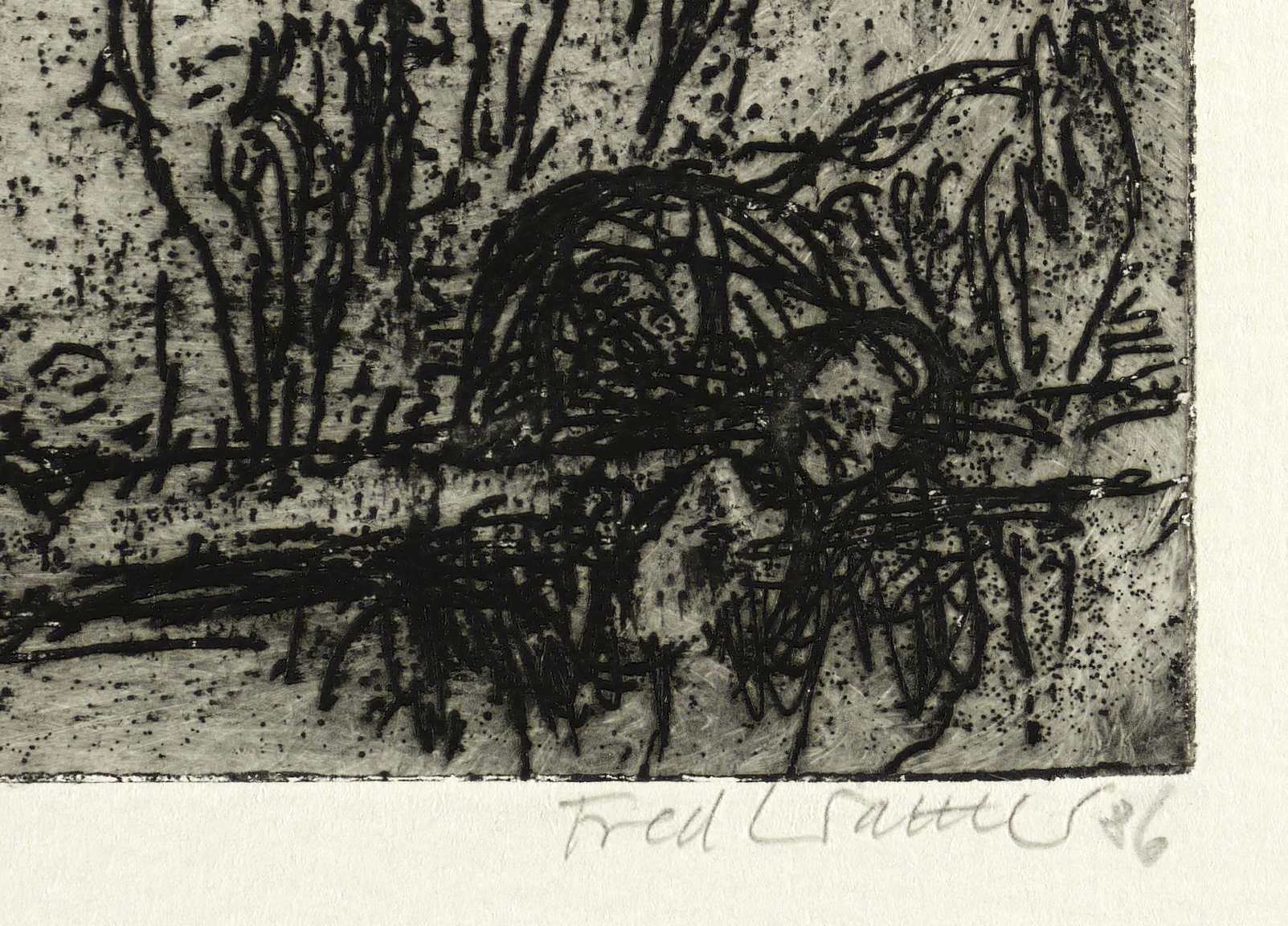 1968. Radierung / Vernis mou & Strichätzung, in Schwarz, mit Plattenton, auf hellchamois Büttenkarton. – Originale Künstlergrafik, von Fred Walther. – 11,1 x 20,4 cm (Darstellung / Platte), 25 x 35 cm (Blatt).