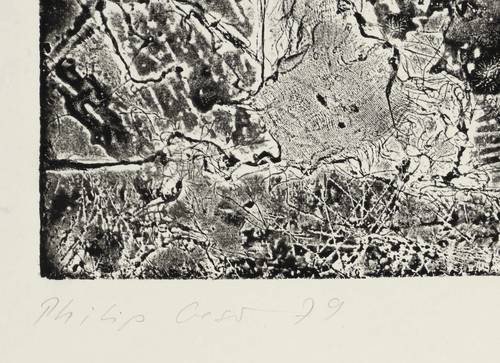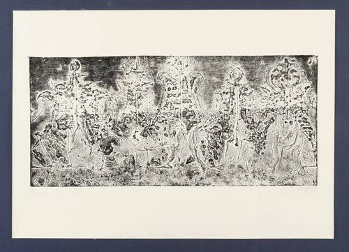 1979. Materialdruck, in Schwarz, auf glattem hellgelbem Karton. – Originale Künstlergrafik, von Philip Oeser. – Auflage Exemplar Nr. 38/60. – 19,8 x 43,6 cm (Darstellung / Platte), 35 x 49 cm (Blatt).