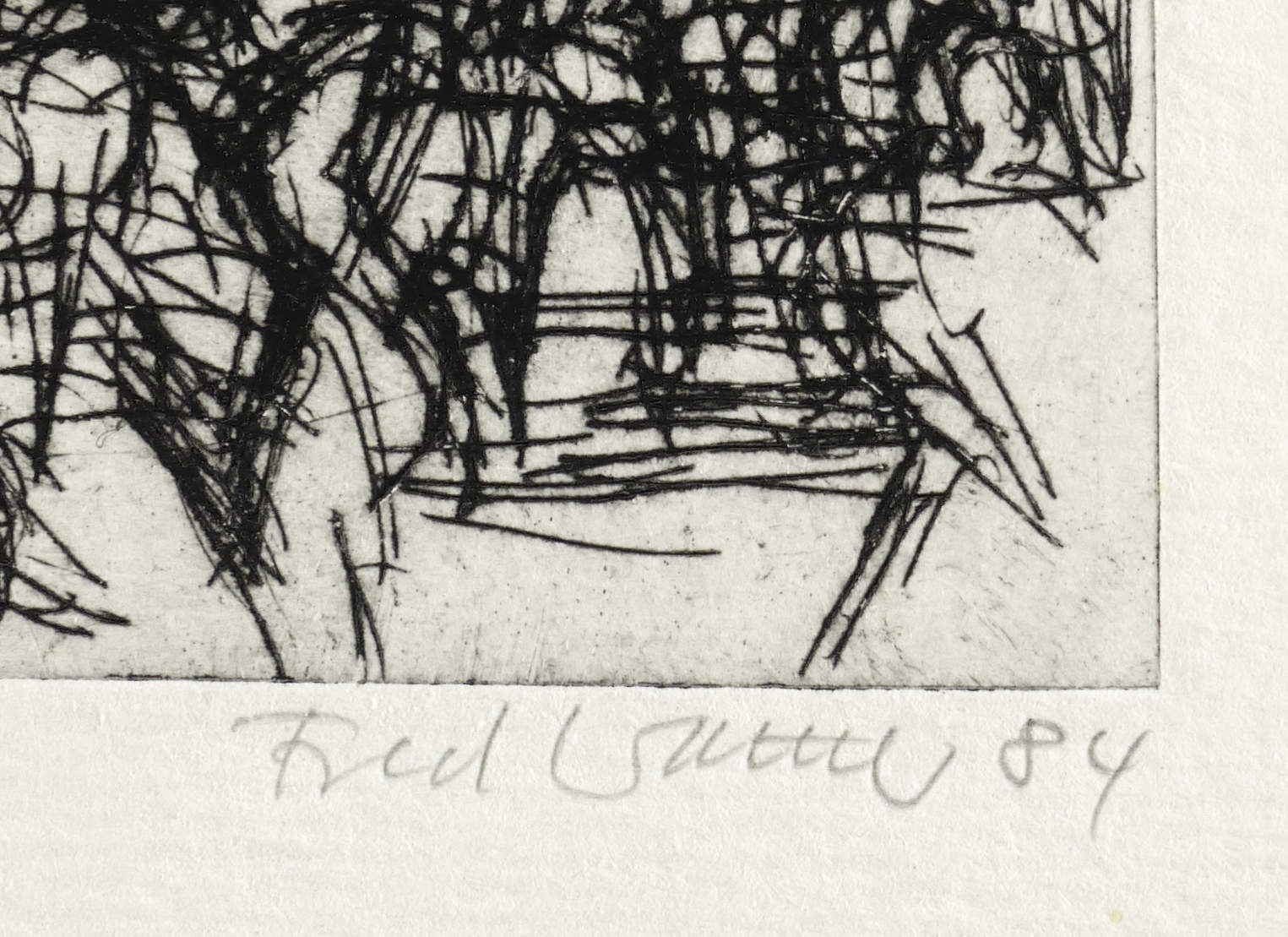 1984. Radierung / Strichätzung, mit leichtem Plattenton, in Schwarz, auf hellchamois Velin. – Originale Künstlergrafik, von Fred Walther. – 10,2 x 14,4 cm (Darstellung / Platte), 19 x 25 cm (Blatt).