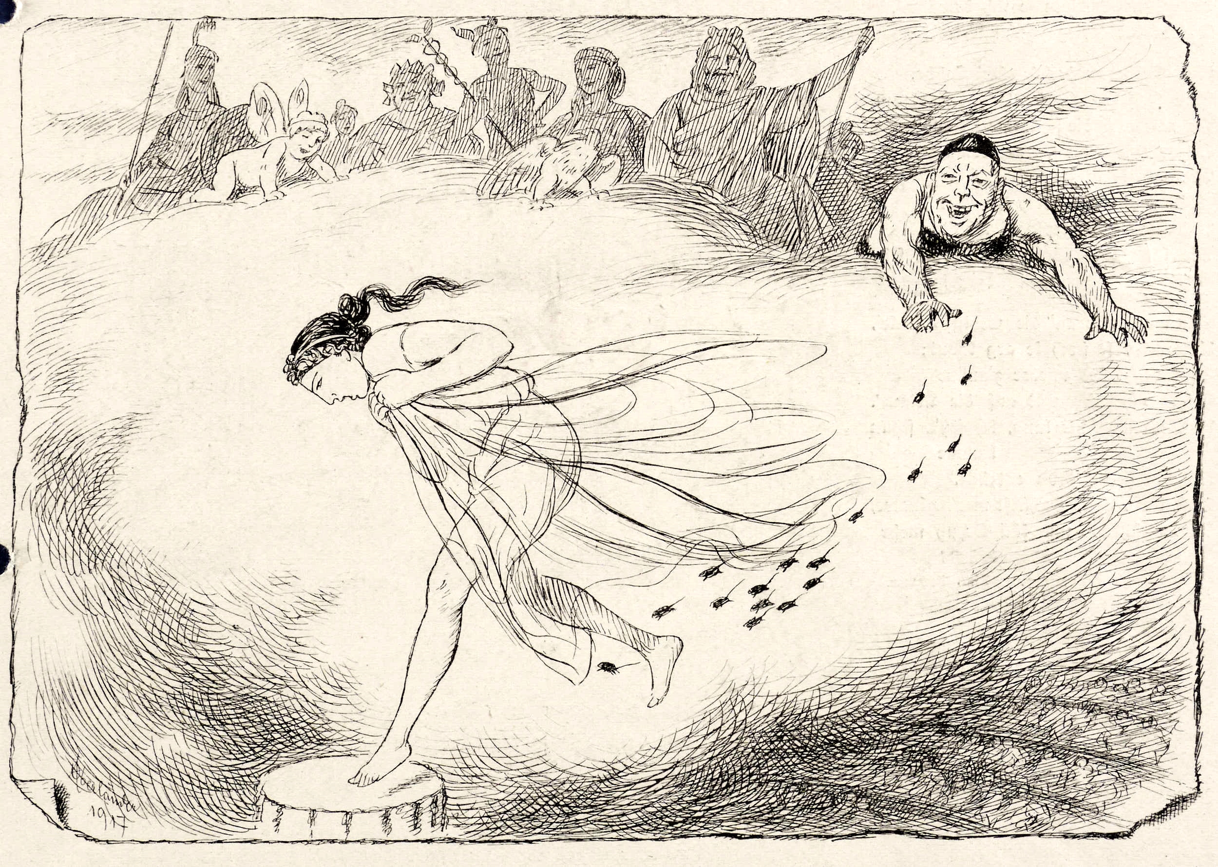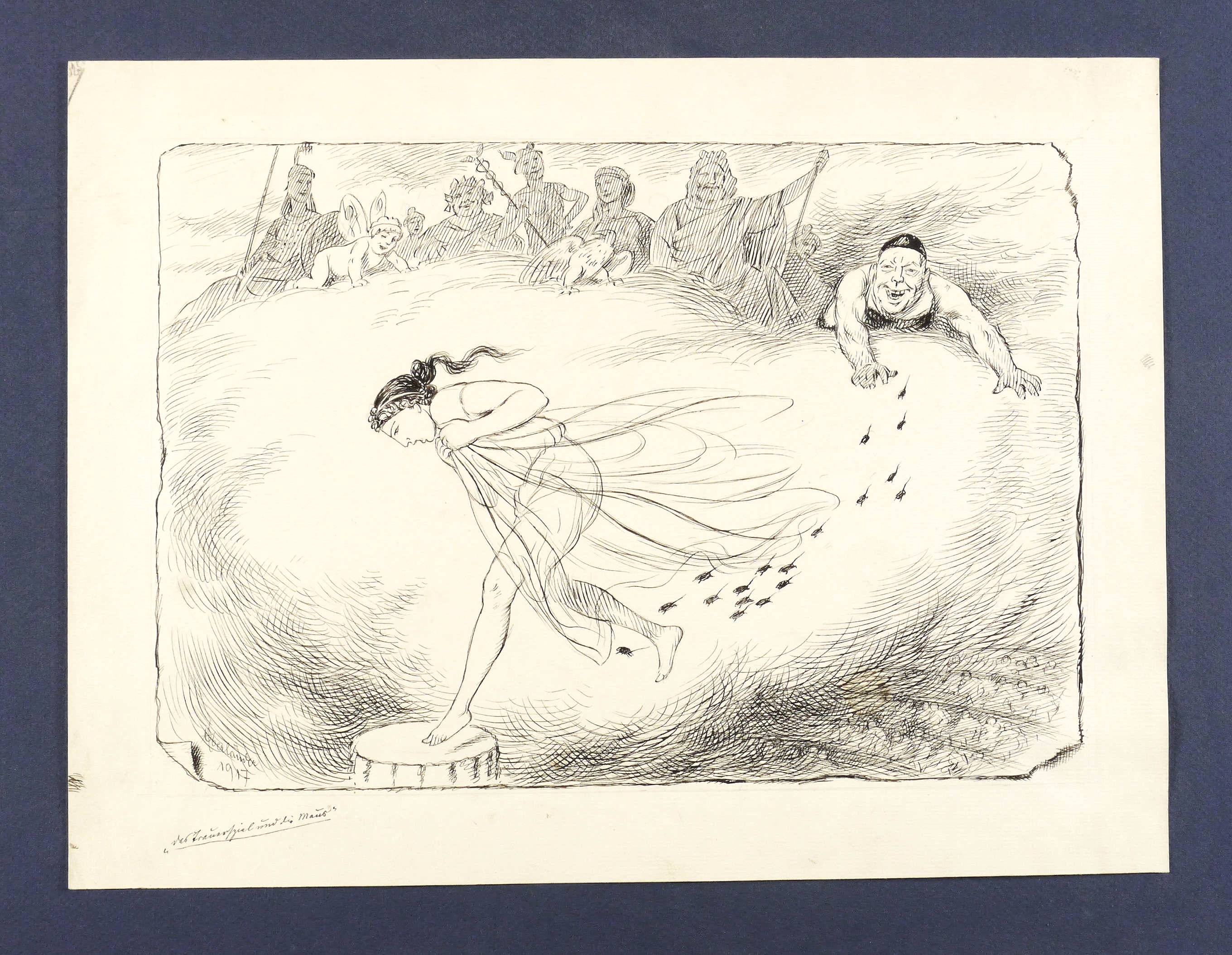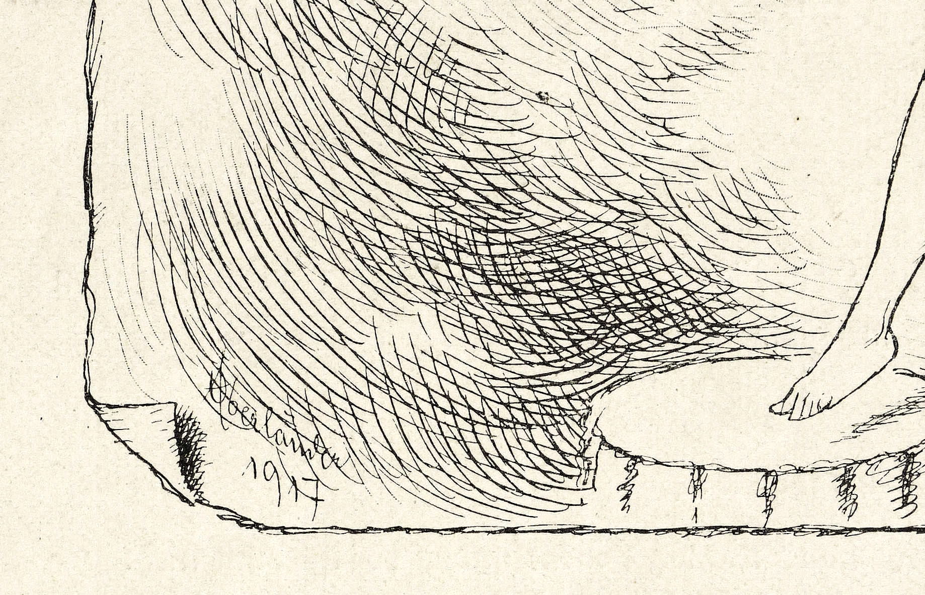 1917. Zeichnung / Federzeichnung, in Schwarz, auf glattem Büttenkarton. – Originale Künstlergrafik, von Adolf Oberländer. – Unikat. – 22,7 x 32,7 cm (Darstellung), 29 x 38,5 cm (Blatt).