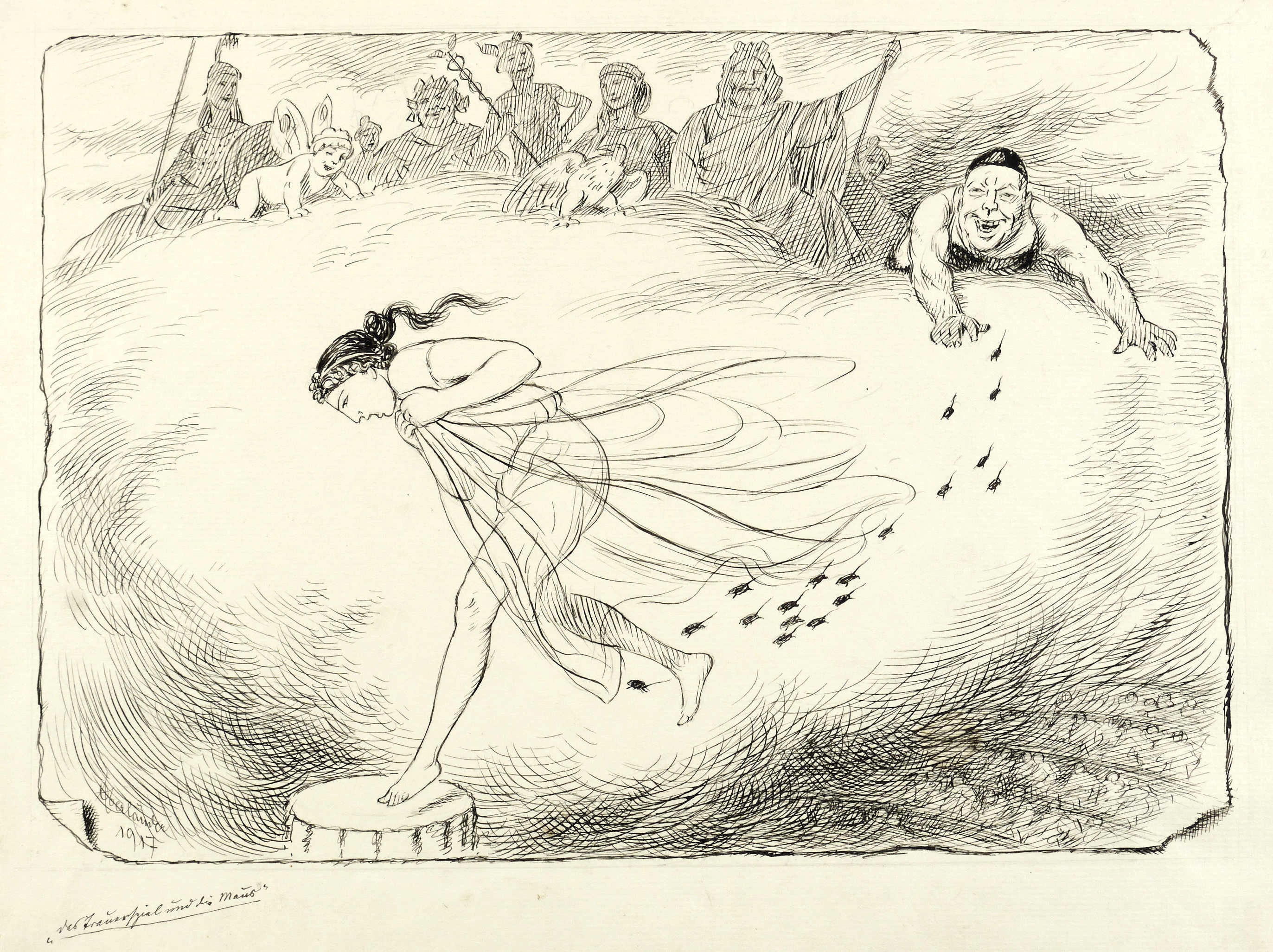 In der Darstellung links unten in schwarzer Feder signiert und datiert: ″AOberländer 1917″. Darunter bezeichnet: ″Das Trauerspiel und die Maus″. Verso in Bleistift bezeichnet. Dazu Stempel: ″ausgestellt - 1. MRZ. 1919″. – Humoristisches Bühnengeschehen, bei dem der olympische Schmied Hepaistos den Auftritt der Liebesgöttin mit einer Schar Mäuse zu hintertreiben sucht. - Beiliegend Druckseite eines Magazins mit der entsprechenden Illustration bzw. Reproduktion der Zeichnung. – Rückseitig leichte Montagereste in den Ecken. Rechts unten leichte Druckspuren. Insgesamt guter Zustand.