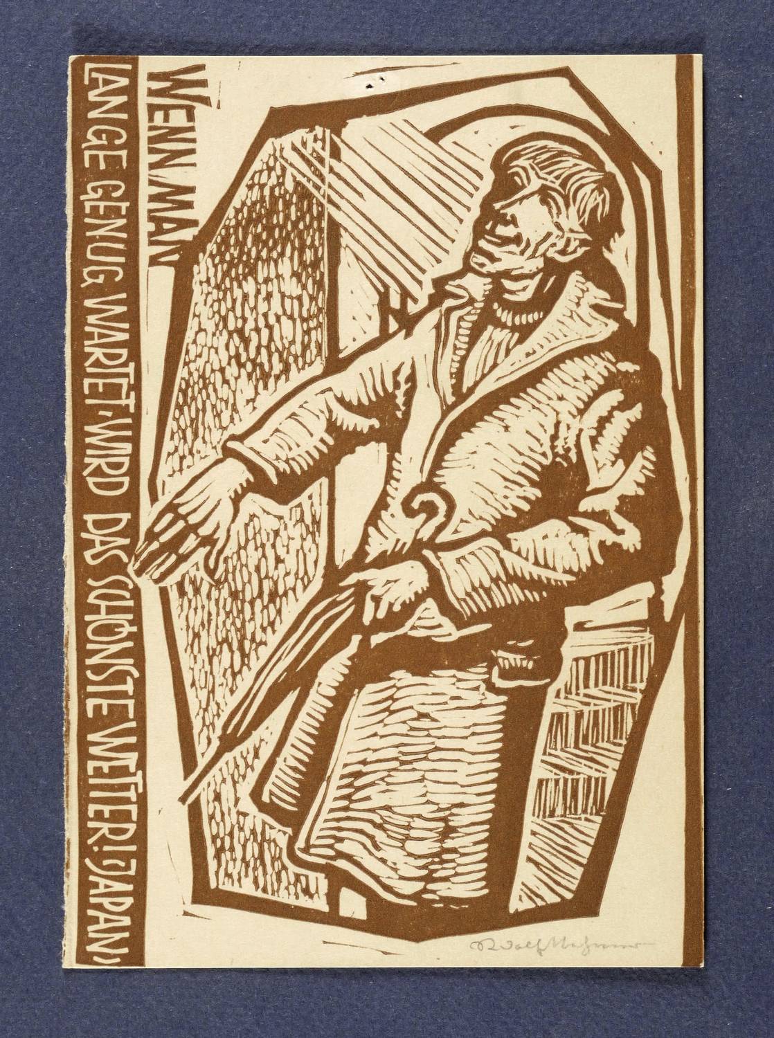 Rechts unten in Bleistift signiert. Im Holzstock Inschrift. Verso in Kugelschreiber Widmung des Künstlers mit Signatur. – Japanisches Sprichwort. – Papier leicht gegilbt. Guter Zustand.