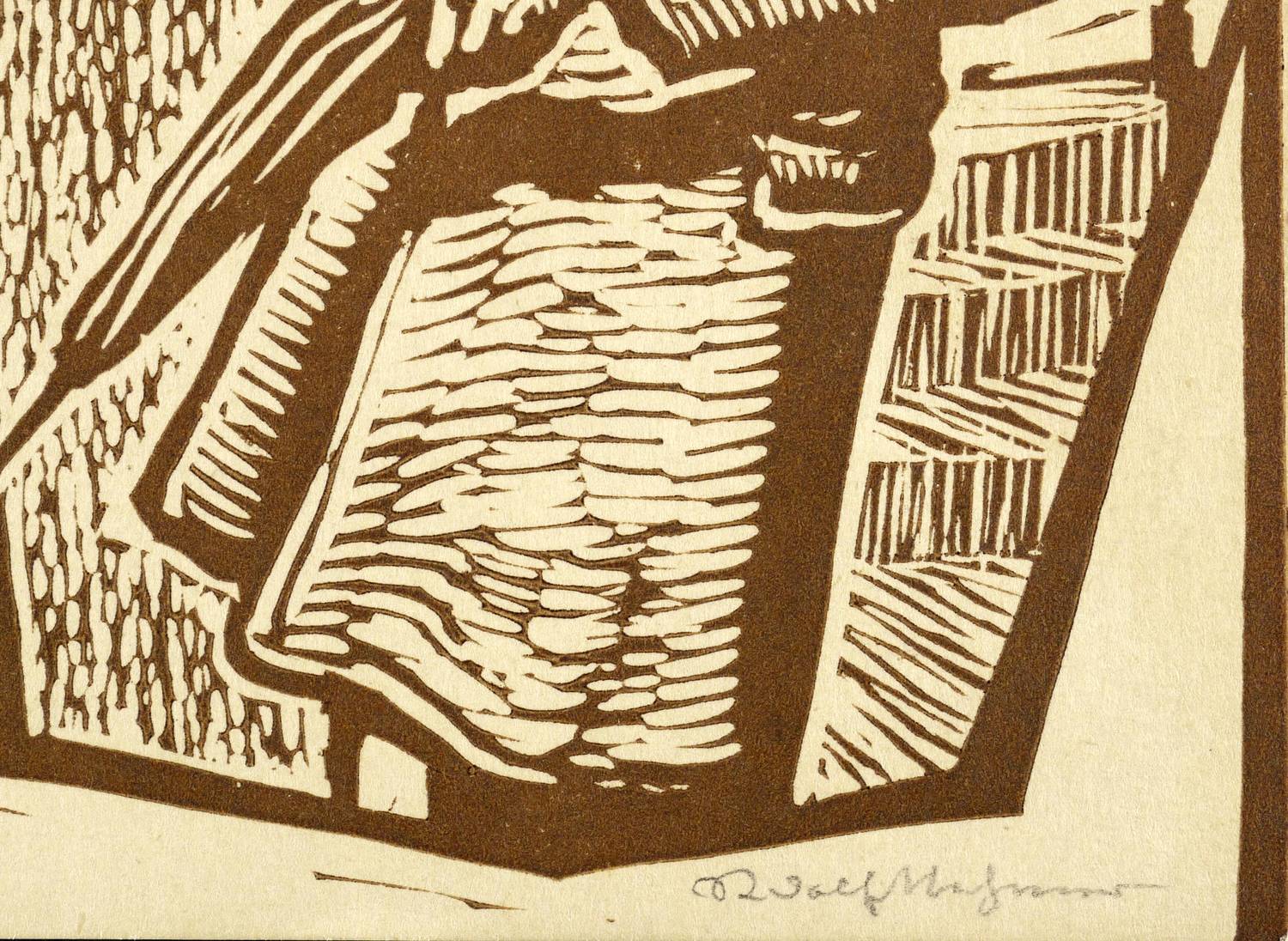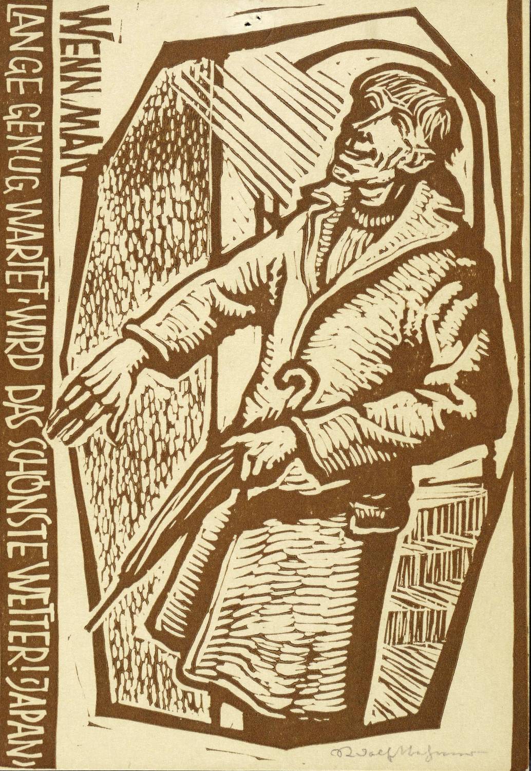 1981. Holzschnitt, in Braun, auf hellgelbem Karton. – Originale Künstlergrafik, von Rudolf Nehmer. – 15,9 x 11,0 cm (Darstellung / Blatt).
