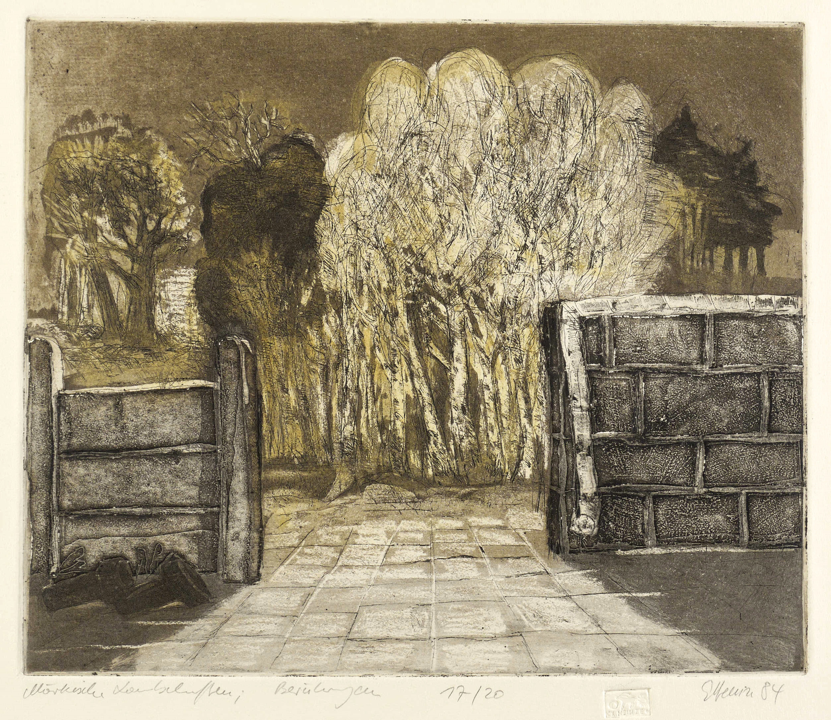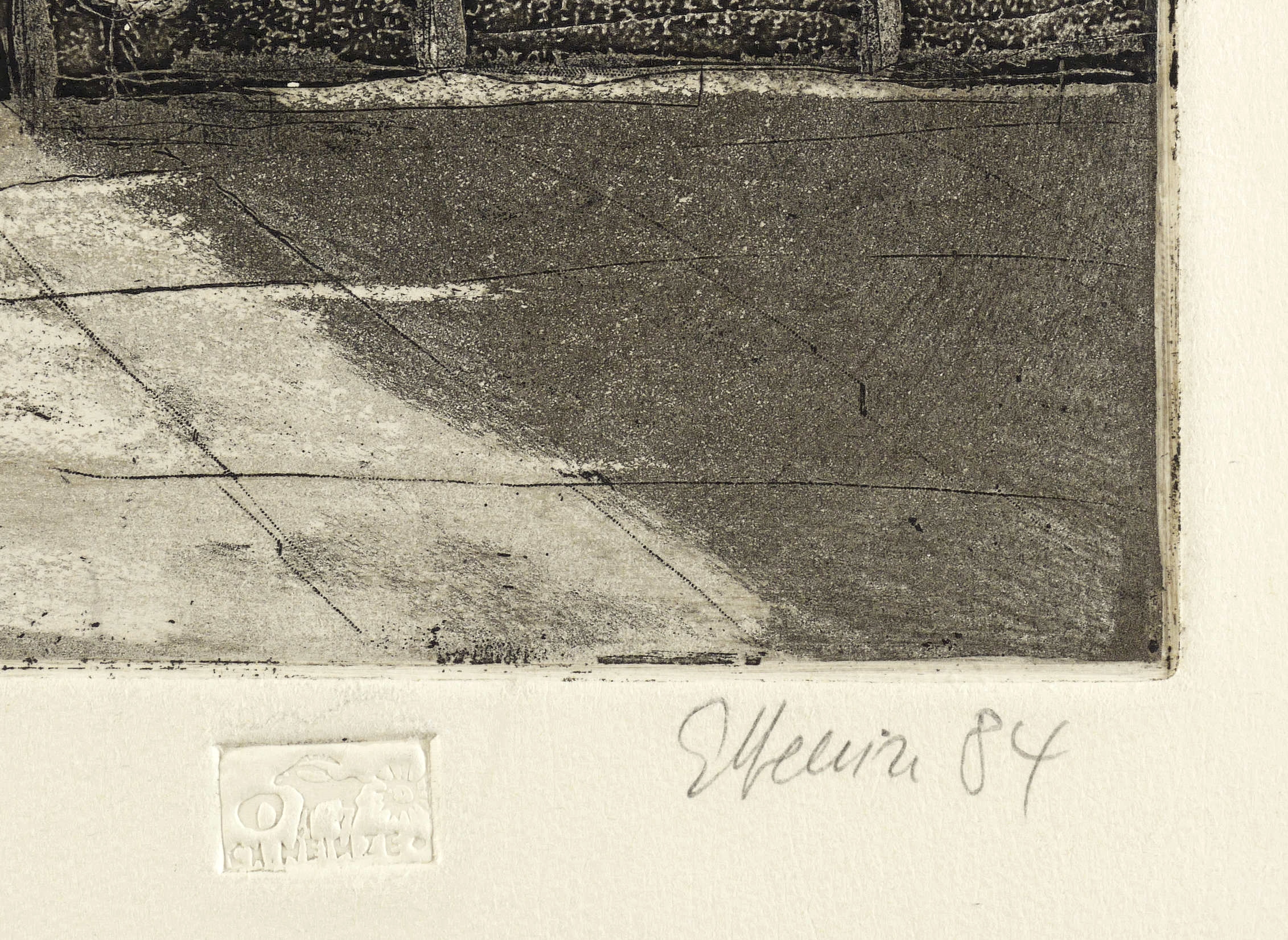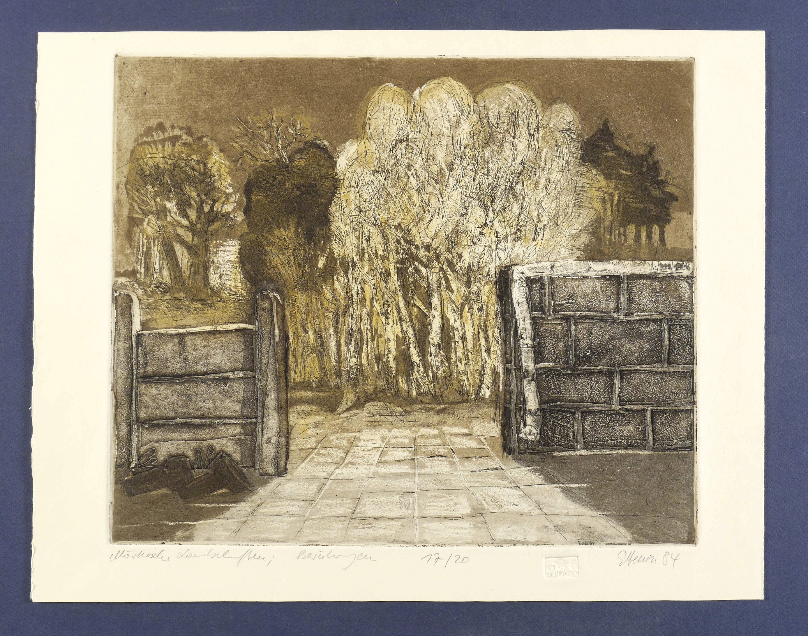 1984. Farbradierung / Aquatinta & Reservage, in Ocker & Schwarz, auf schwerem chamois Büttenpapier. – Von Christian Heinze. – Auflage Exemplar Nr. 17/20. – 32,2 x 38,5 cm (Darstellung / Platte), 37,5 x 48 cm (Blatt).