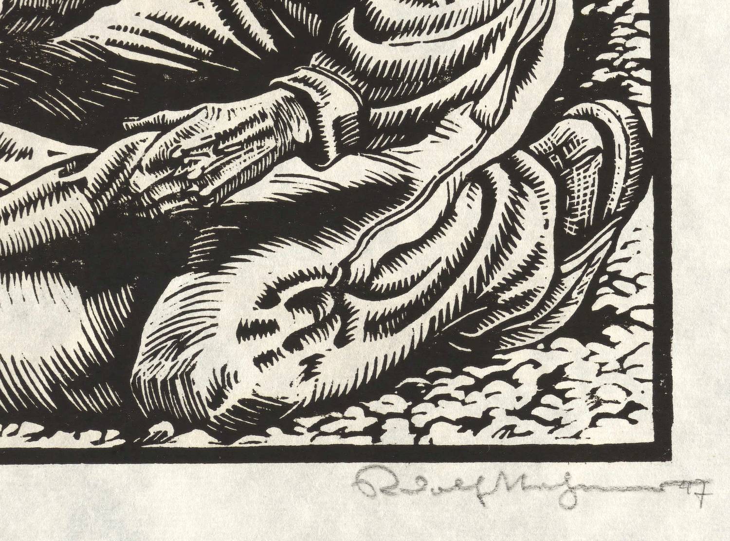 1947. Holzschnitt, in Schwarz, auf rauem weißlichem Japanbütten. – Originale Künstlergrafik, von Rudolf Nehmer. – 19,8 x 17,5 cm (Darstellung / Druckstock), 41 x 28 cm (Blatt).