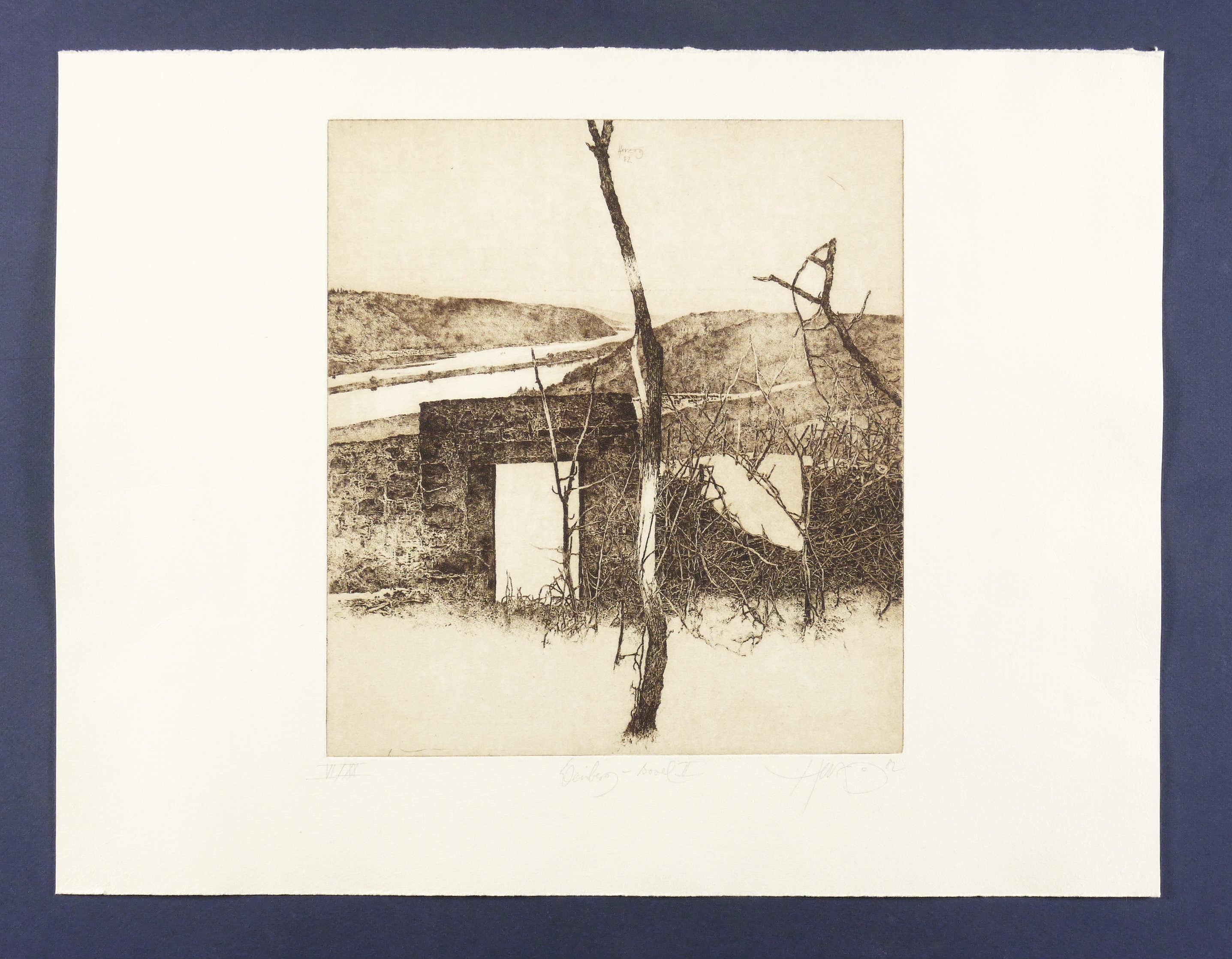 1982. Radierung / Strichätzung, mit Plattenton, in Schwarzbraun, auf Karton. – Originale Künstlergrafik, von Walter Herzog. – Auflage Exemplar Nr. VI/XX. – 29,8 x 27,0 cm (Darstellung / Platte), 40 x 52 cm (Blatt).