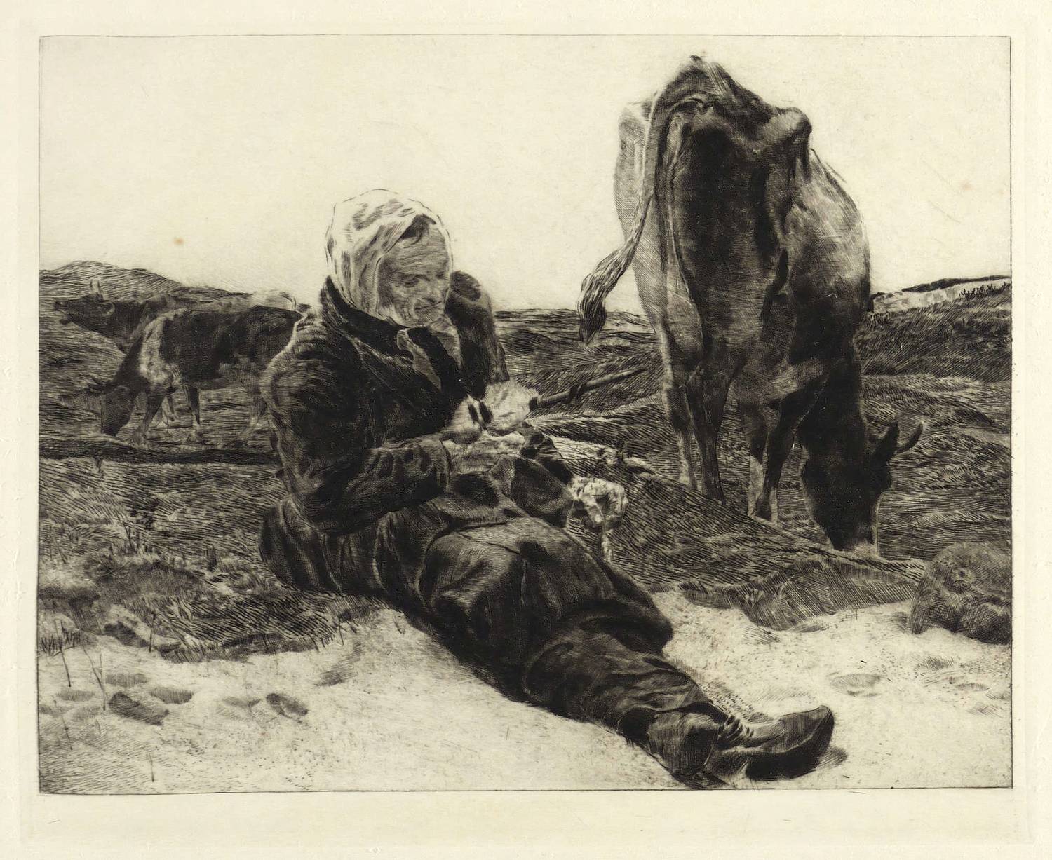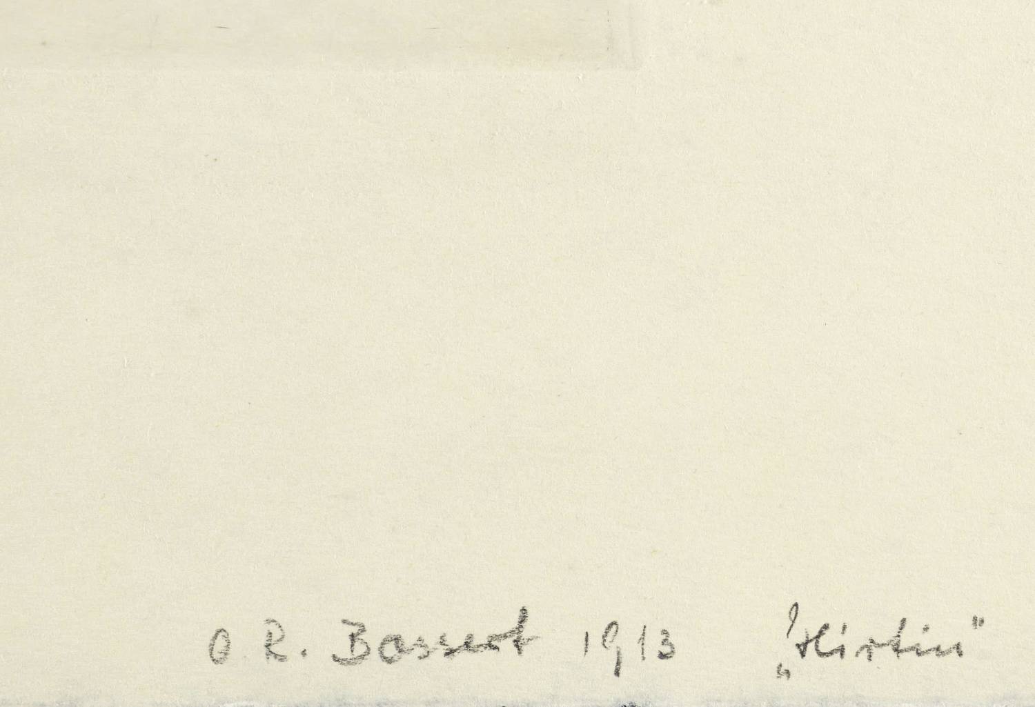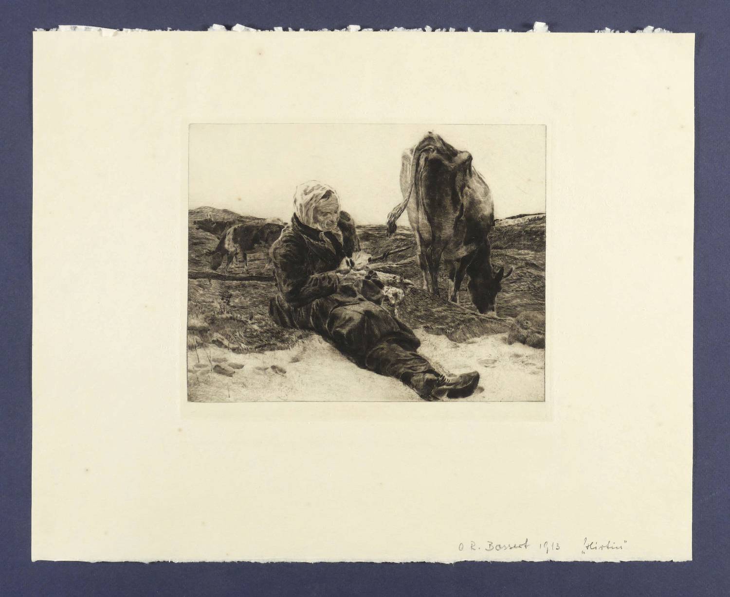 Aus: Freunde graphischer Kunst. Jahresgabe I (Leipzig: 1913). – Rechts unten in Bleistift bezeichnet: ″OR. Bossert 1913 'Hirtin'″. – Durchgehend etwas fleckig (vermutlich Eiseneinschluss). Sonst noch schön erhalten.