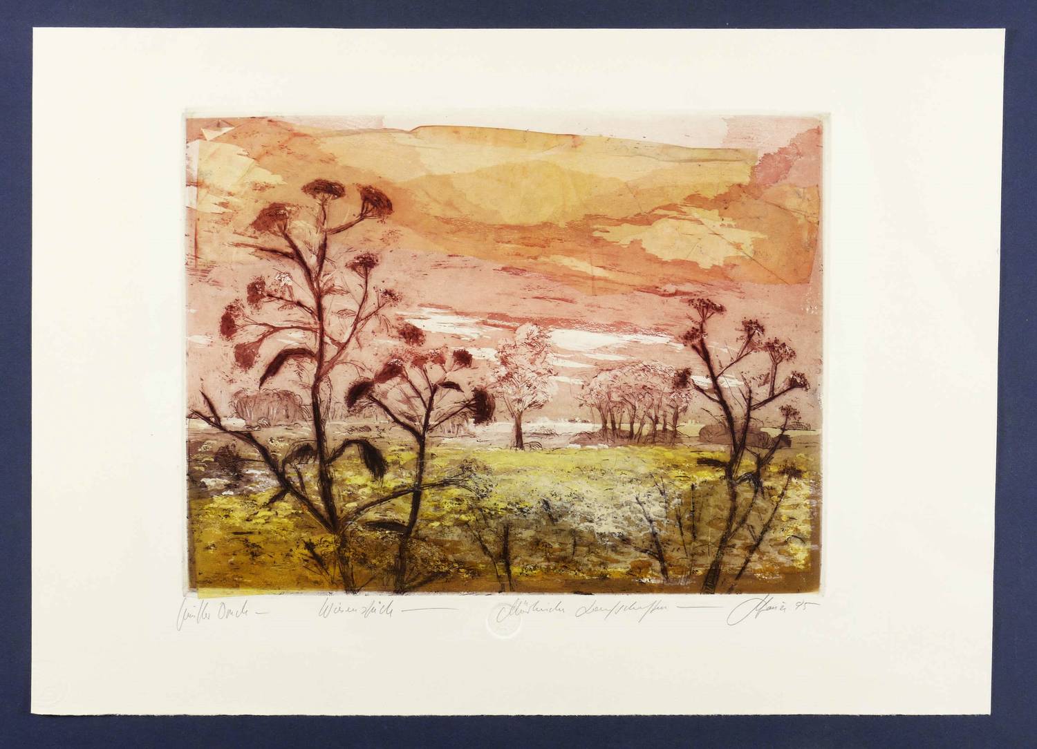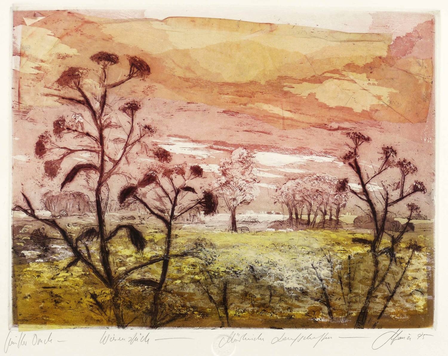 1995. Farbradierung / Aquatinta, Reservage & Strichätzung, in 4 Farben, auf hellchamois Büttenkarton. – Originale Künstlergrafik, von Christian Heinze. – Unikate Farbvariante. – 30,50 x 40,2 cm (Darstellung / Platte), 43,5 x 61 cm (Blatt).