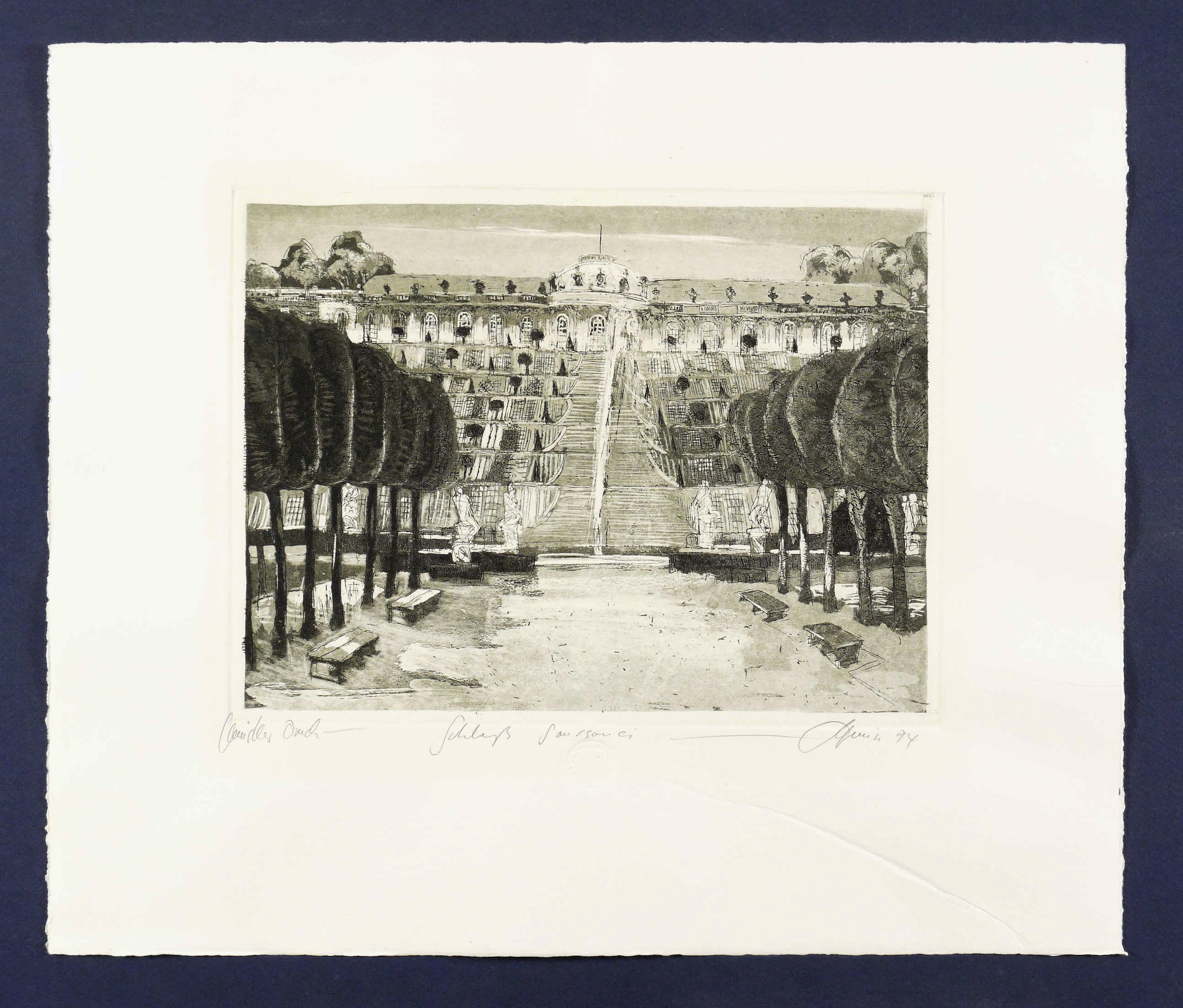 Rechts unten in Bleistift signiert und datiert. Links Auflagenbezeichnung. Mittig Titel und Trockenstempel des Künstlers. – Im unteren Rand Quetschfalte aus dem Druckvorgang. Verso leichte Montagespuren. Sonst guter Zustand.
