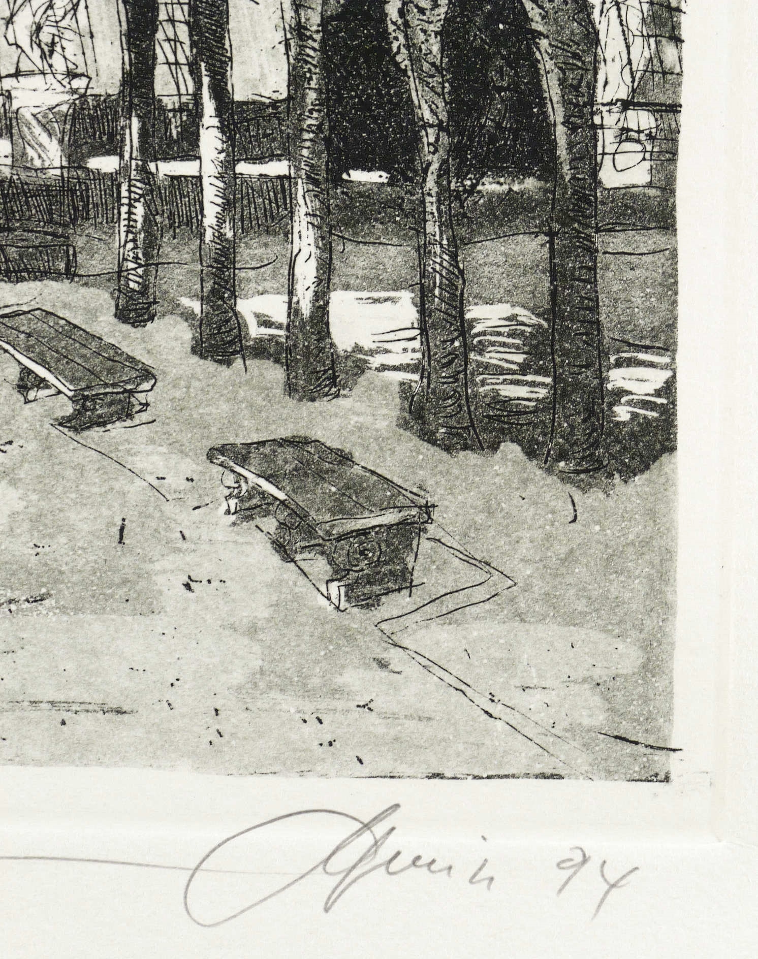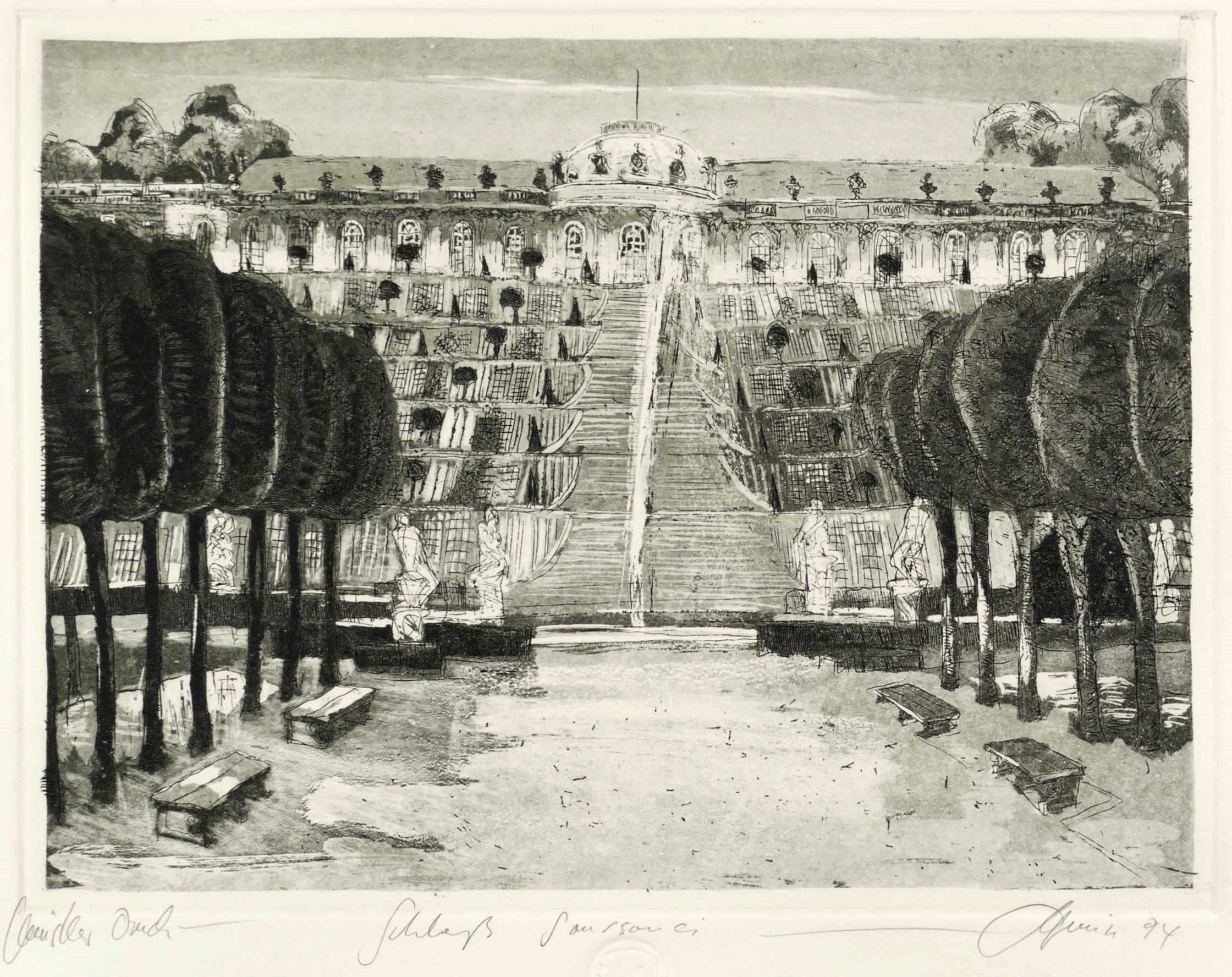 1994. Radierung / Aquatinta & Strichätzung, in Schwarz, auf hellchamois Büttenkarton. – Originale Künstlergrafik, von Christian Heinze. – Künstlerexemplar (e.a.). – 21,3 x 28,5 cm (Darstellung), 22, x 29,9 cm (Platte), 38,5 x 45 cm (Blatt).