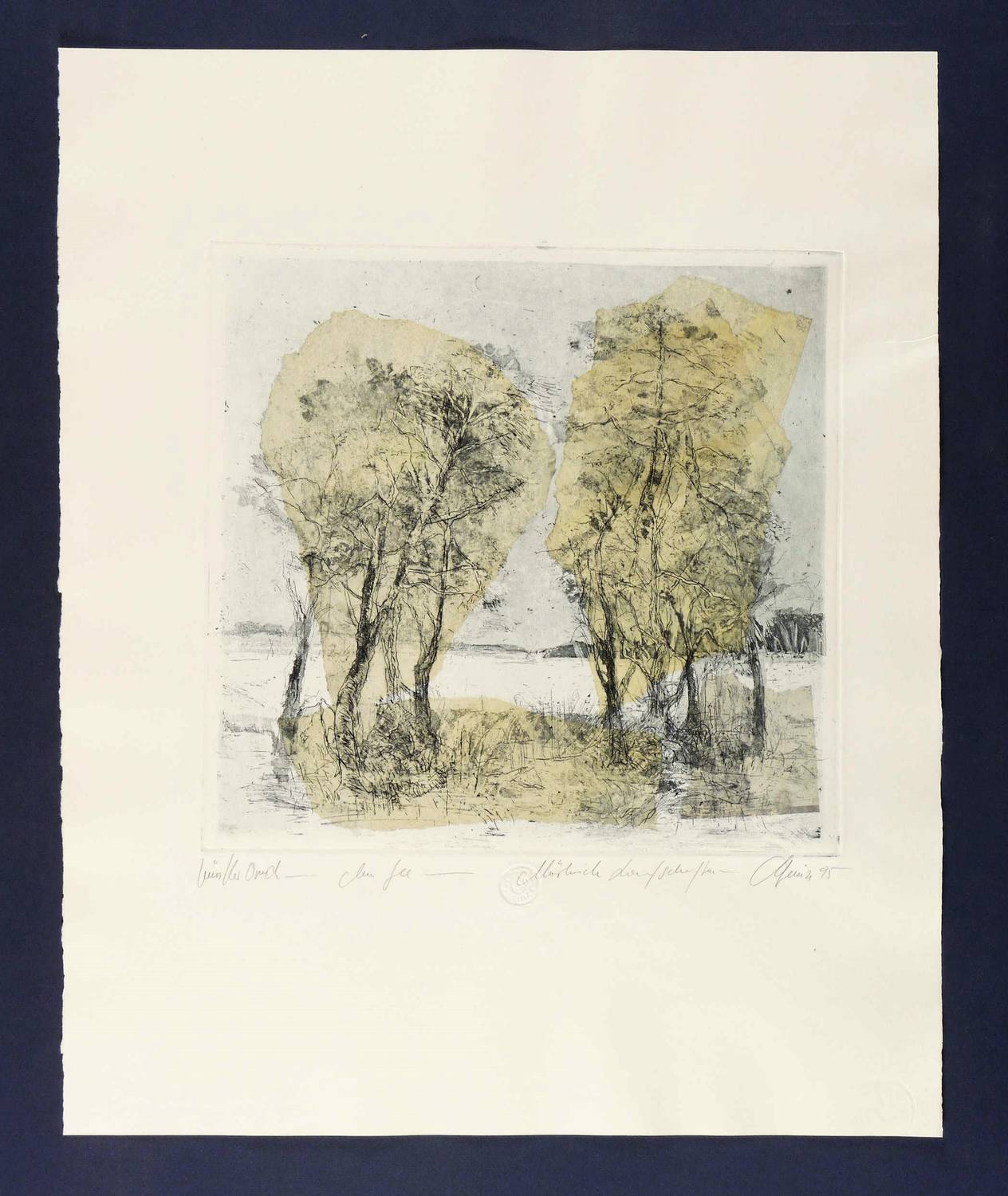 1995. Farbradierung / Aquatinta & Strichätzung, in Blau, Ocker & Schwarz, auf hellem Hahnemühle-Bütten. – Originale Künstlergrafik, von Christian Heinze. – Unikate Farbvariante. – 31,0 x 31,9 cm (Darstellung), 32,1 x 33,5 cm (Platte), 58 x 47 cm (Blatt).