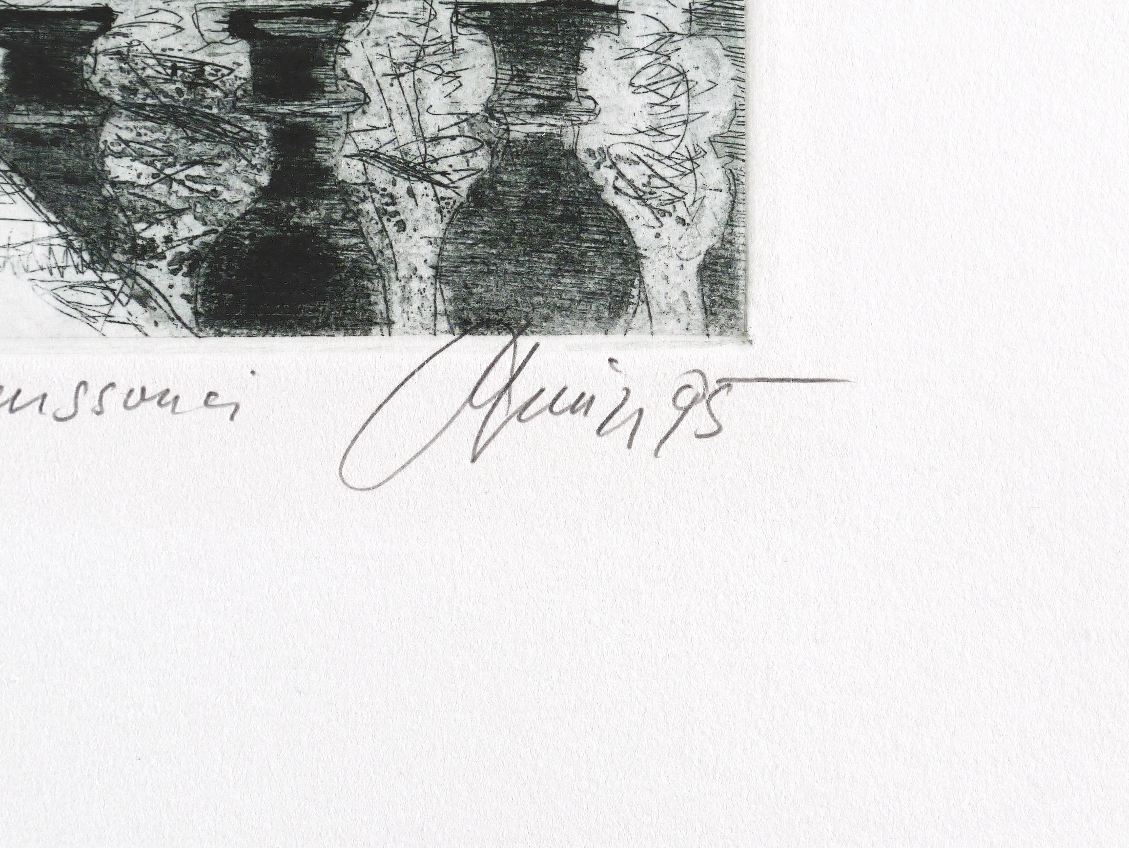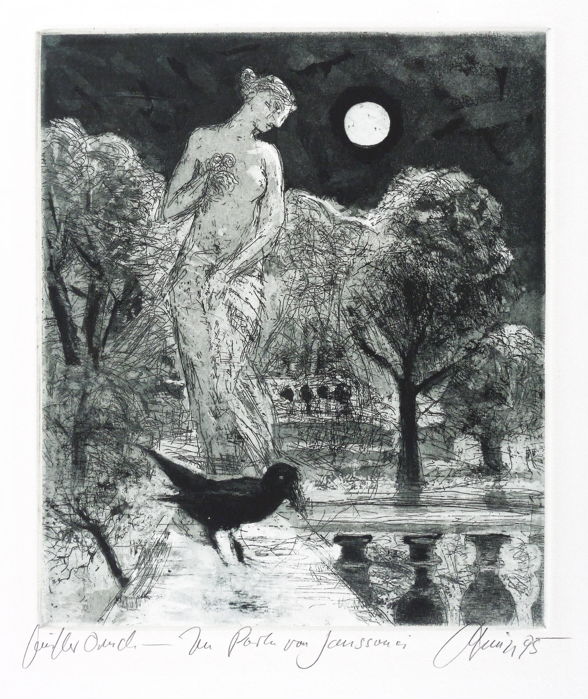 1995. Farbradierung / Aquatinta & Strichätzung, in Braun & Schwarz, auf gelbem Büttenkarton. – Von Christian Heinze. – Künstlerexemplar (e.a.). – 20,7 x 17,7 cm (Darstellung / Platte), 37 x 27 cm (Blatt).