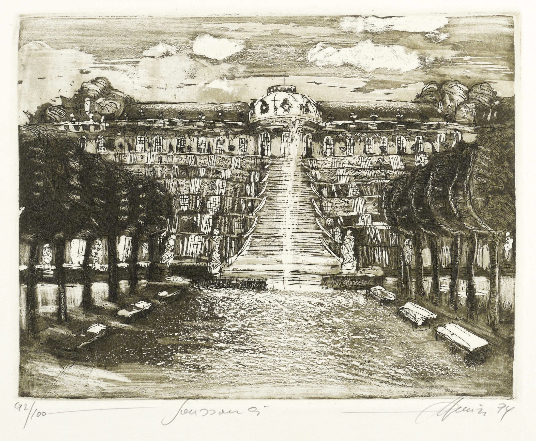 1994. Radierung / Aquatinta & Strichätzung, in Schwarz, auf hellem Büttenkarton. – Originale Künstlergrafik, von Christian Heinze. – Auflage Exemplar Nr. 92/100. – 15,1 x 19,7 cm (Darstellung / Platte), 28,5 x 28,5 cm (Blatt).