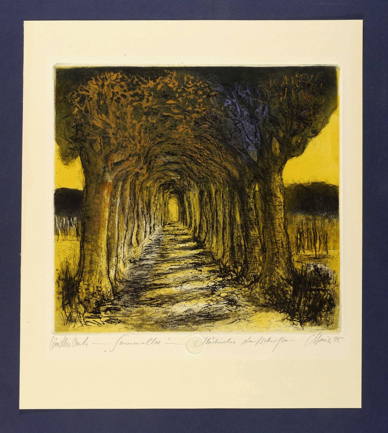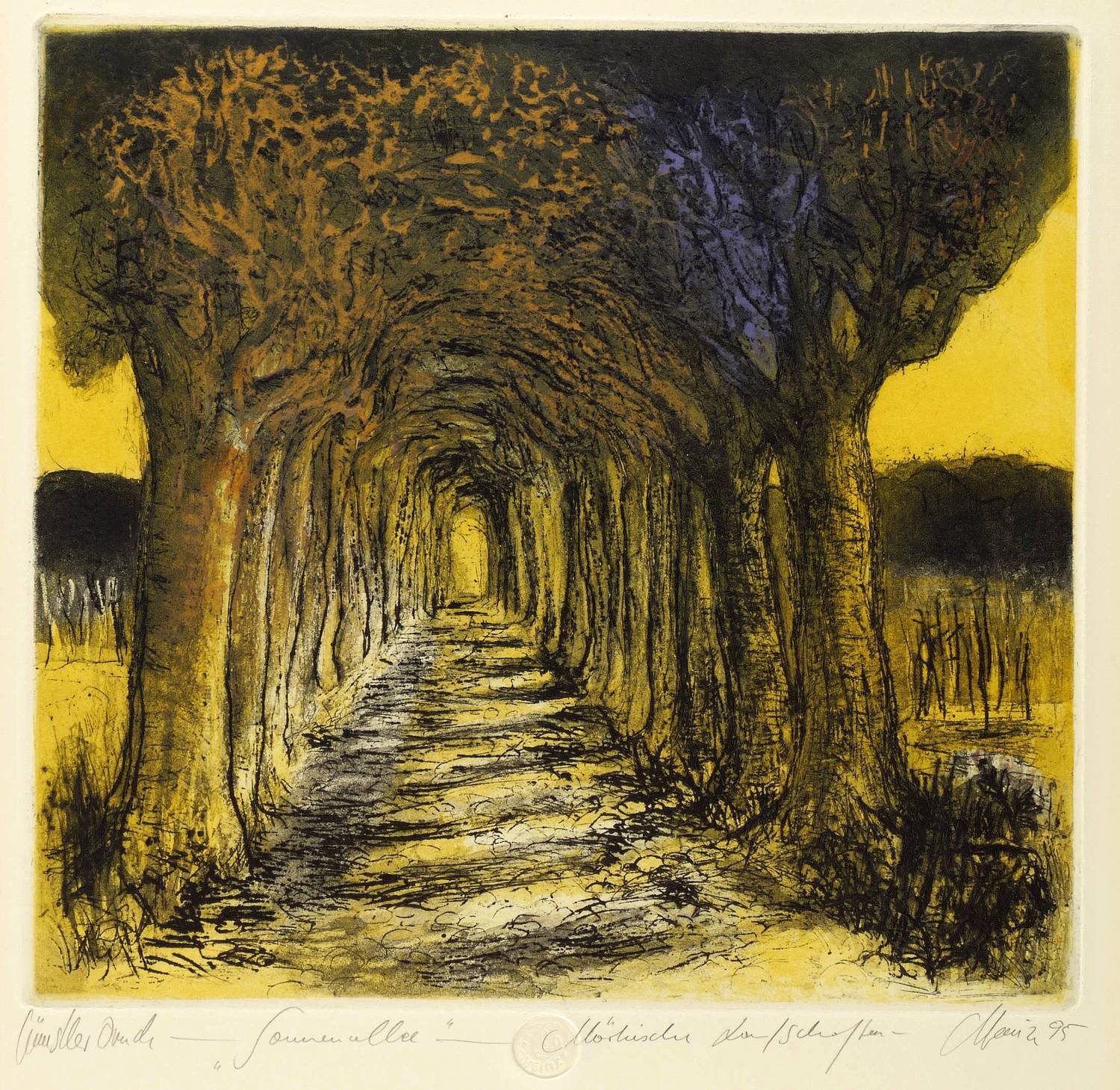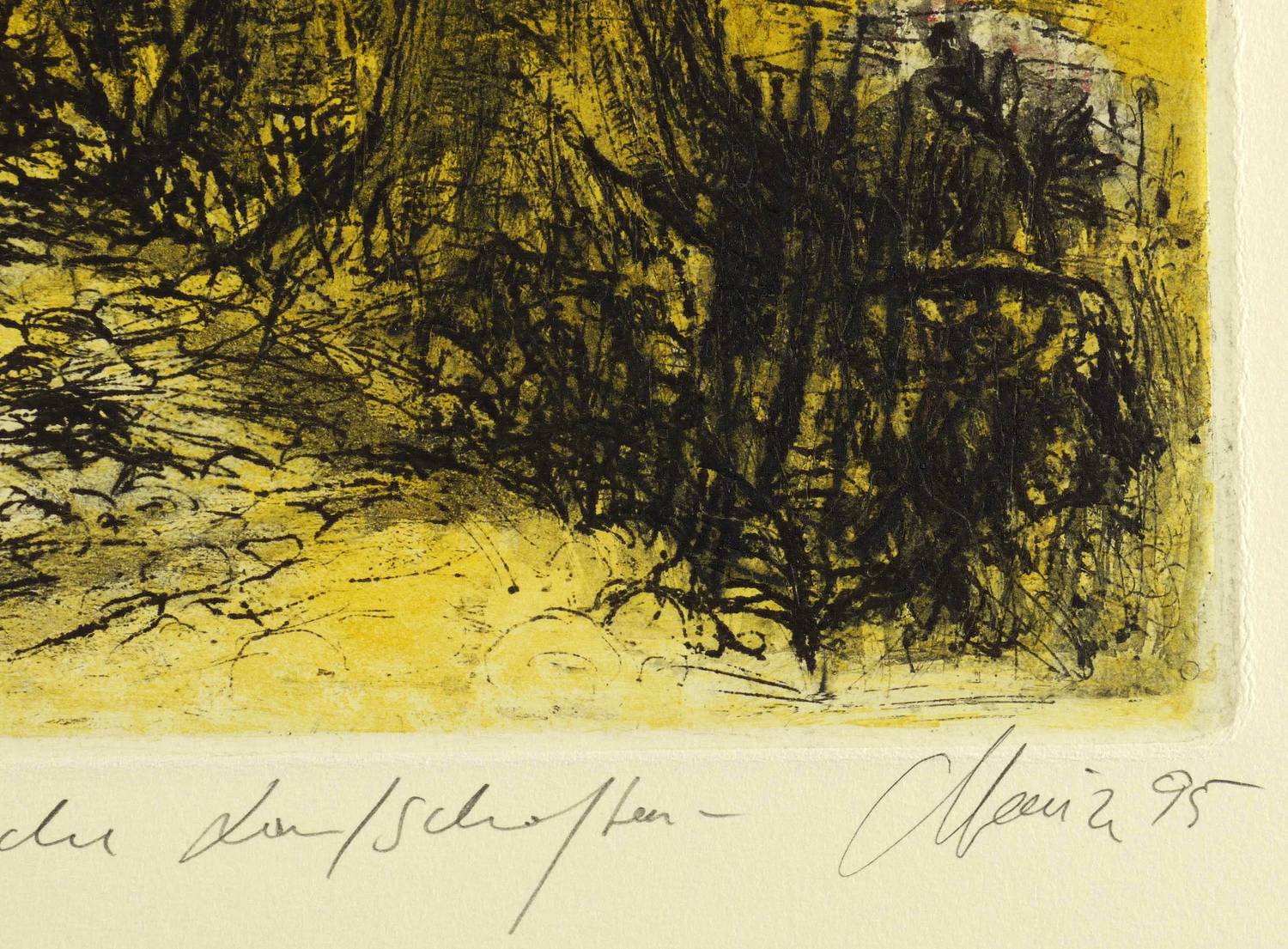 1995. Farbradierung / Aquatinta & Reservage, in 5 Farben, auf gelbem Hahnemühle-Karton. – Von Christian Heinze. – Unikate Farbvariante. – 32,5 x 34,5 cm (Darstellung / Platte), 47 x 41 cm (Blatt).