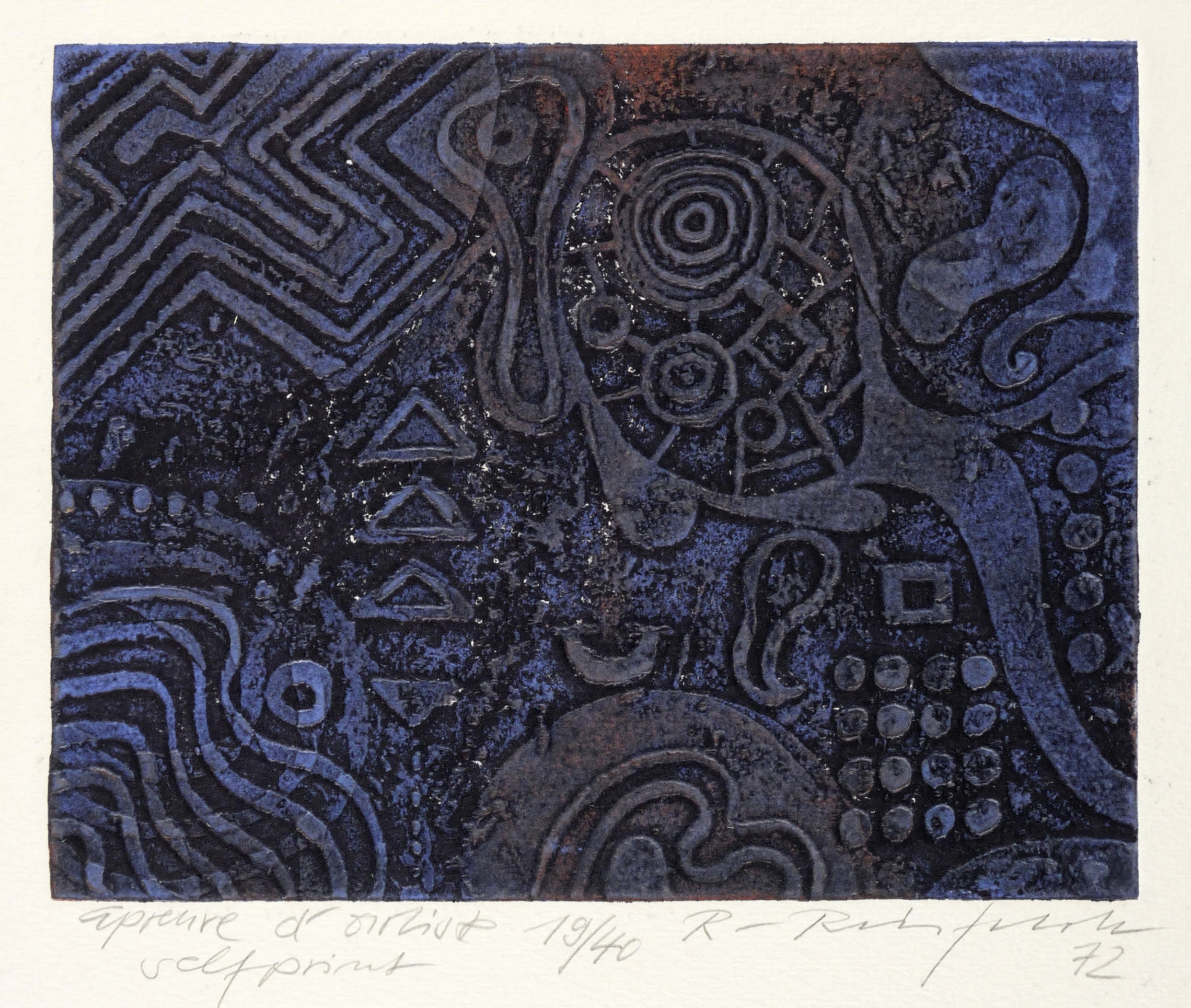 1972. Farbradierung / Reservage & Prägedruck, in 3 Farben, auf hellgelbem Karton. – Von Robert Rehfeldt. – Auflage Exemplar Nr. 19/40. – 17,2 x 21,9 cm (Darstellung / Platte), 42 x 30 cm (Blatt).
