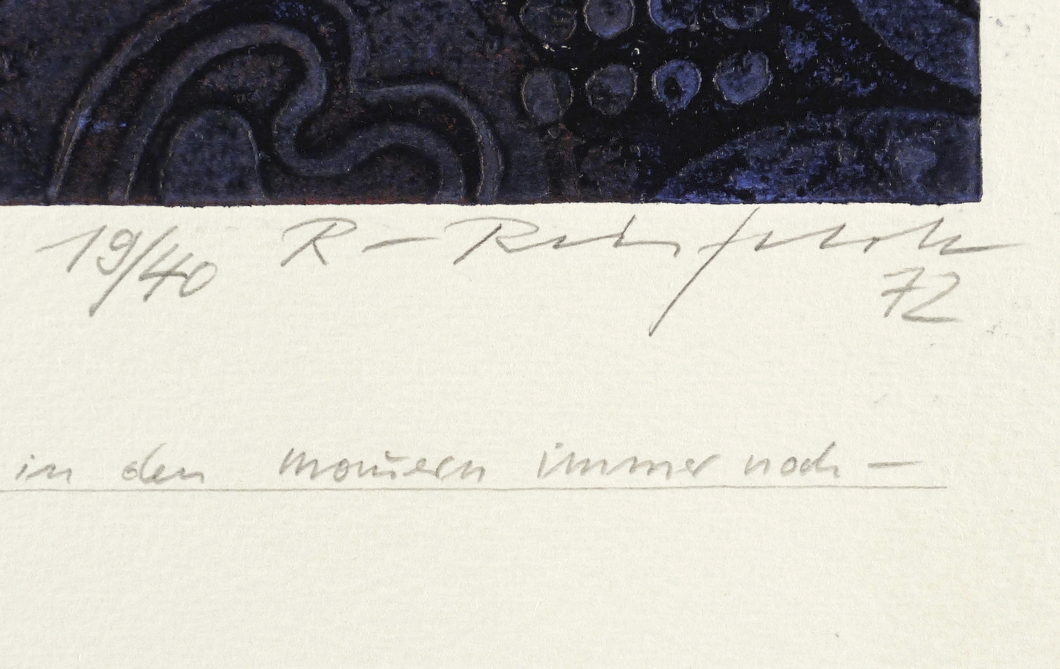 Rechts unten in Bleistift signiert und datiert. Dazu eigenhändig Titel und Auflagenbezeichnung. Am unteren Blattrand Widmung an Rudolf Franke. – Sehr gut erhalten.