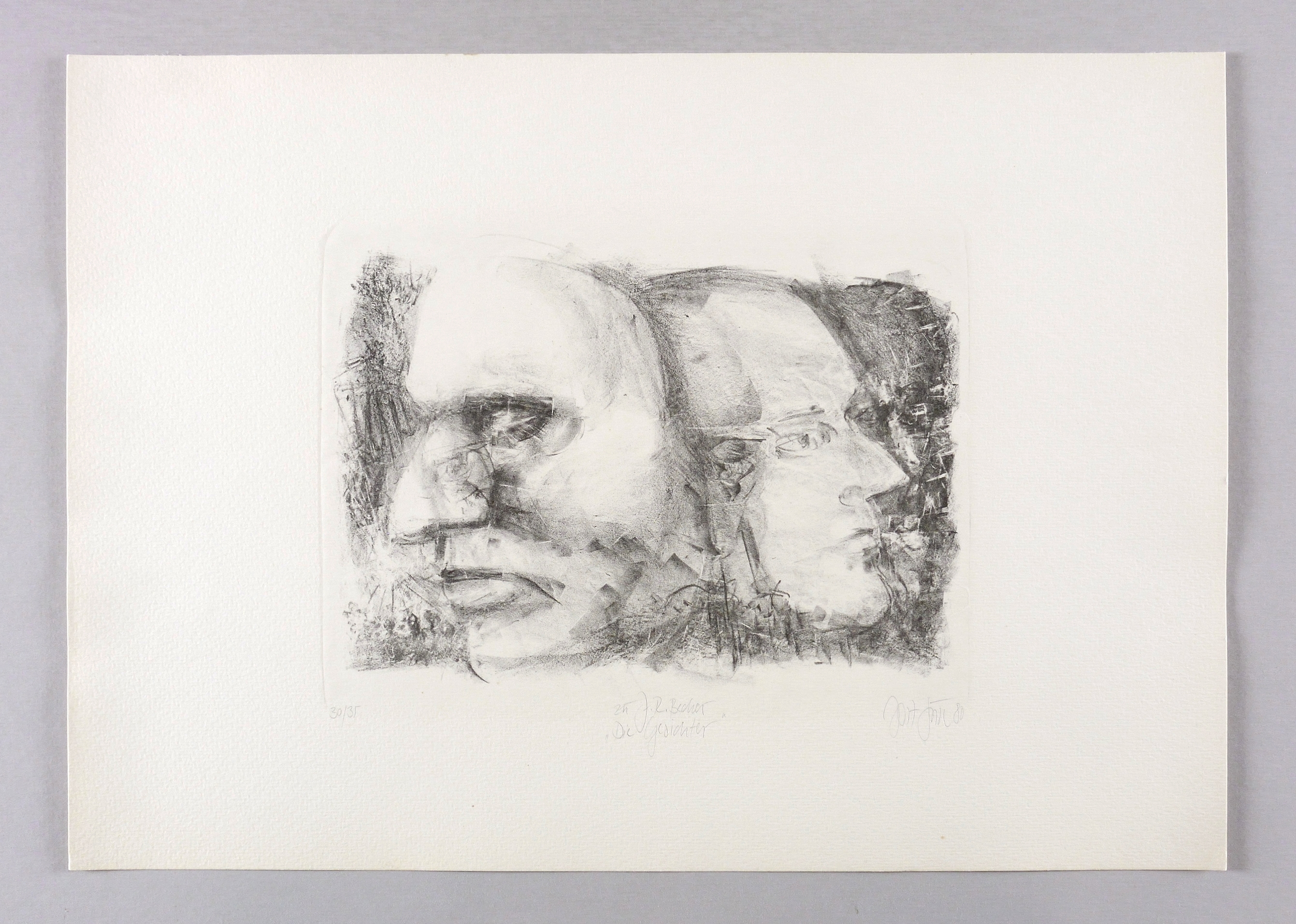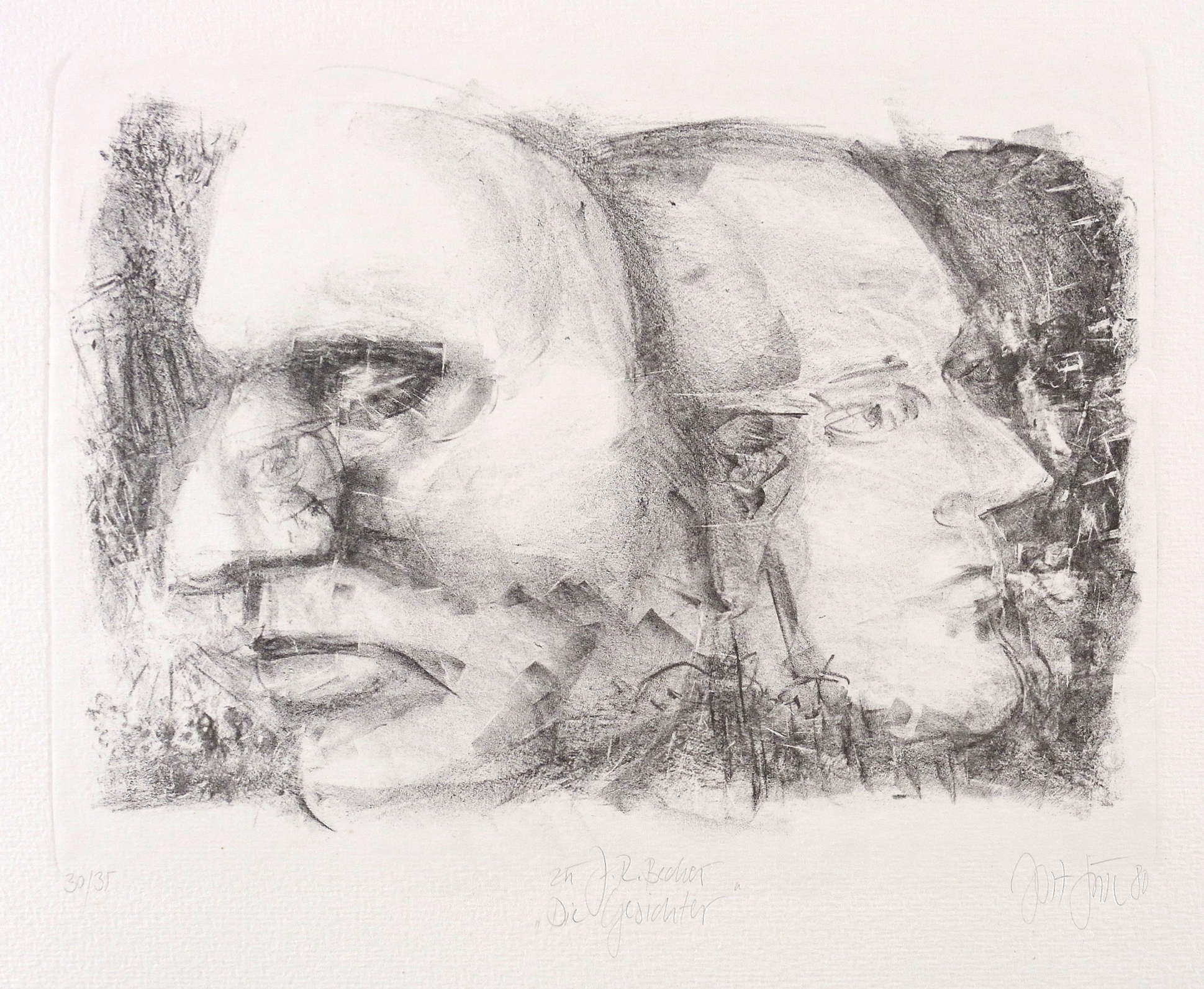 Rechts unten in Bleistift signiert und datiert: ″Jost Giese 80″. Links Auflagenbezeichnung: ″30/35″. Mittig Titel: ″zu J.R. Becher / Die Gesichter″. – Sehr guter Zustand.