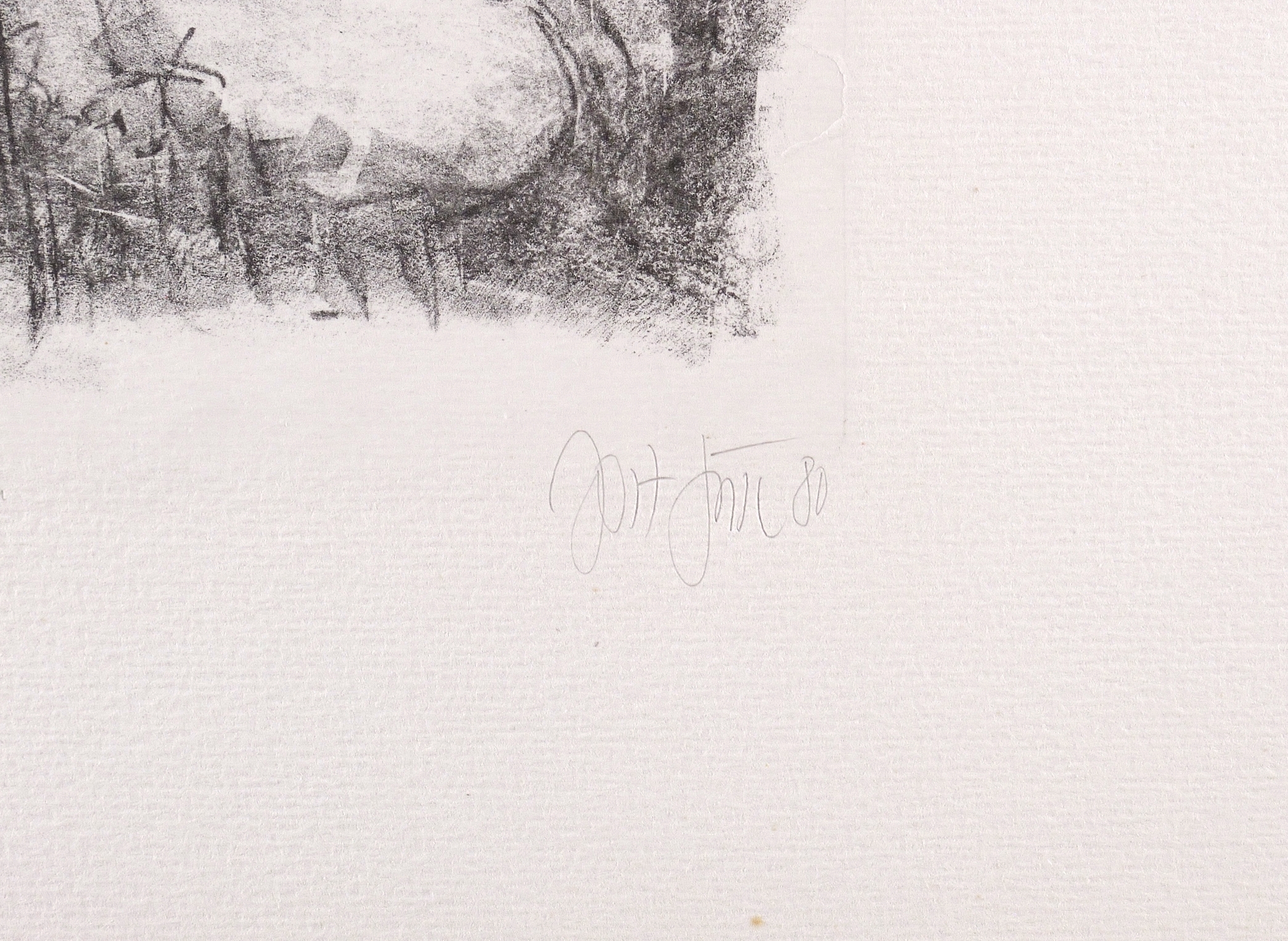 1980. Lithografie / Kreidelithografie, in Schwarz, auf hellchamois Weißenborn. – Originale Künstlergrafik, von Jost Giese. – Auflage Exemplar Nr. 30/35. – 19,5 x 26,8 cm (Darstellung / Stein), 34 x 48 cm (Blatt).