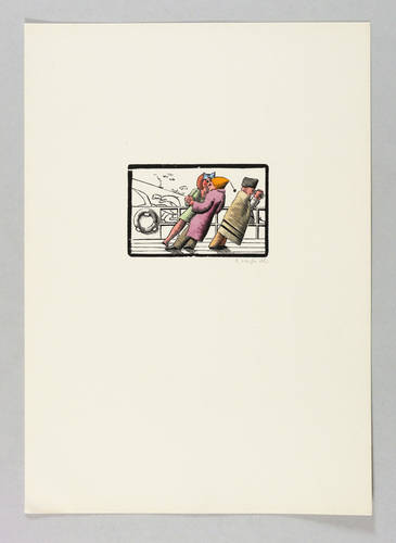 1969. Holzschnitt, in Schwarz, aquarelliert, auf glattem hellem Karton. – Originale Künstlergrafik, von Egbert Herfurth. – 5,7 x 8,5 cm (Darstellung), 30 x 21 cm (Blatt).