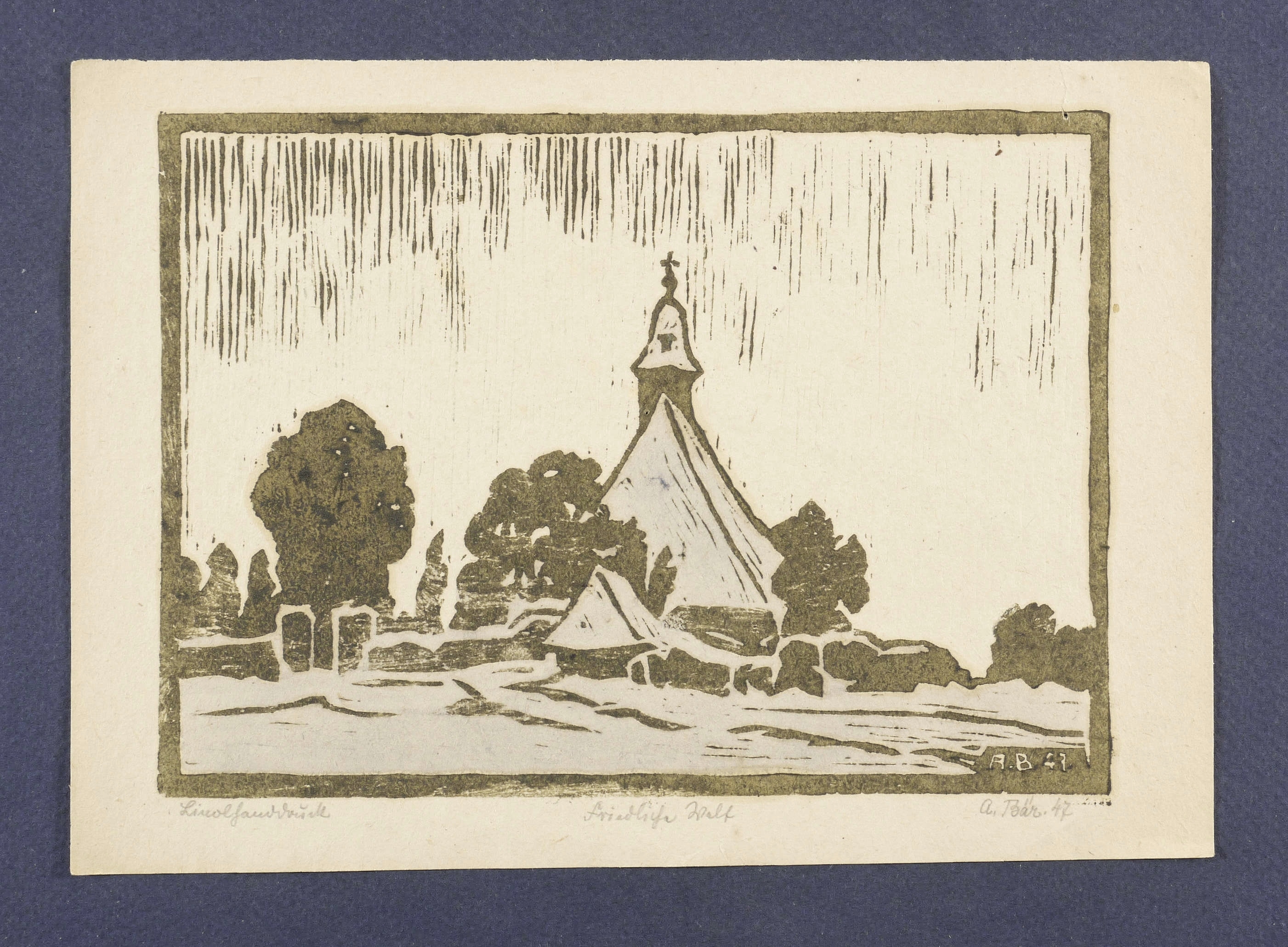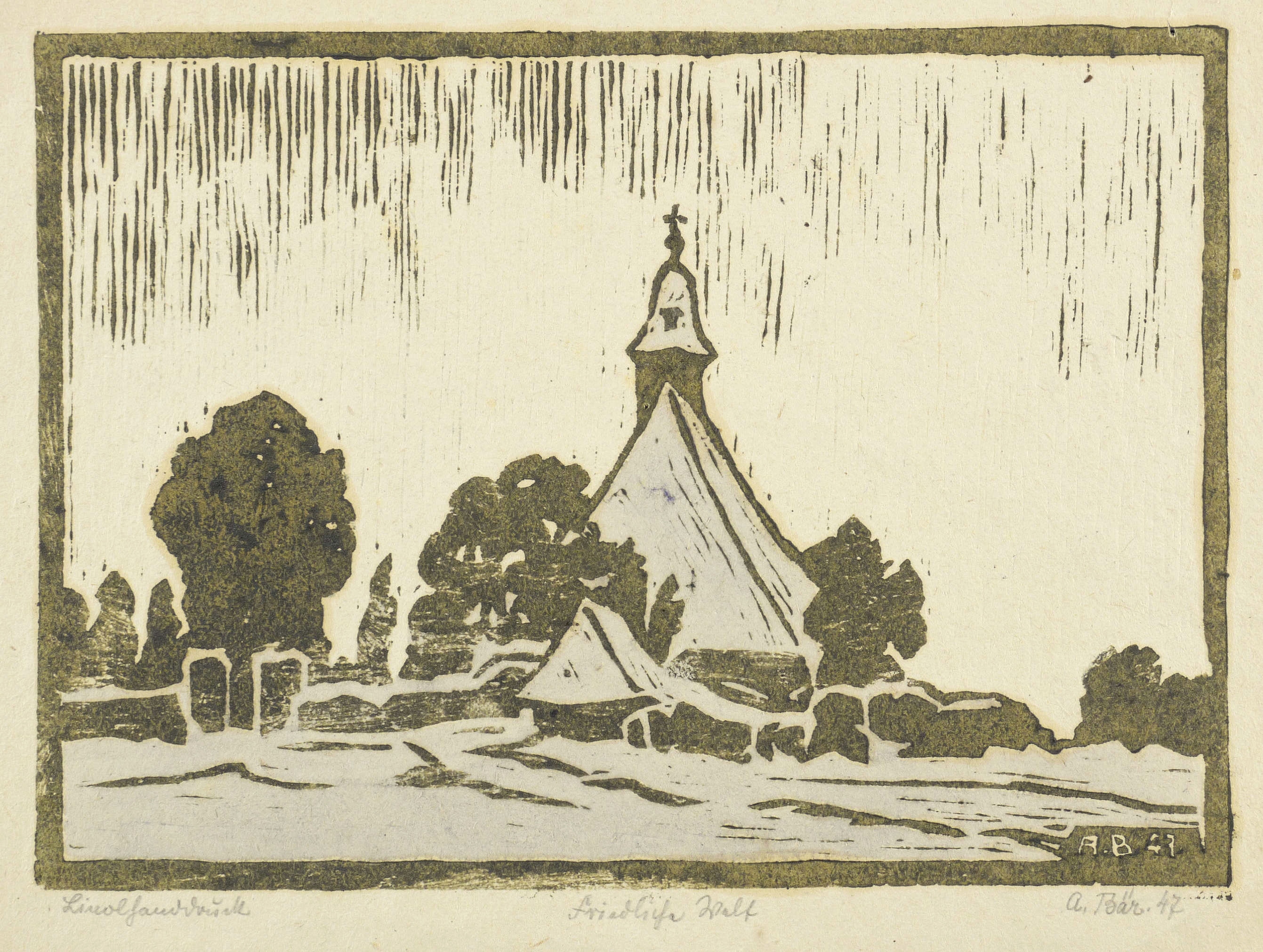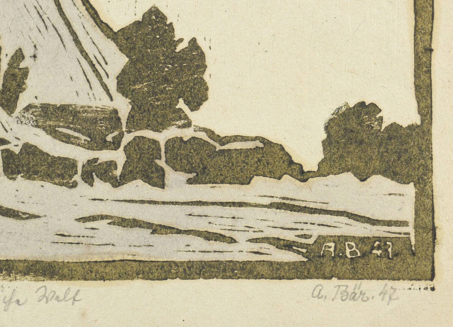 Rechts unten in Bleistift signiert und datiert: ″A. Bär 47.″ Links Technikbezeichnung, mittig Titel. Im Druckstock rechts unten nochmals Signatur und Jahr. – Papier leicht gebräunt und bisweilen leicht knickspurig. Insgesamt guter Erhaltungszustand.