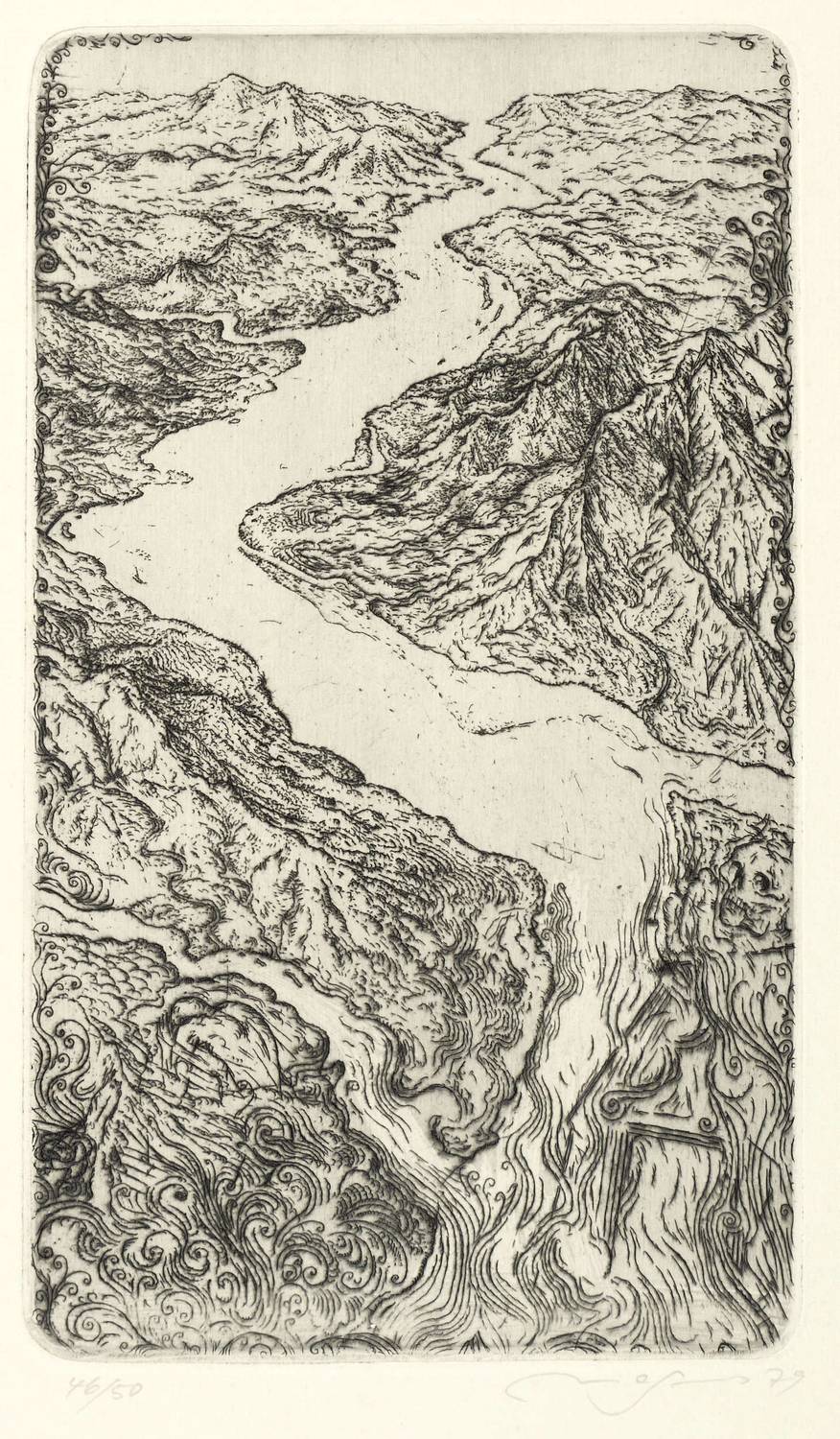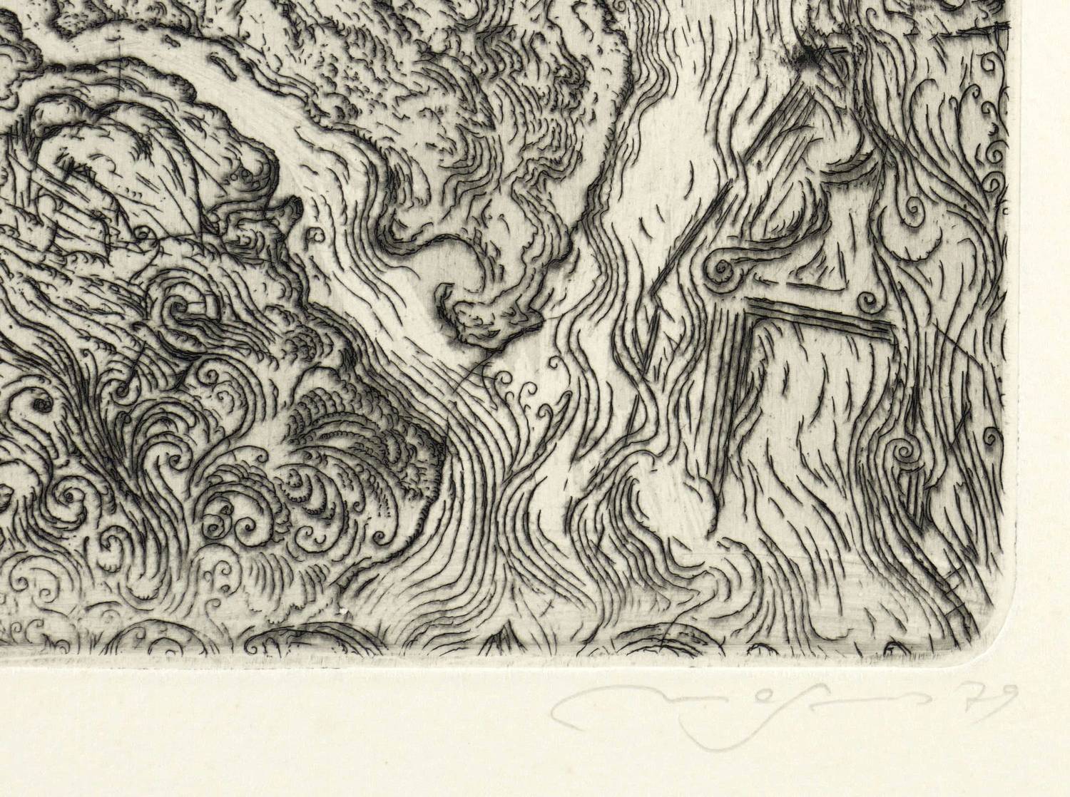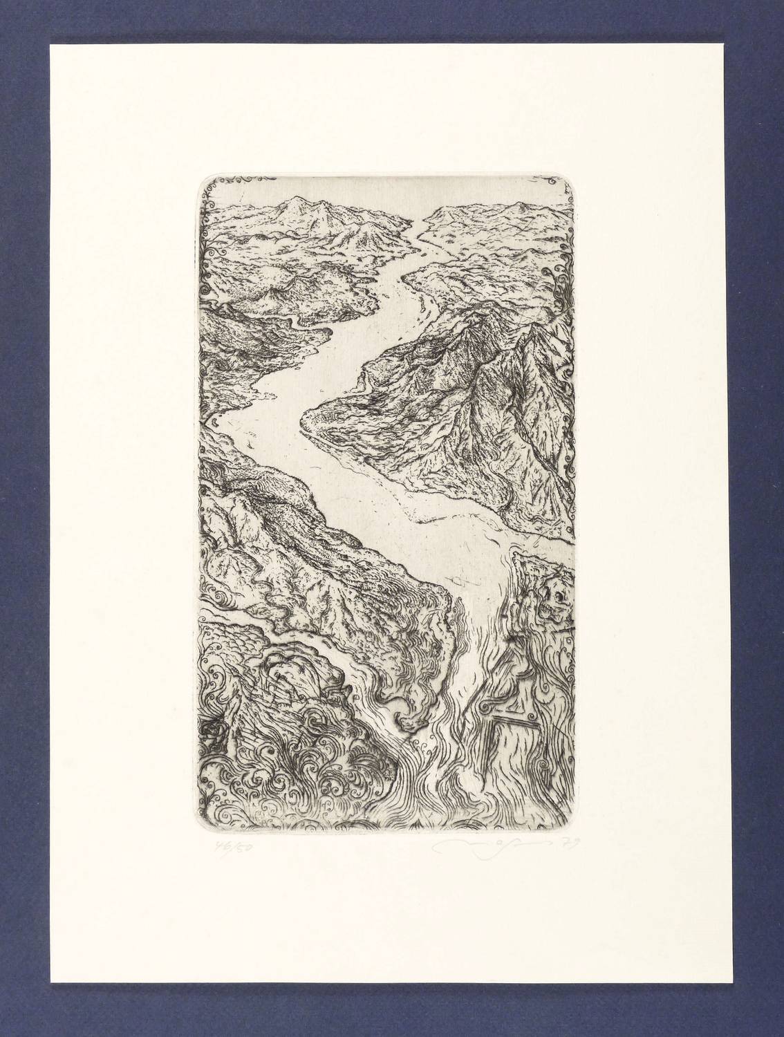 Rechts unten in Bleistift signiert und datiert. Links Auflagenbezeichnung. – Im unteren Blatt in die Landschaftsformationen eingeschrieben der Kopf eines bärtigen Mannes sowie ein Totenkopf. – Minimale Lagerspuren. Insgesamt noch sehr gut erhalten.