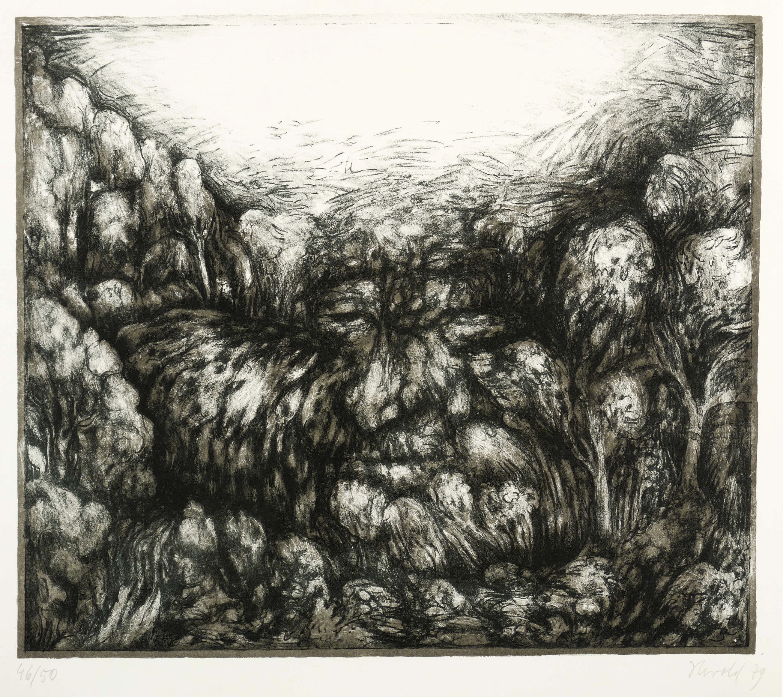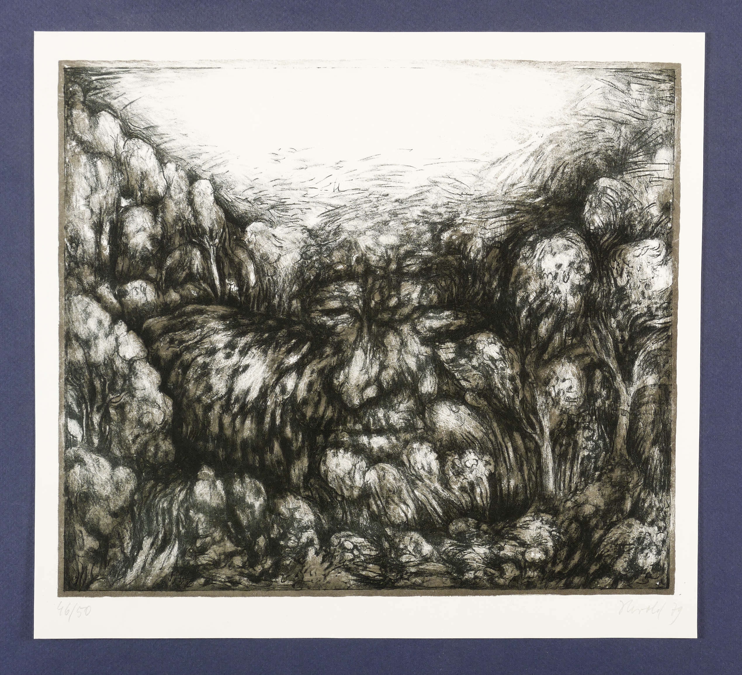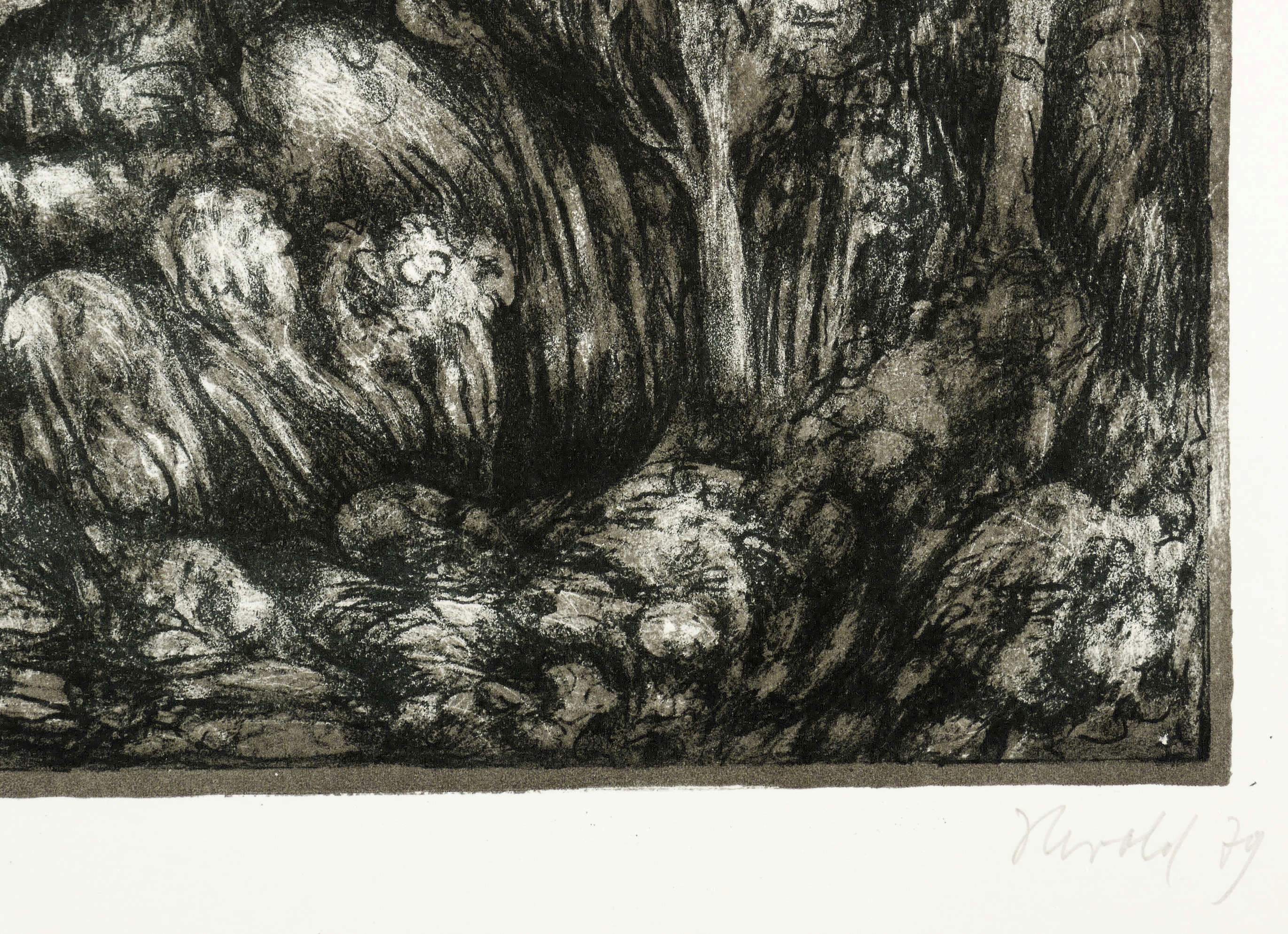 1979. Farblithografie / Kreidelithografie, in 2 Farben, auf glattem weißem Karton. – Originale Künstlergrafik, von Rainer Herold. – Auflage Exemplar Nr. 46/50. – 26,3 x 30,3 cm (Darstellung / Druckbild), 29,7 x 32,6 cm (Blatt).