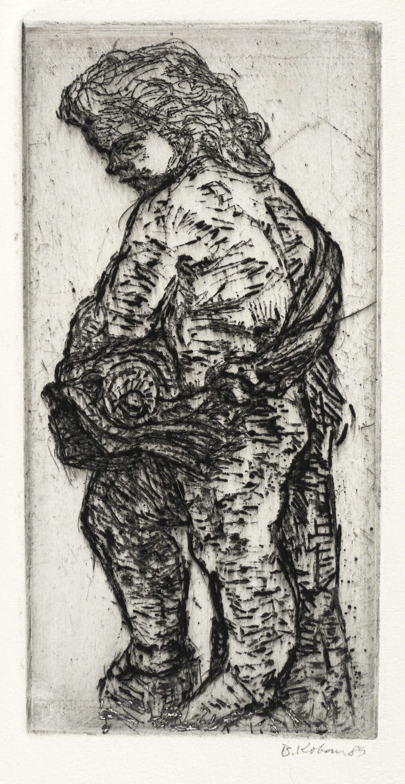 1989. Radierung / Strichätzung, in Schwarz, auf Büttenkarton. – Originale Künstlergrafik, von Bernhard Koban. – 16,6 x 8,2 cm (Darstellung / Platte), 21,5 x 14 cm (Blatt).