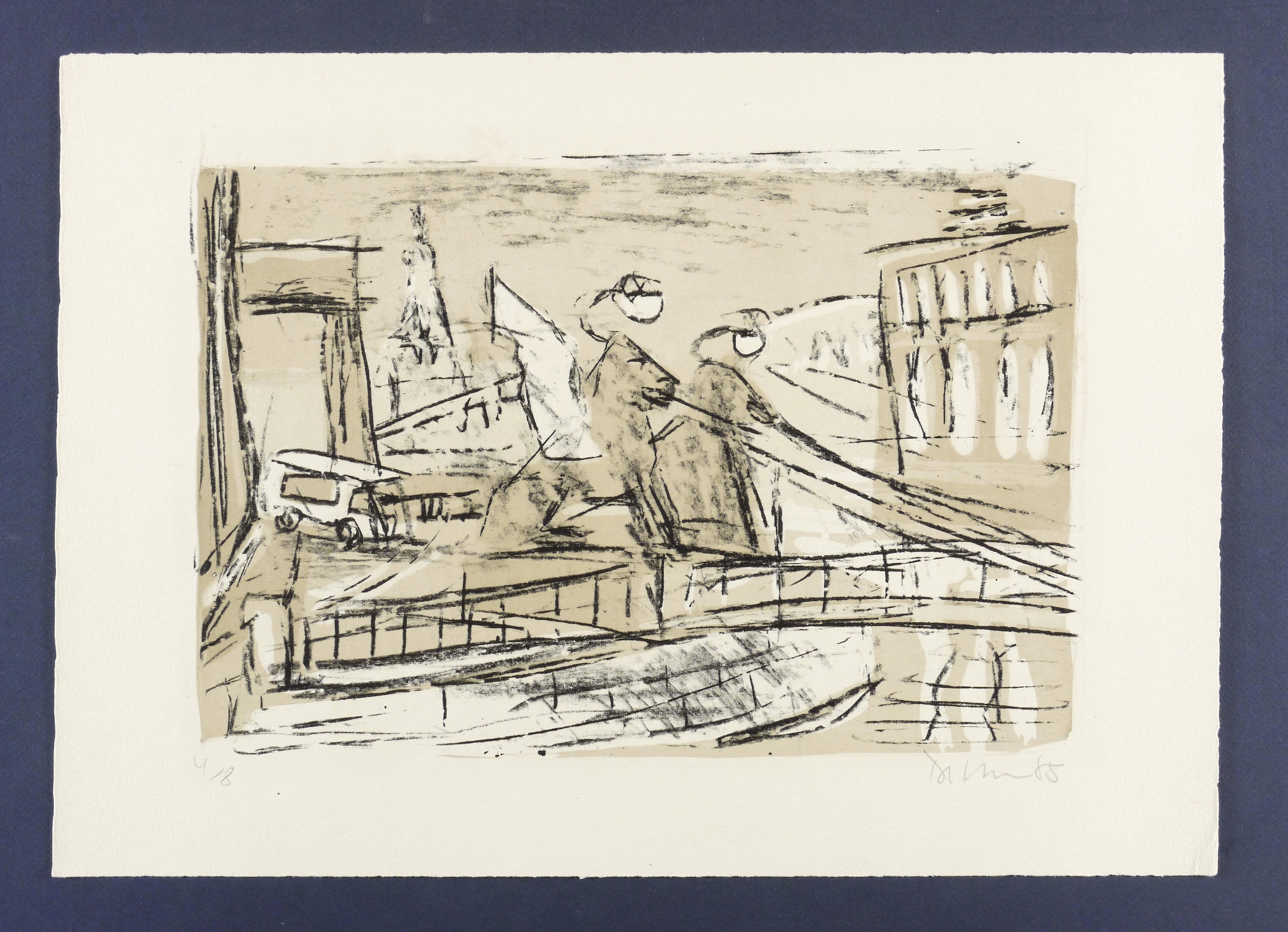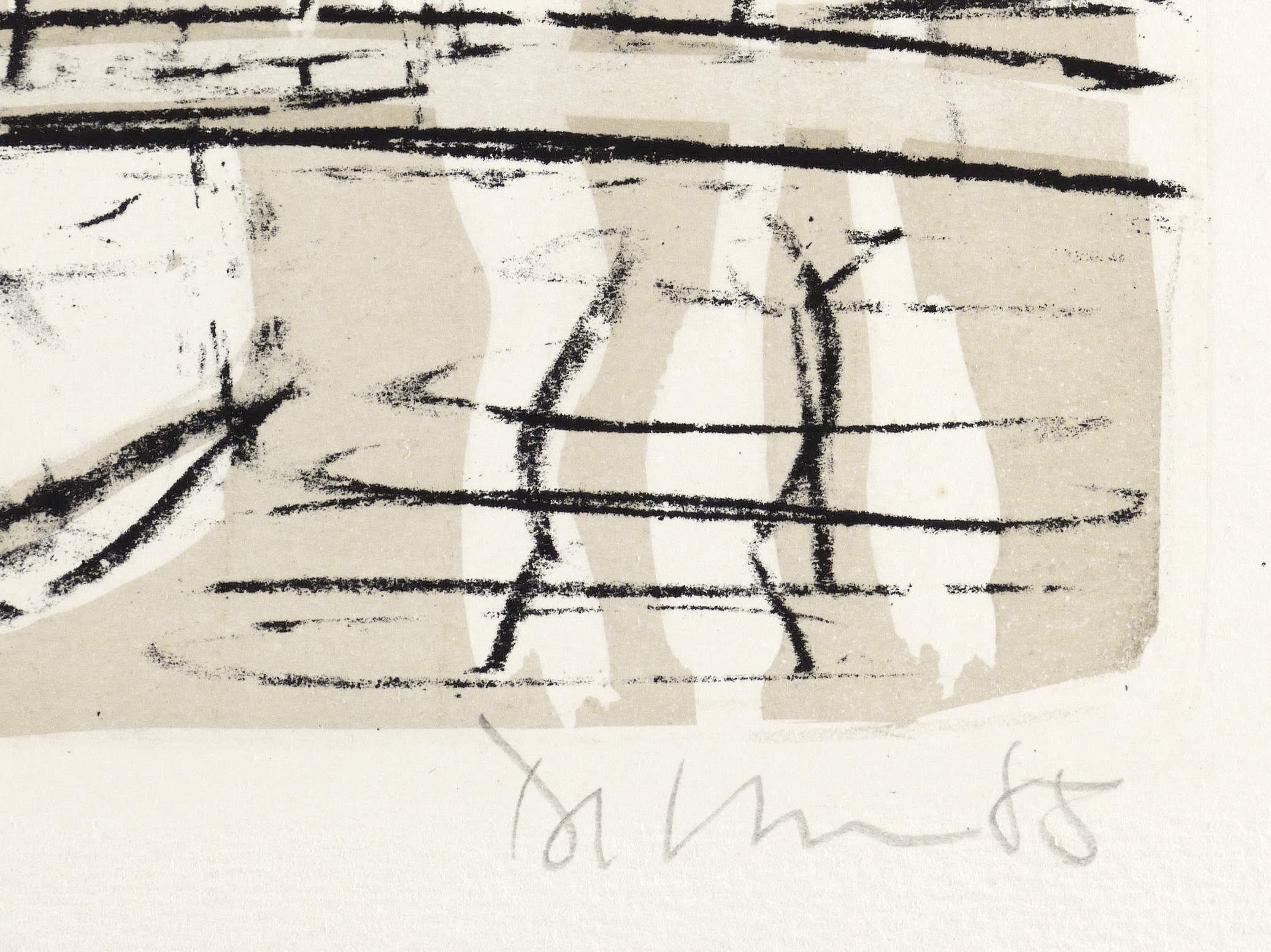 1985. Farblithografie / Pinsel- & Kreidelithografie, in Hellgrau, Ocker & Schwarz, auf Karton. – Von Peter Dettmann. – Auflage Exemplar Nr. 4/8. – 25,6 x 37,6 cm (Darstellung), 35 x 49 cm (Blatt).