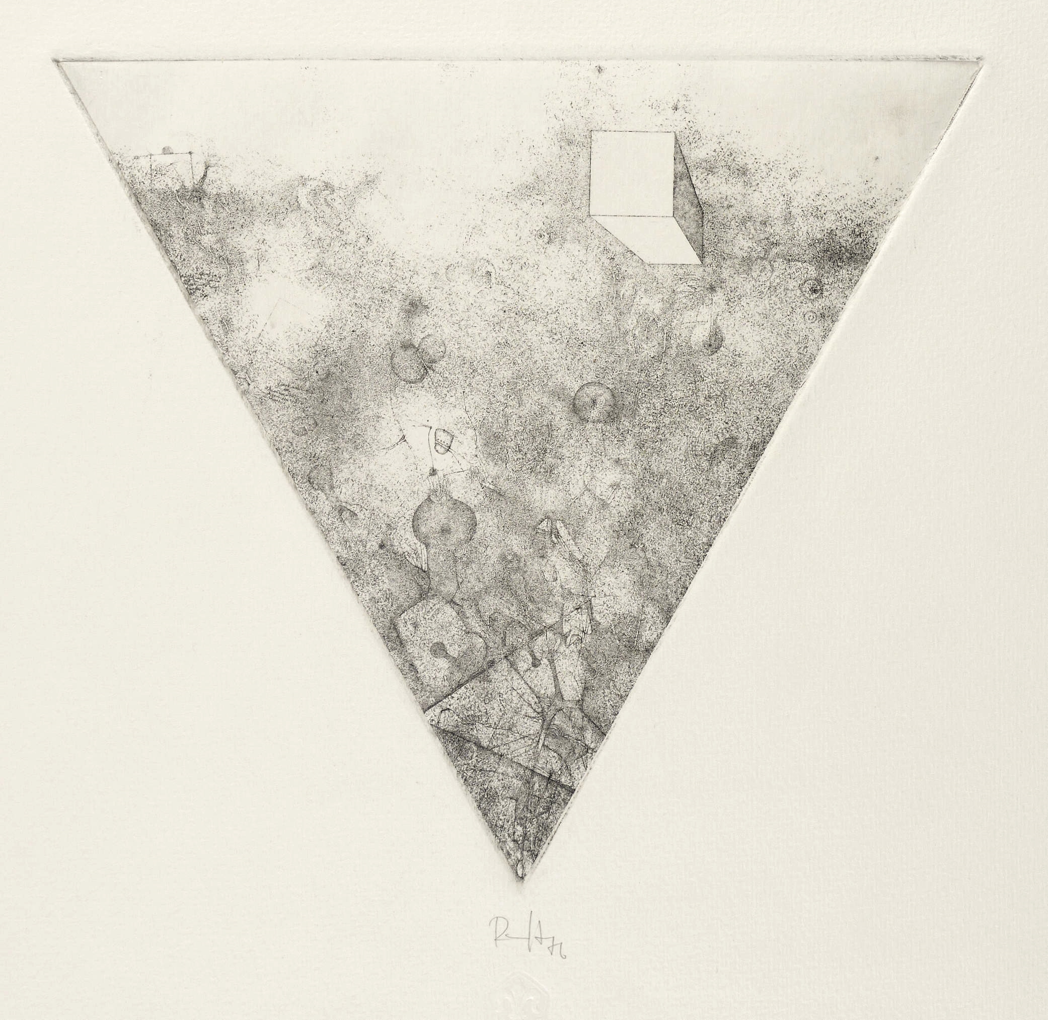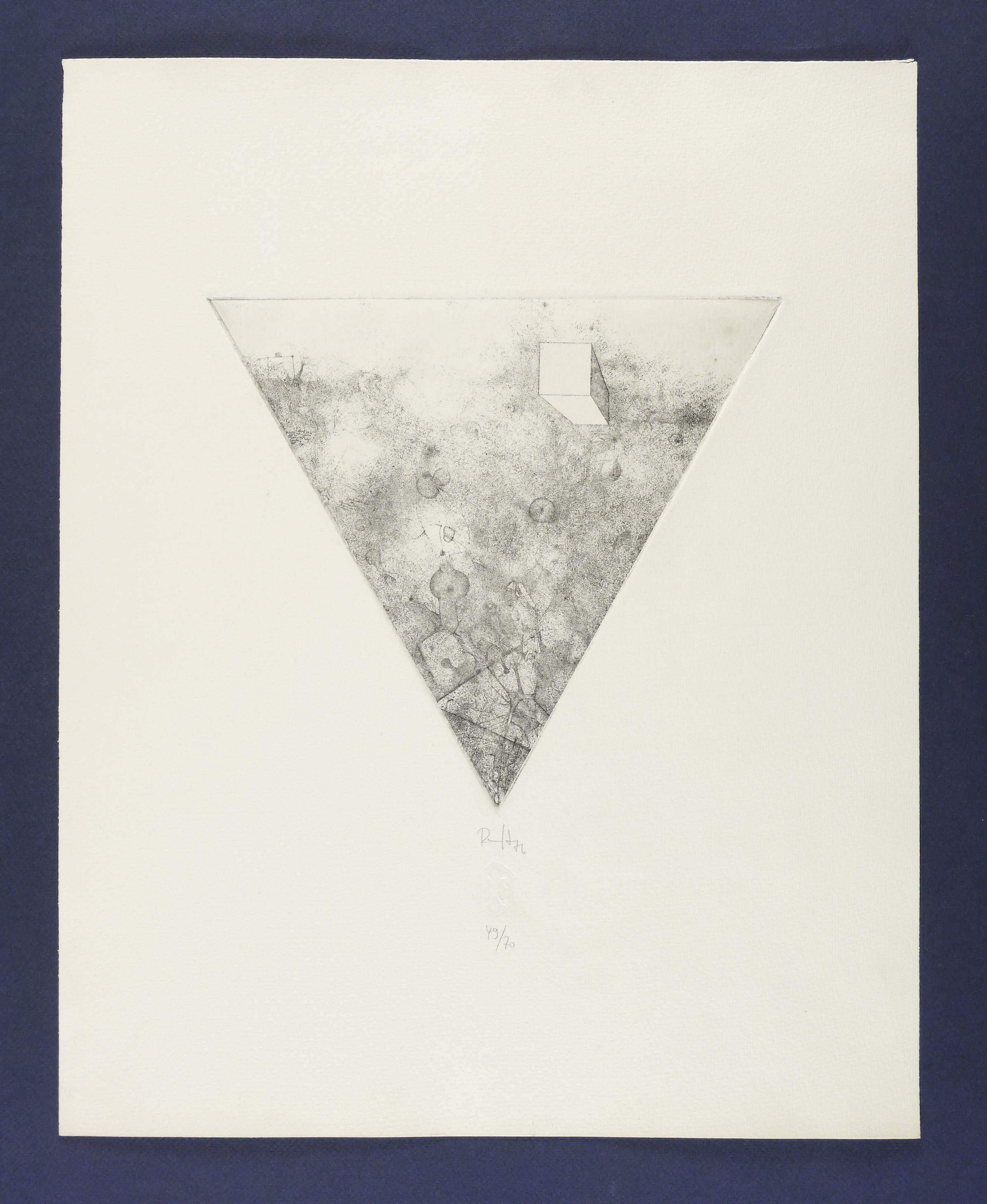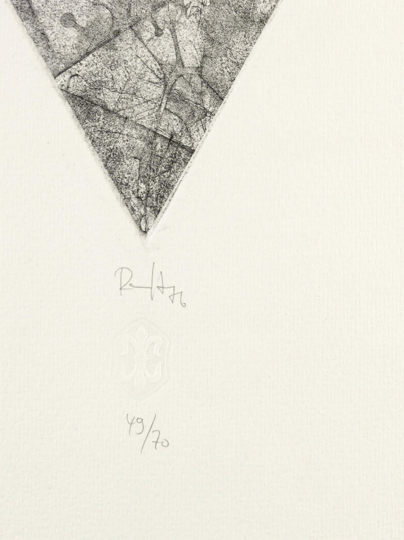 1976. Radierung / Strichätzung & Punzenstich, in Schwarz, auf hartem hellgelbem Karton. – Originale Künstlergrafik, von Thomas Ranft. – Auflage Exemplar Nr. 49/70. – 23,0 x 26,0 cm (Darstellung / Platte), 48,5 x 39 cm (Blatt).