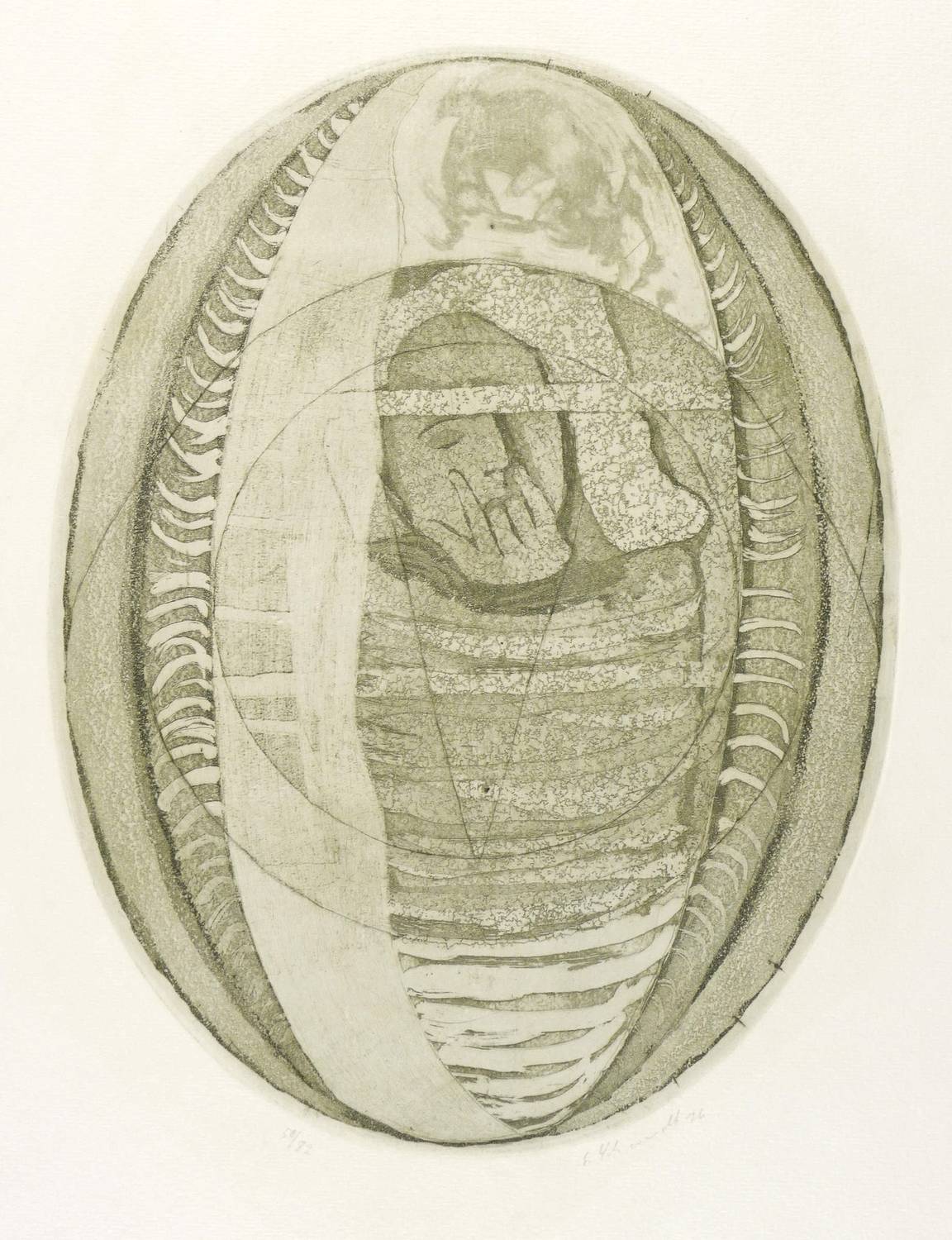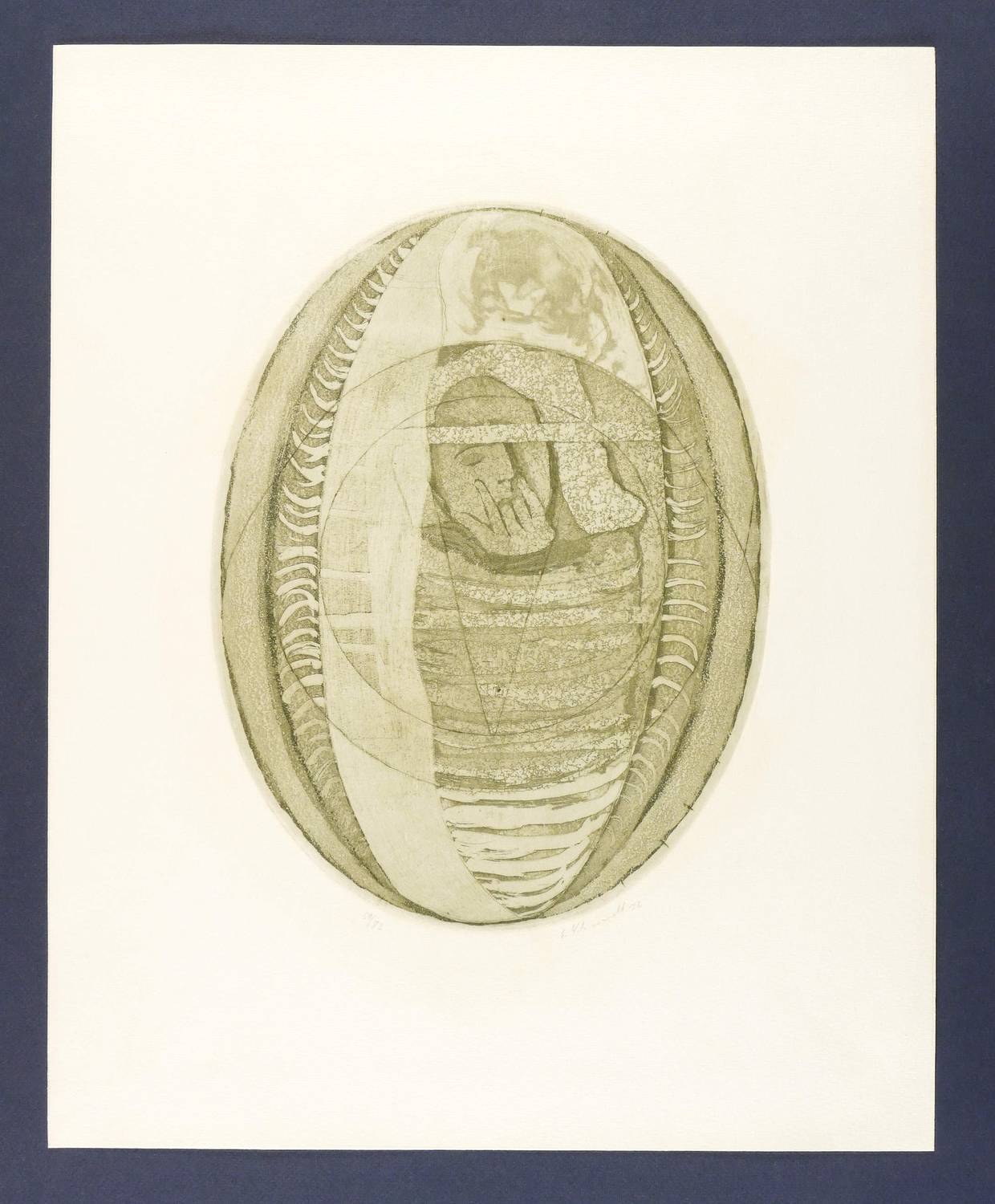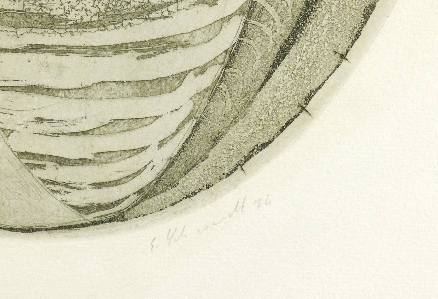 1976. Rdierung / Aquatinta & Strichätzung, in Schiefergrün, auf hartem gelblichem Karton. – Originale Künstlergrafik, von Eckard Robert Schwandt. – Auflage Exemplar Nr. 50/82. – 32,1 x 24,7 cm (Darstellung / Oval), 49 x 39 cm (Blatt).