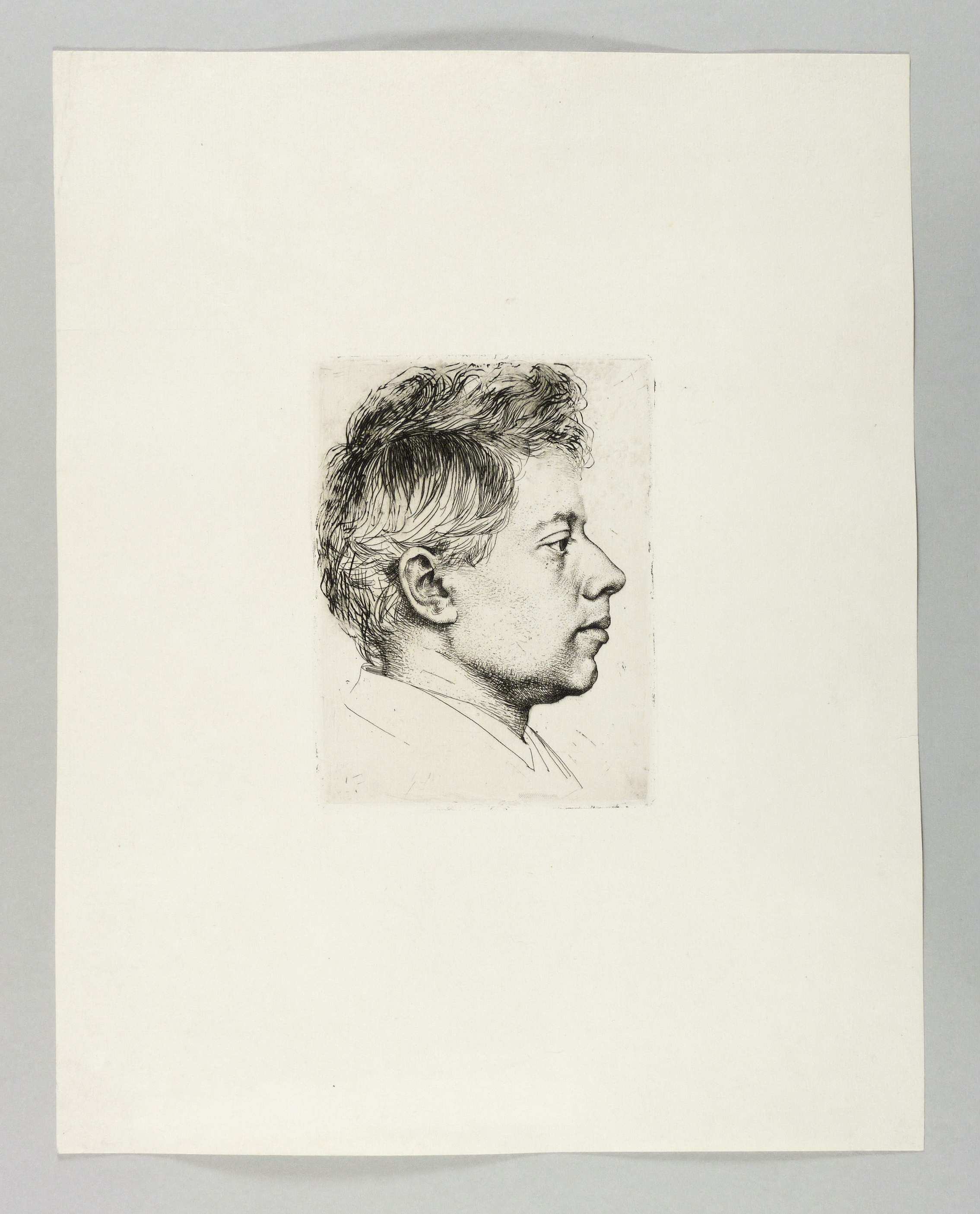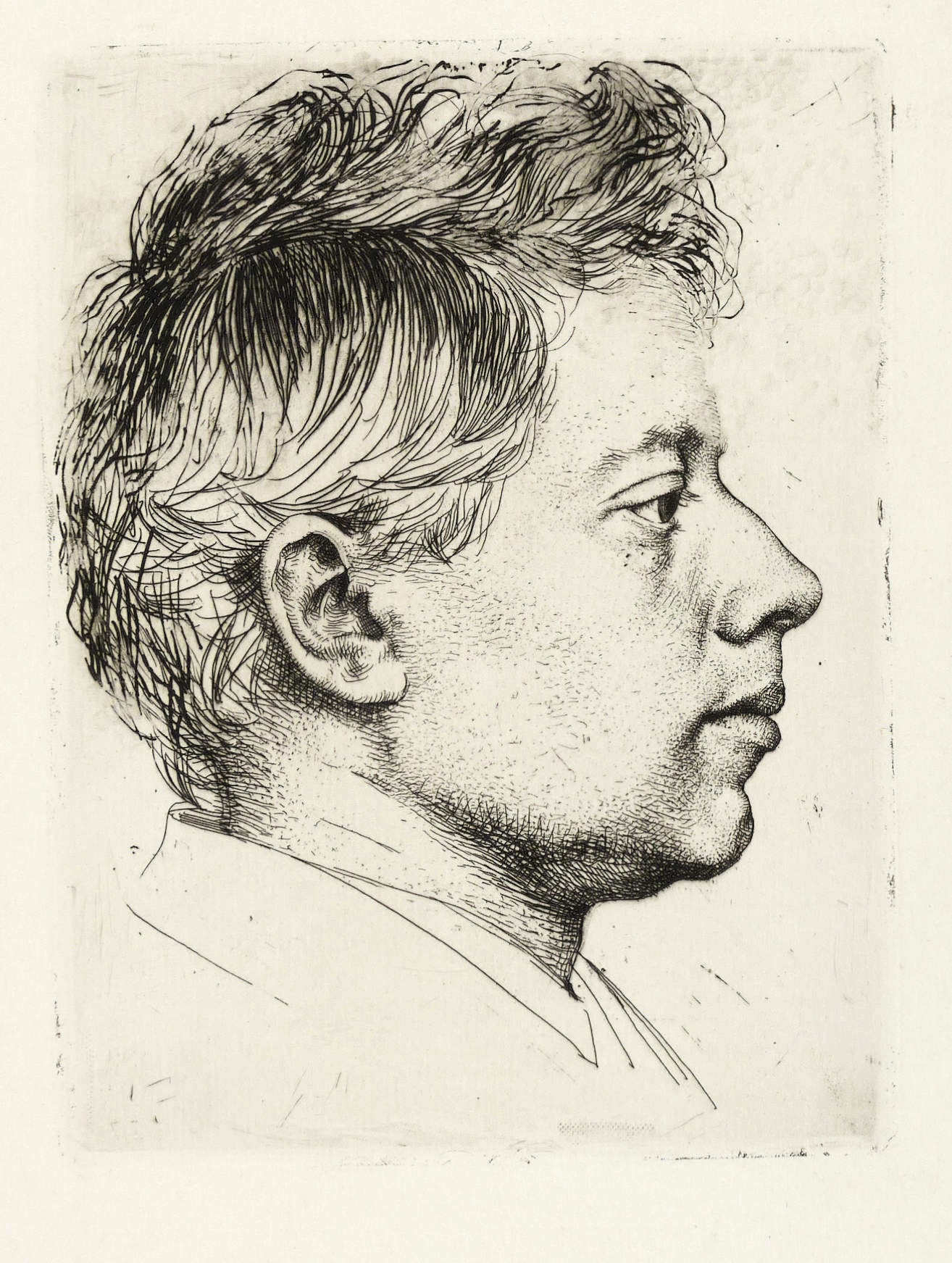 1886/1887. Radierung / Strichätzung & Kaltnadel, in Schwarz, auf gelbem Büttenpapier. – Originale Künstlergrafik, von Karl Stauffer-Bern. – 19,8 x 14,9 cm (Darstellung / Platte), 48 x 38 cm (Blatt).