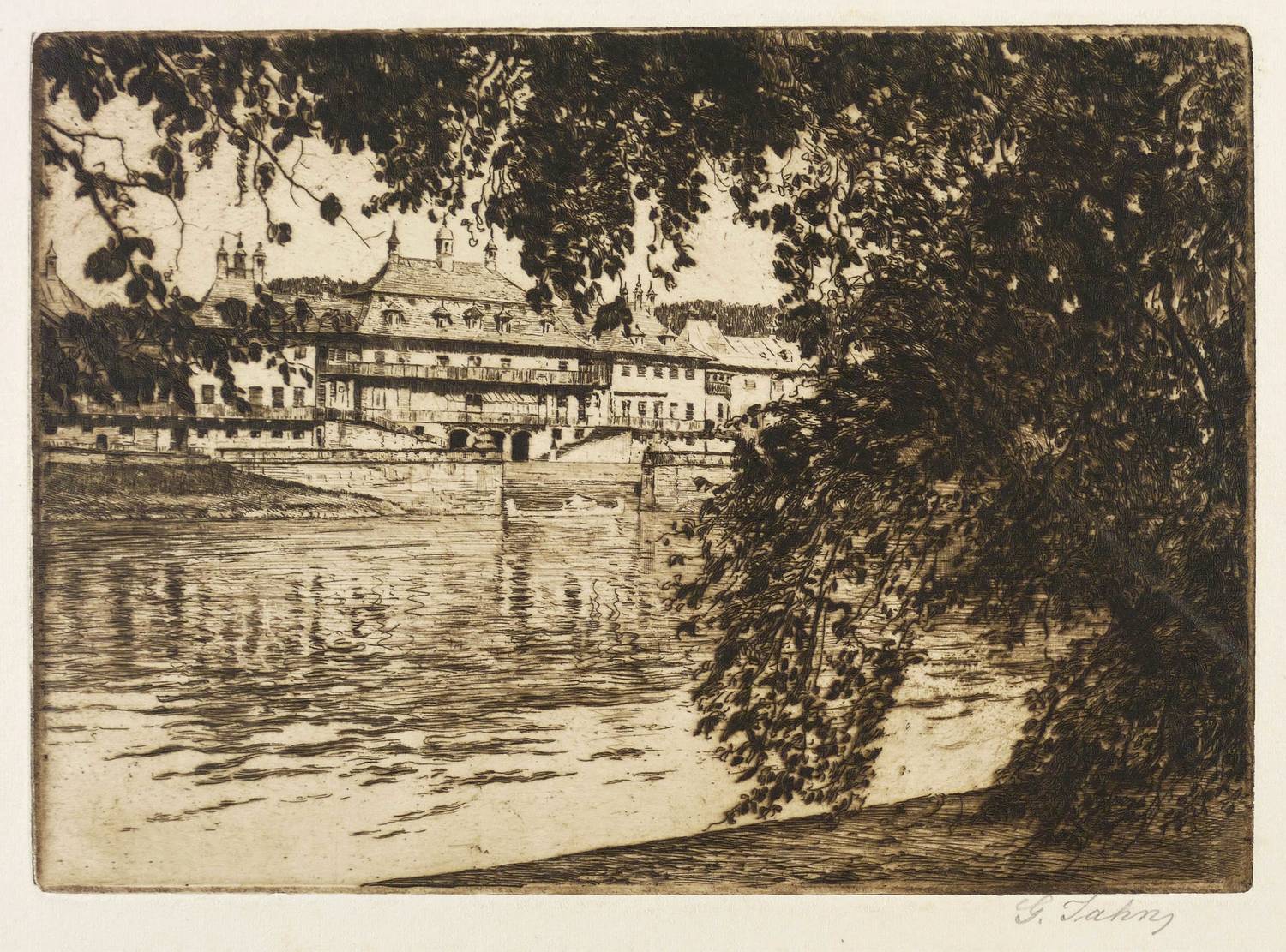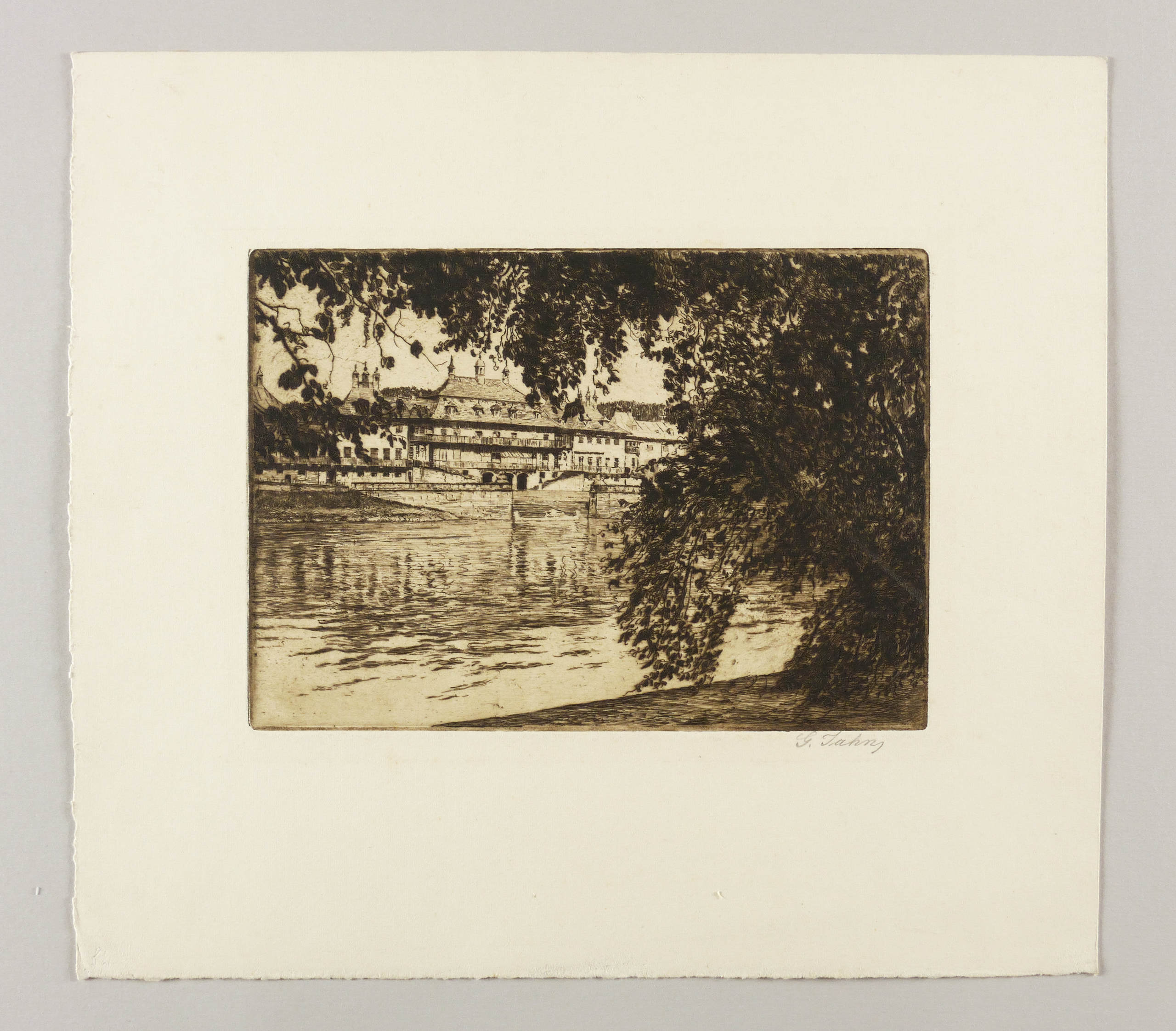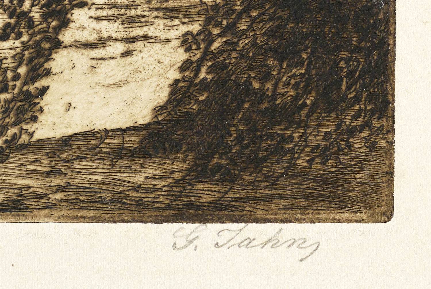 Um 1920. Radierung / Strichätzung, mit Plattenton, in Schwarzbraun, auf Kupferdruckkarton. – Originale Künstlergrafik, von Georg Jahn. – 16,5 x 23,2 cm (Darstellung / Platte), 32 x 36 cm (Blatt).