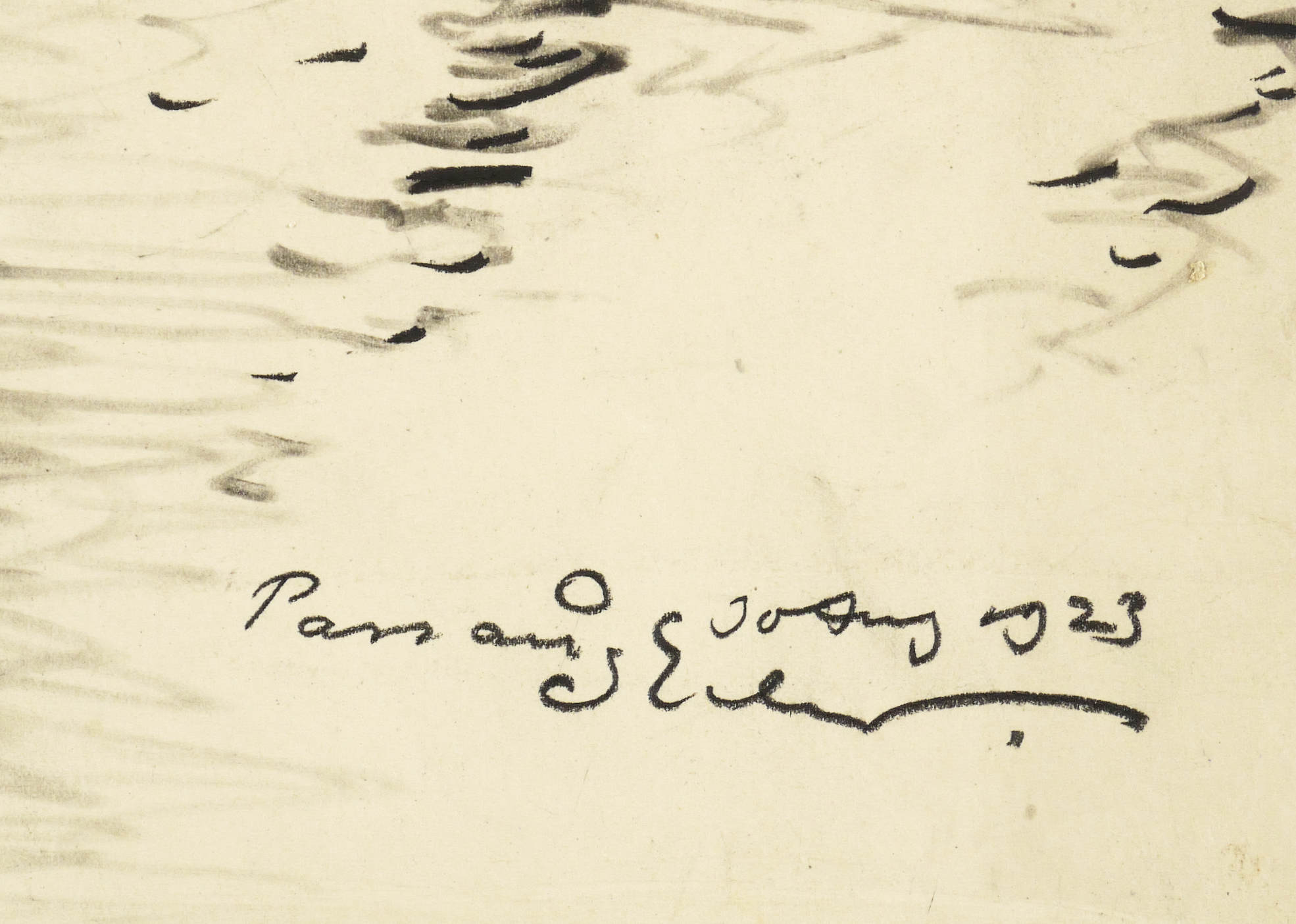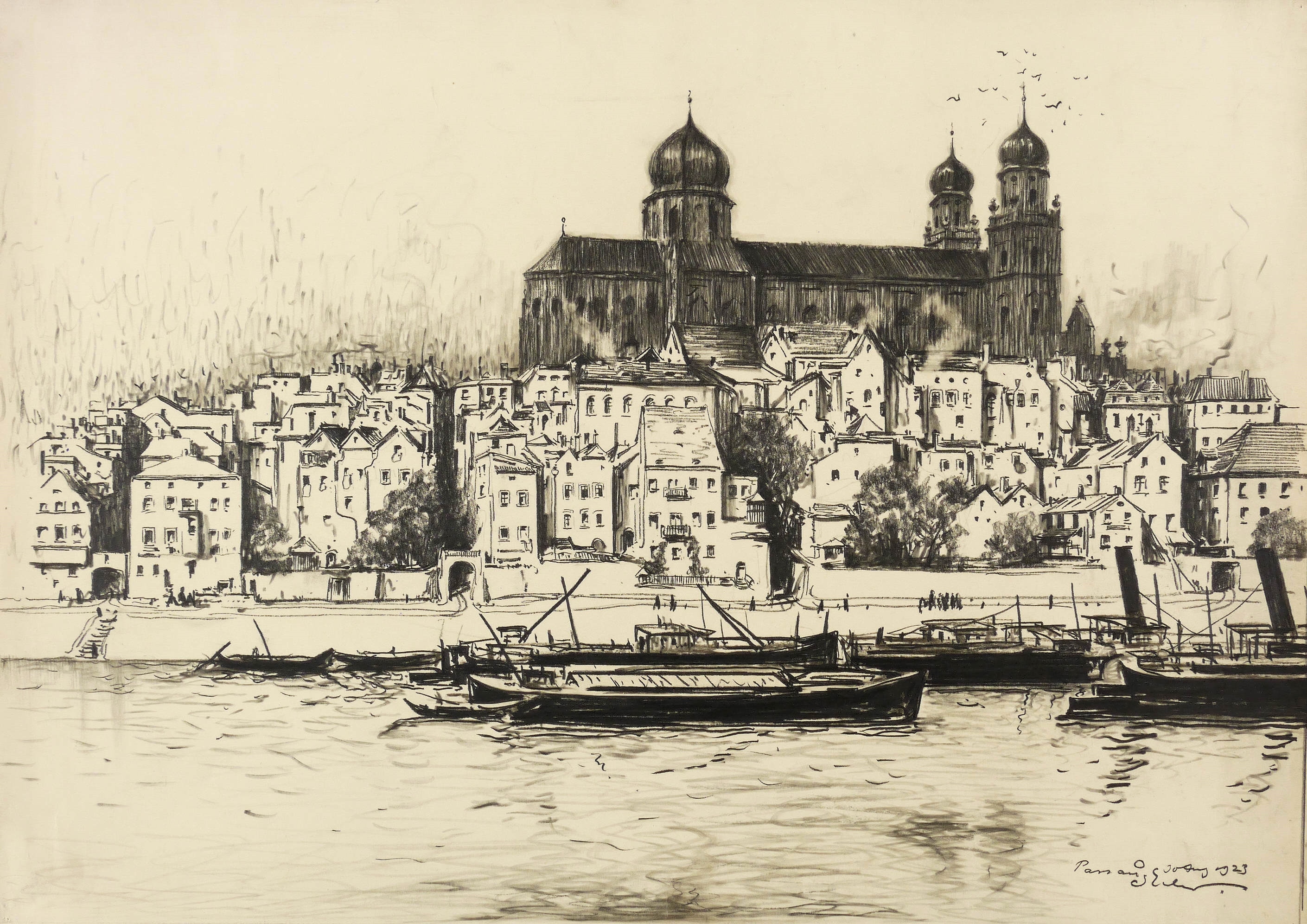 Rechts unten in Bleistift signiert und datiert: ″1923 / G. Erler″ Direkt davor bezeichnet: ″Passau″. – Ursprünglich mit vollem Rand erhalten. In den Blattecken originale Reißzwecklöchlein vom Werkprozess. Rückseitig leichte Montagespuren. Im unteren Rand unscheinbare Knickspuren. Insgesamt guter bis sehr guter Zustand.